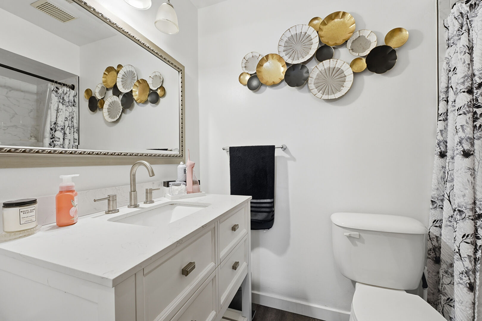 Drywall, Full Bathroom, Vanity, Vent, Wood Finish Floor, Baseboards Wall