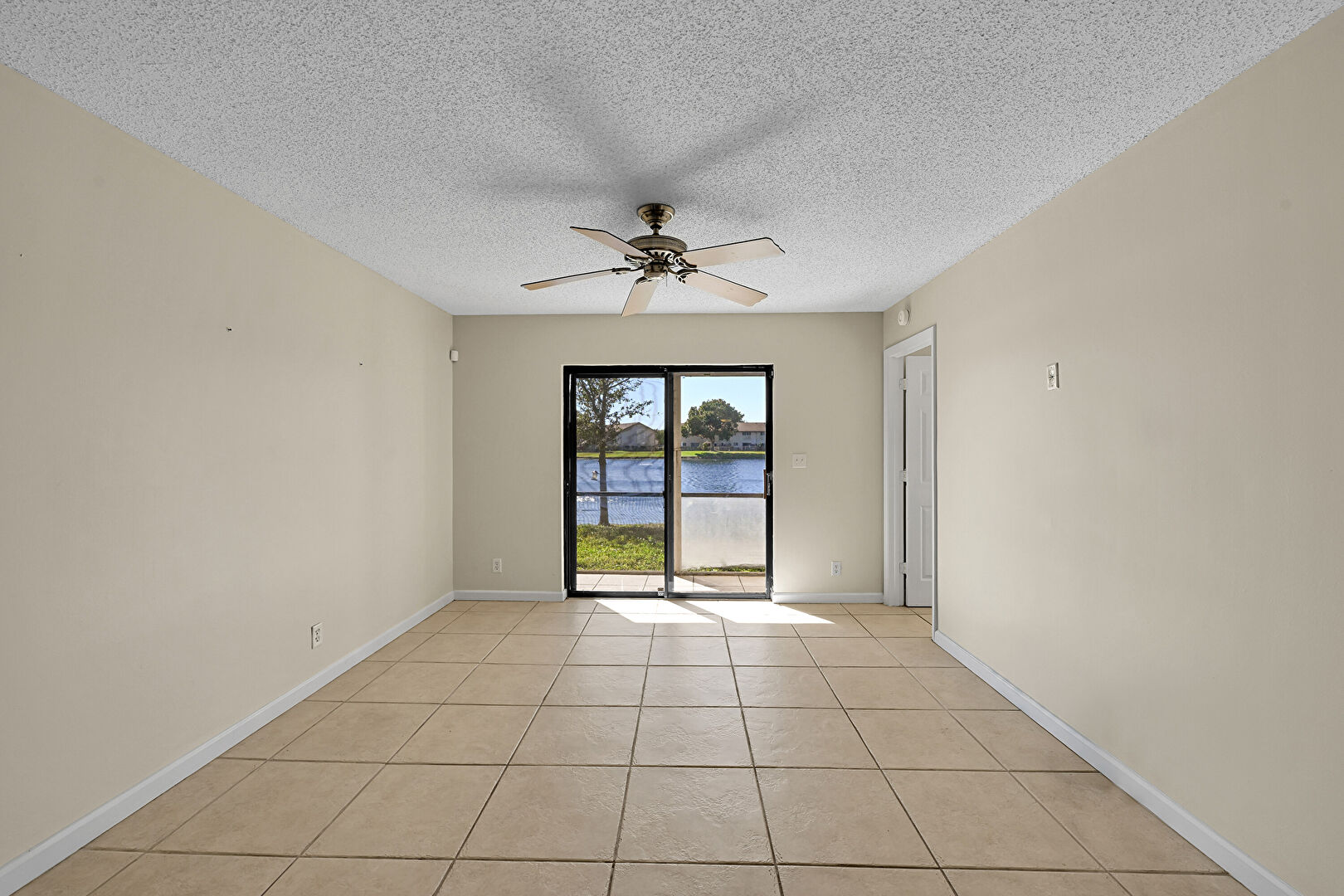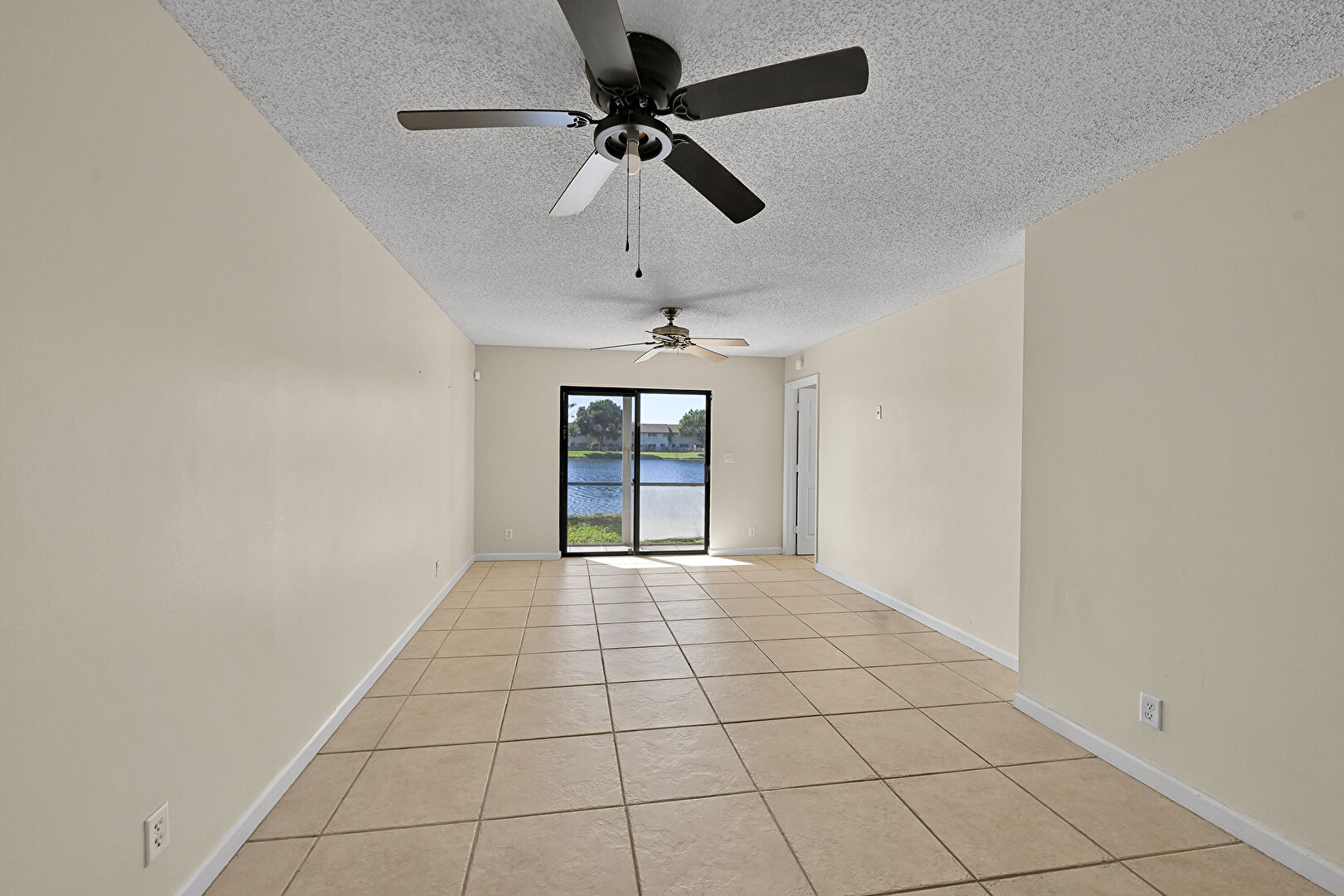 Baseboards Wall, Ceiling Fan, Drywall, Natural Light, Textured Ceiling, Tile Floor, Water View, Waterfront, Ceiling Fan, Drywall, Textured Ceiling