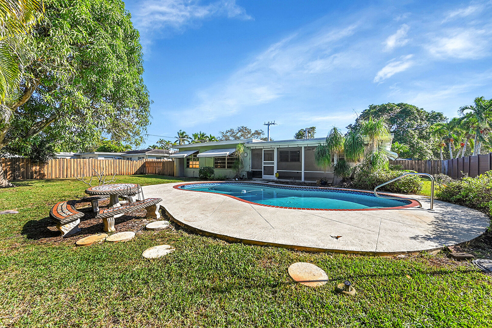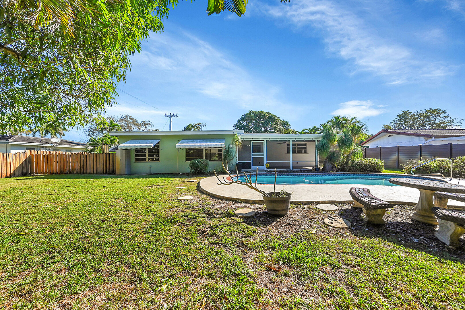 Awning, Fence, Handrail, Lawn, Patio, Pool, Stucco Siding, Sunroom, Fence, Lawn, Pool