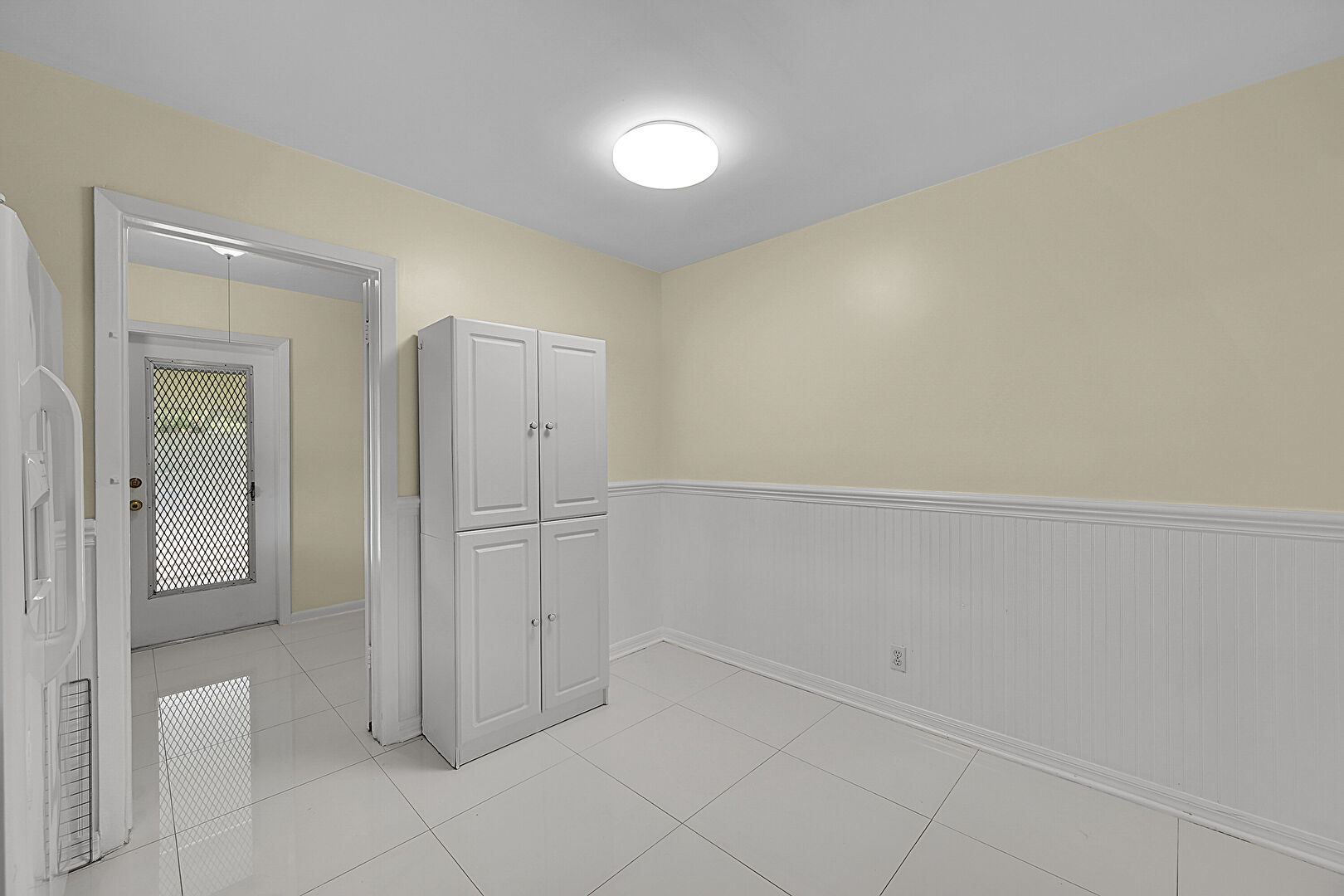Baseboards Wall, Drywall, Glass Insert Cabinets, Laundry, Medium Brown Cabinets, Natural Light, Raised Cabinets, Tile Floor, Vent, Wainscot Wall, Crown Molding Cabinets, Glass Insert Cabinets, Wainscot Wall