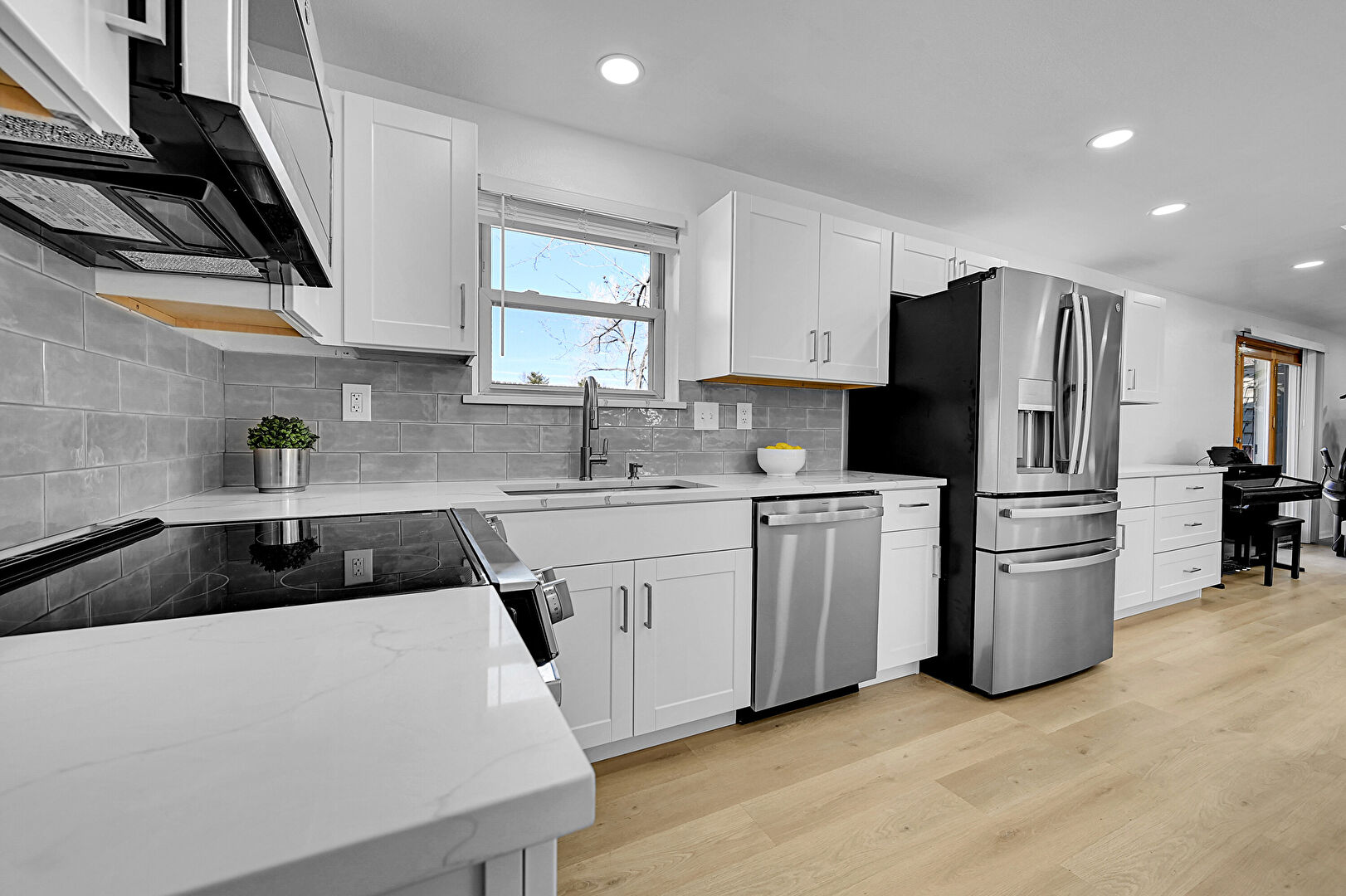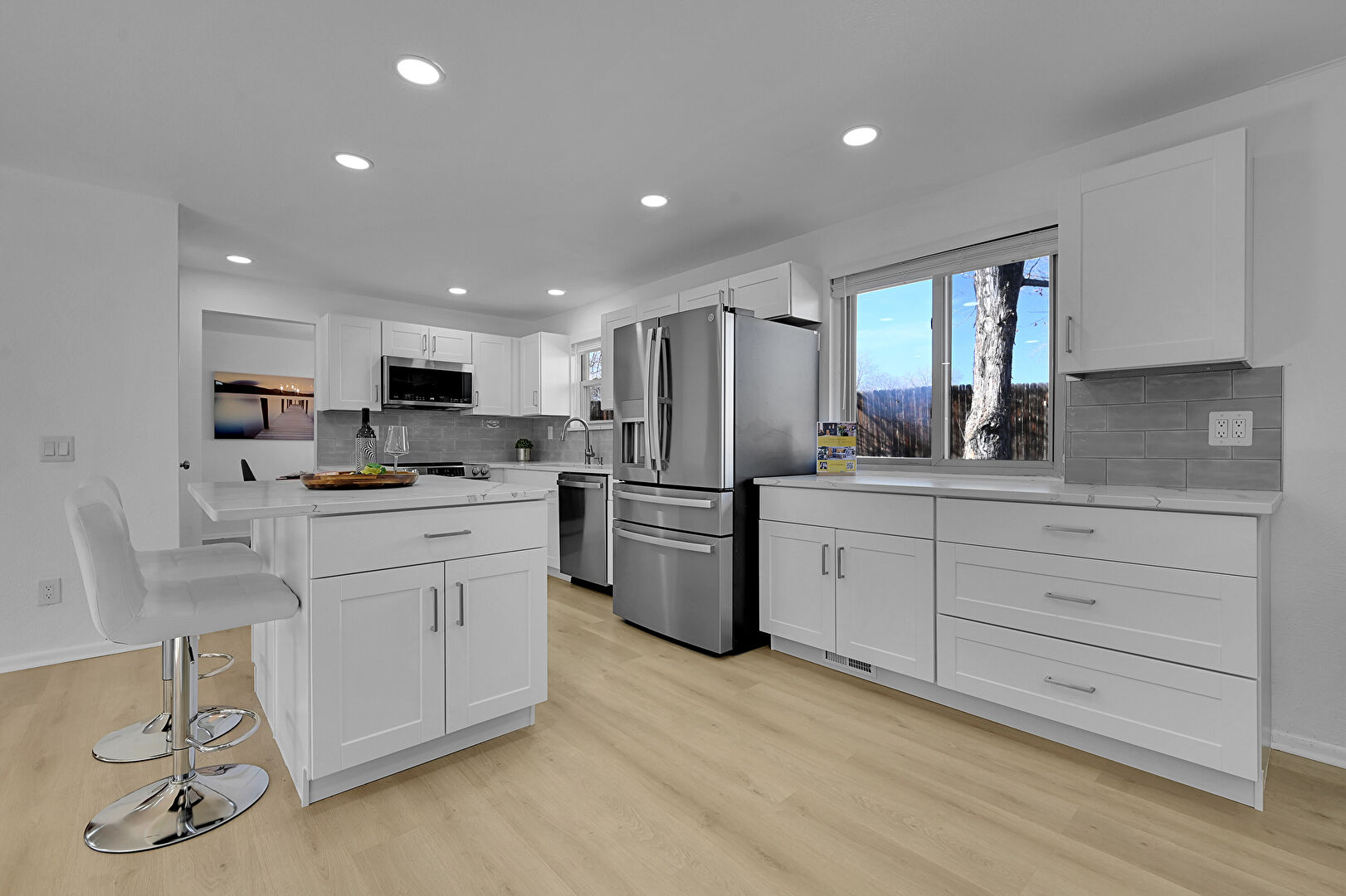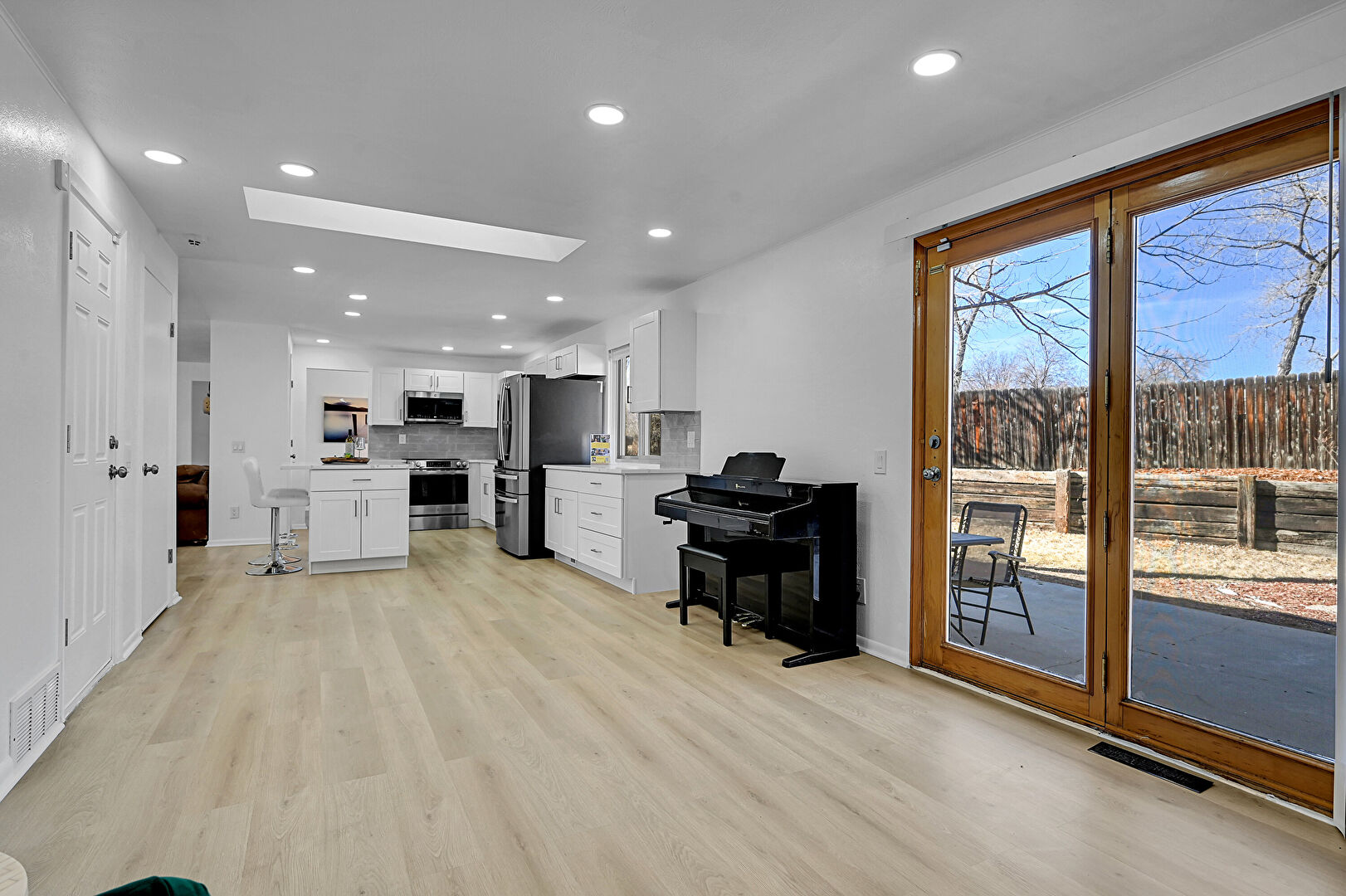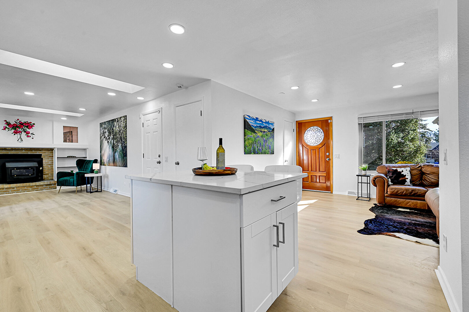 Baseboards Wall, Drywall, Fireplace, Kitchen Bar, Kitchen Island, L Shaped Kitchen, Natural Light, Opens To Living Area, Recessed Lighting, Shaker Cabinets, Skylight, Stone Countertops, Vent, Wood Finish Floor, Natural Light, Opens To Living Area, Recessed Lighting, Vent