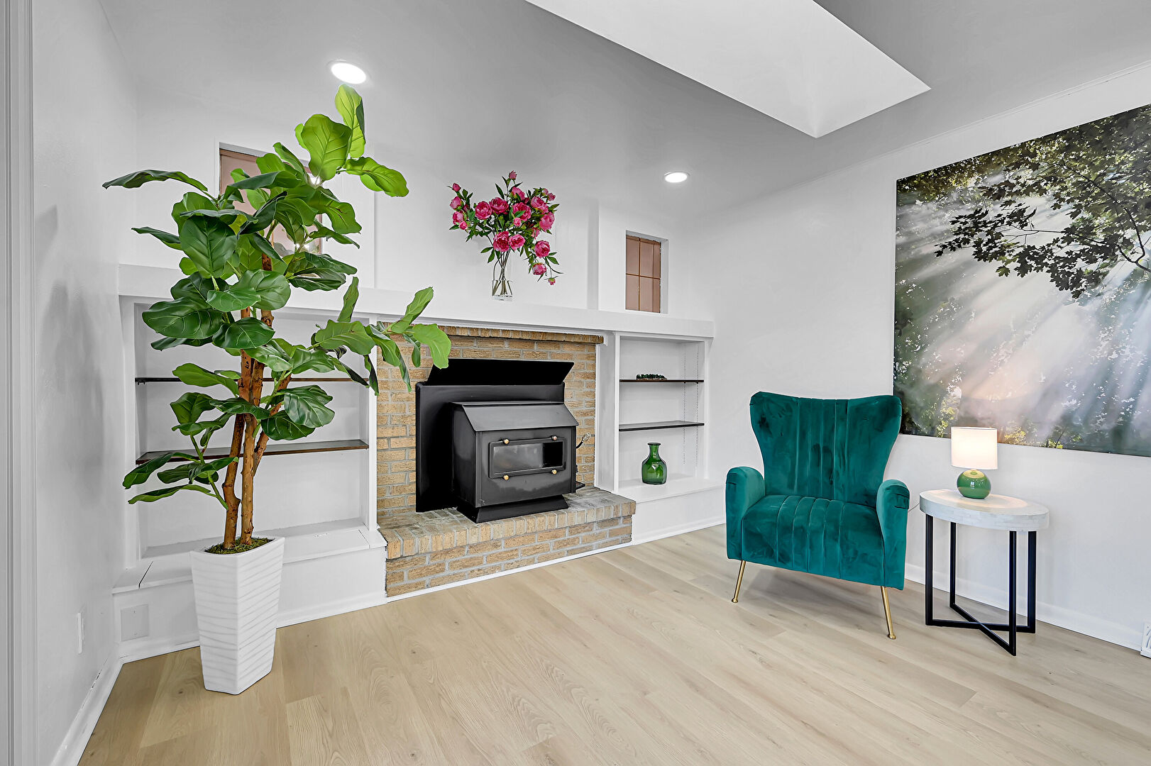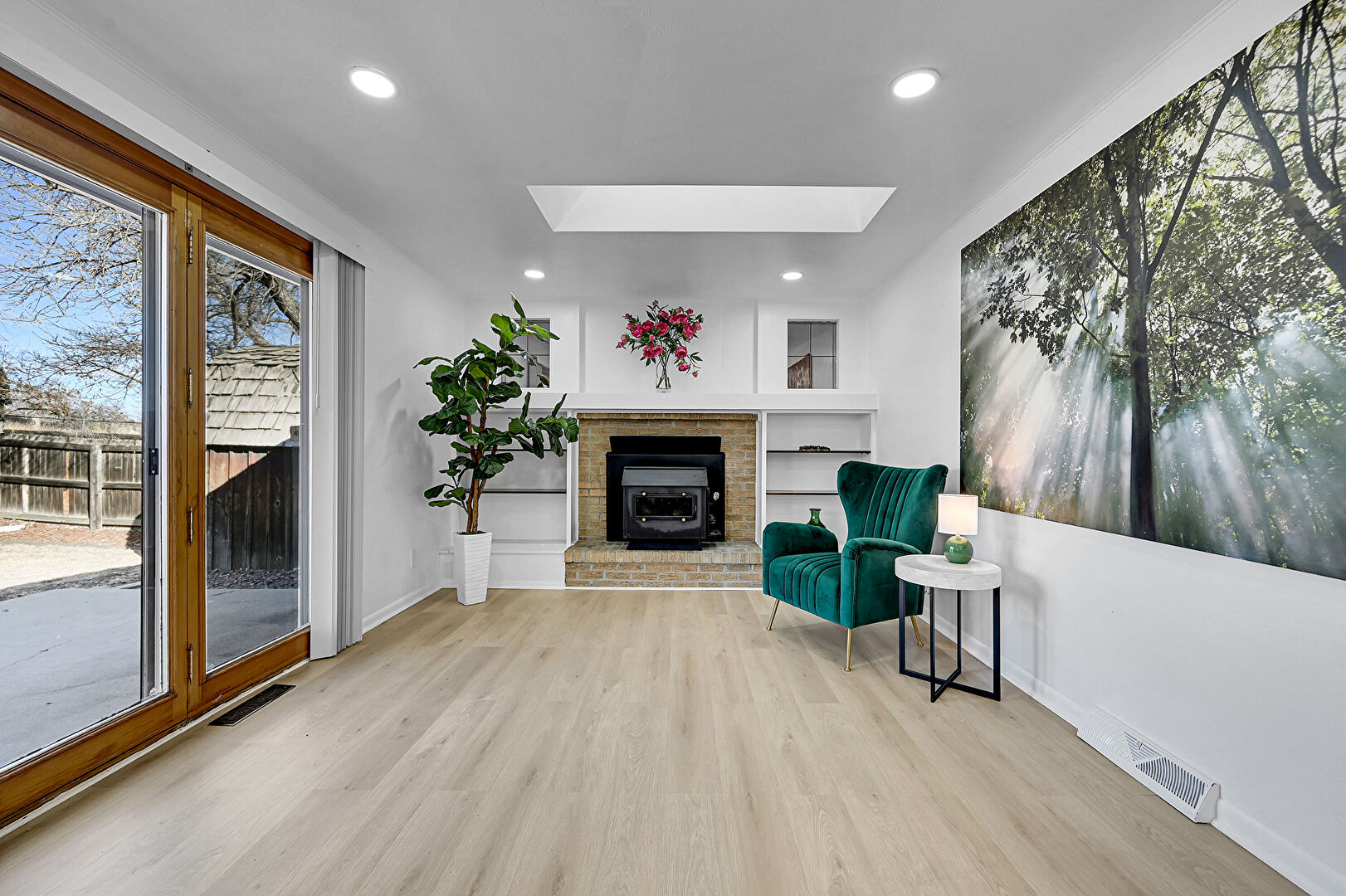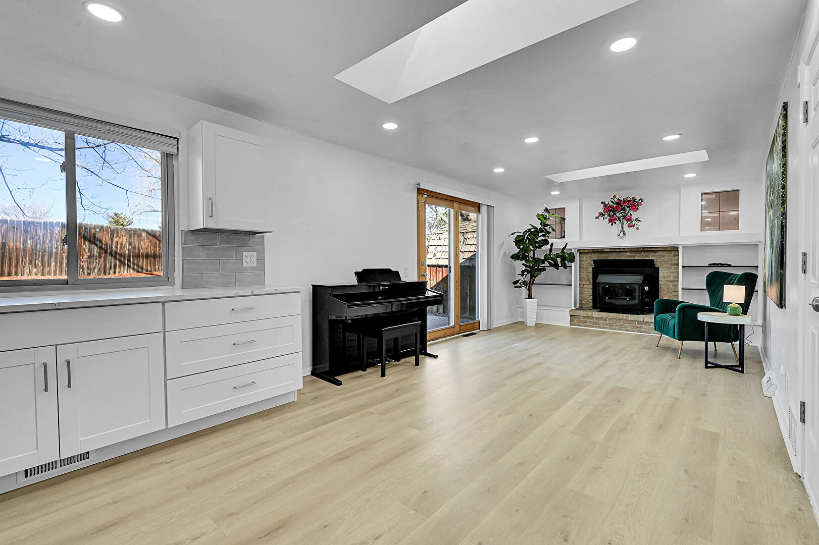 Baseboards Wall, Brick Siding, Built In Shelves, Drywall, Fireplace, Kitchen Bar, Kitchen Island, Kitchen Peninsula, L Shaped Kitchen, Natural Light, Patio, Recessed Lighting, Shaker Cabinets, Skylight, Vent, Wood Finish Floor, Wood Stove, Drywall, Fireplace, Opens To Living Area, Outdoor Dining Area, Recessed Lighting, Wood Finish Floor