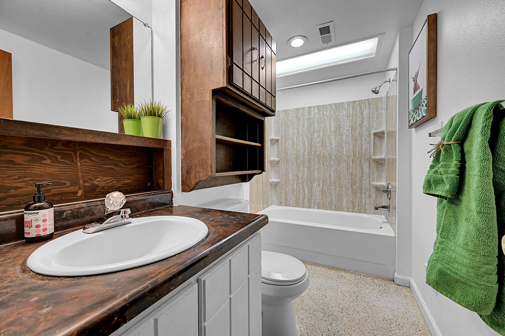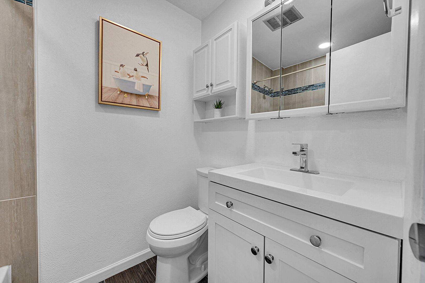 Aggregate Floor, Baseboards Wall, Combined Bath Shower, Drywall, Full Bathroom, Recessed Lighting, Textured Wall, Vanity, Vent, Wood Finish Floor, Baseboards Wall, Vent