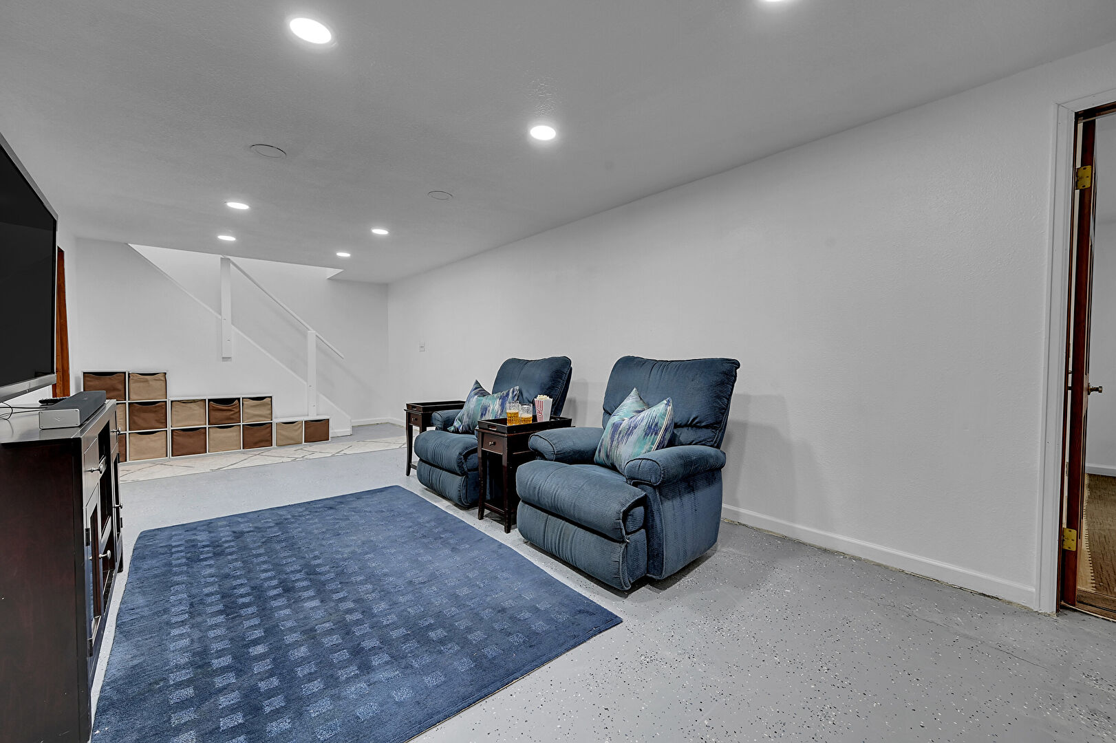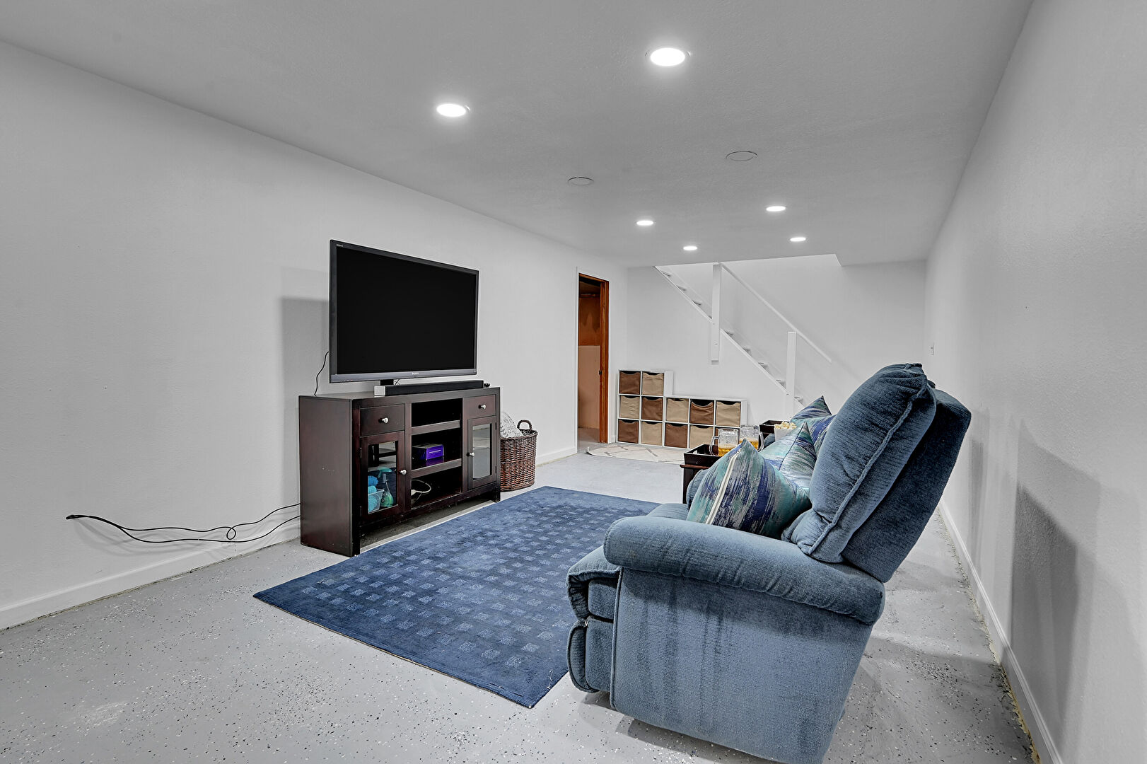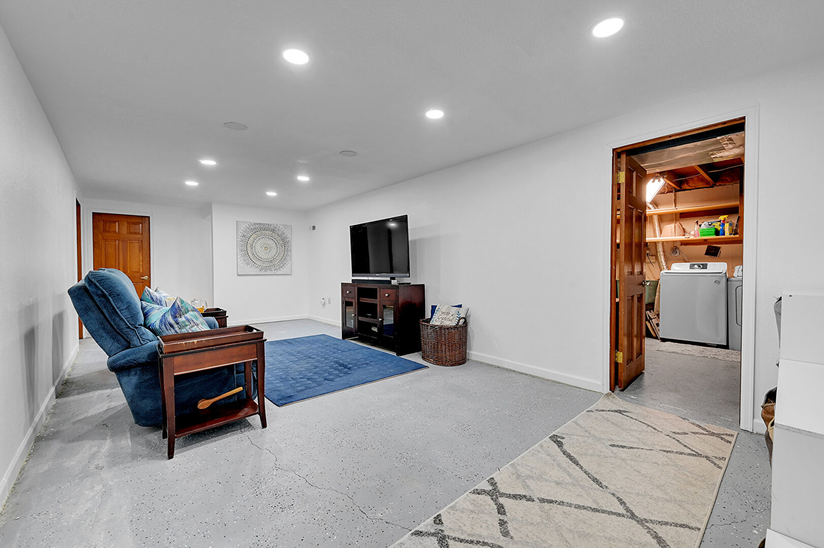 Baseboards Wall, Basement, Concrete Floor, Drywall, Recessed Lighting, Stairs, Baseboards Wall, Laundry, Recessed Lighting, Stairs
