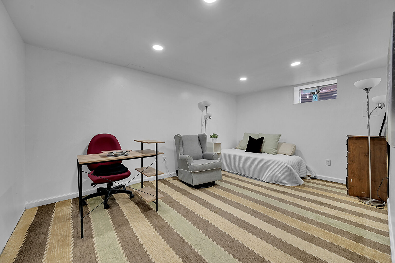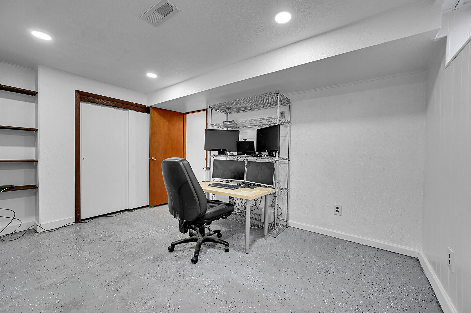 Basement, Concrete Floor, Drywall, Office Area, Recessed Lighting, Vent, Baseboards Wall