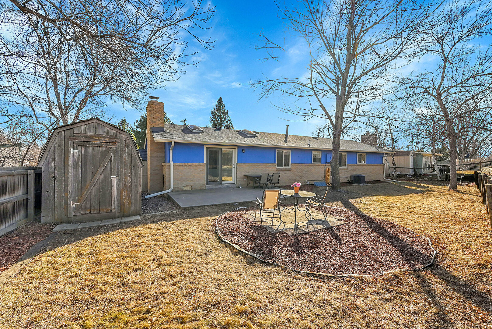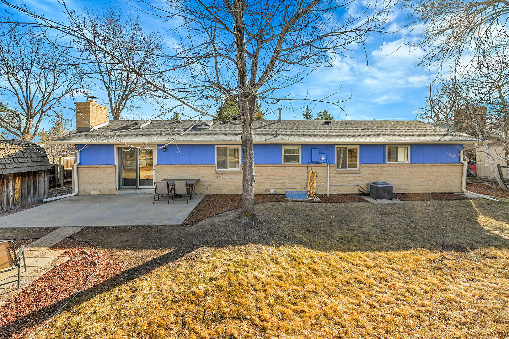 Brick Siding, Central Ac, Chimney, Downspout, Fence, Gutters, Lawn, Outdoor Structure, Patio, Shed, Shingle Roof, Chimney, Downspout, Shingle Roof