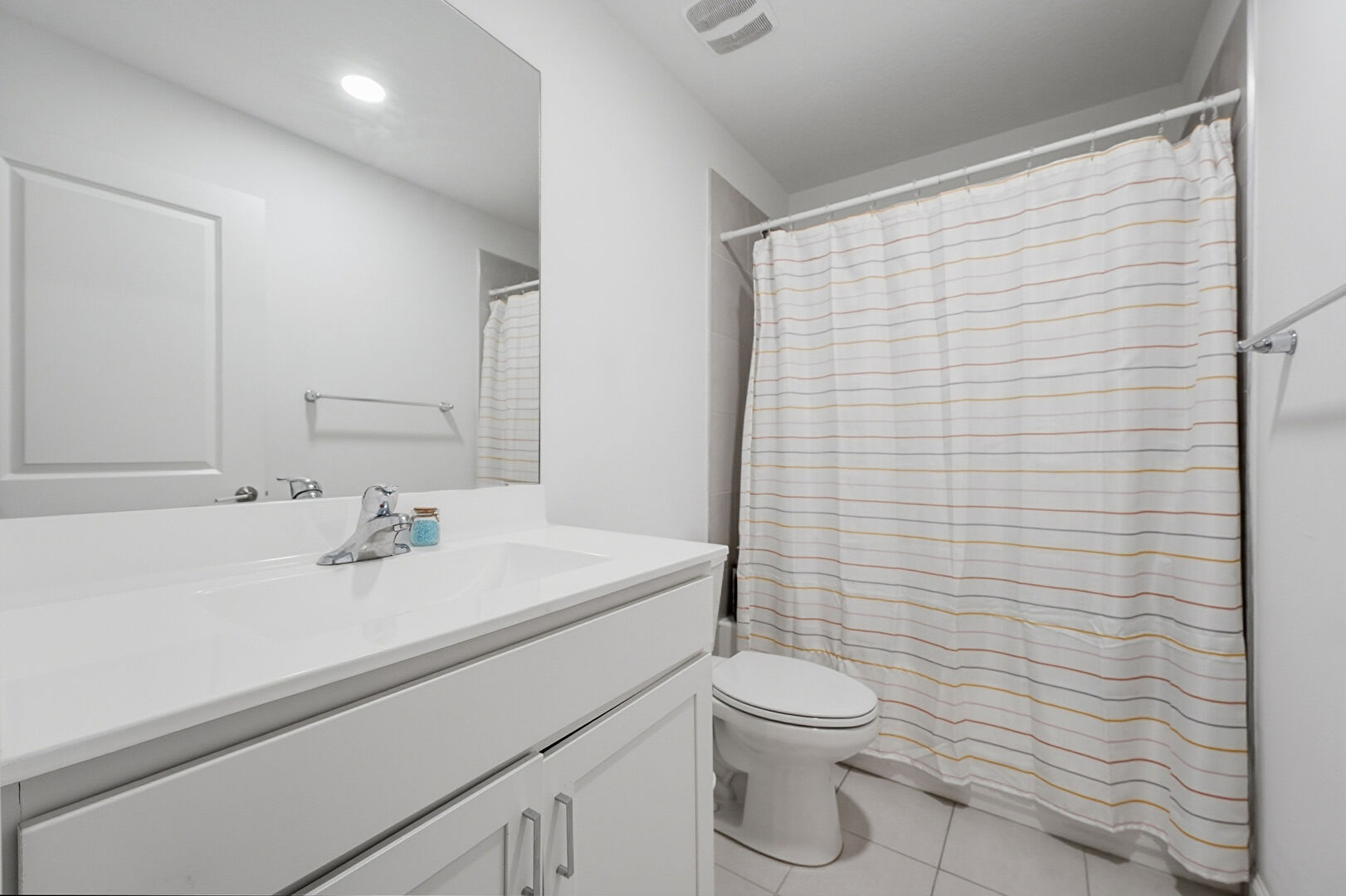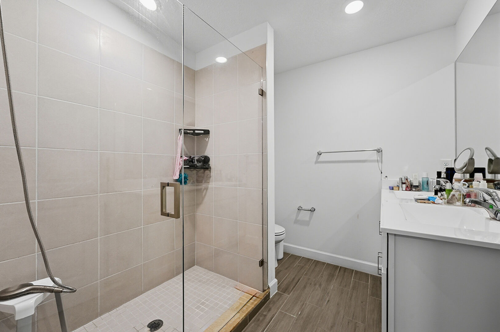 Baseboards Wall, Drywall, Full Bathroom, Recessed Lighting, Tile Floor, Vanity, Vent, Wood Finish Floor, Drywall, Recessed Lighting, Vanity