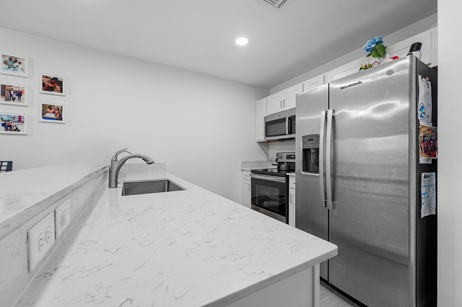 Baseboards Wall, Drywall, Galley Kitchen, Kitchen Bar, Kitchen Peninsula, Natural Light, Opens To Living Area, Recessed Lighting, Shaker Cabinets, Smoke Carbon Monoxide Detector, Stone Countertops, Vent, Wood Finish Floor, Galley Kitchen, Shaker Cabinets, Wood Finish Floor