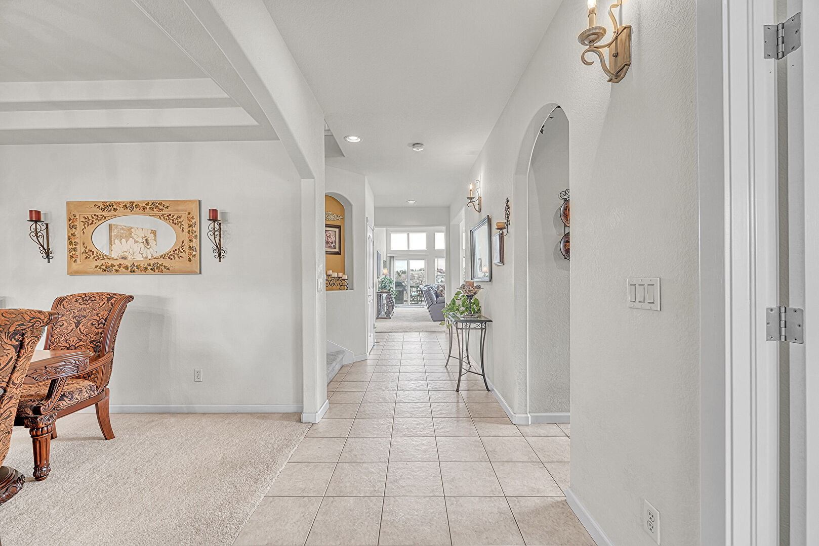 Arched Walkways, Carpet, Drywall, Natural Light, Recessed Lighting, Tile Floor, Baseboards Wall