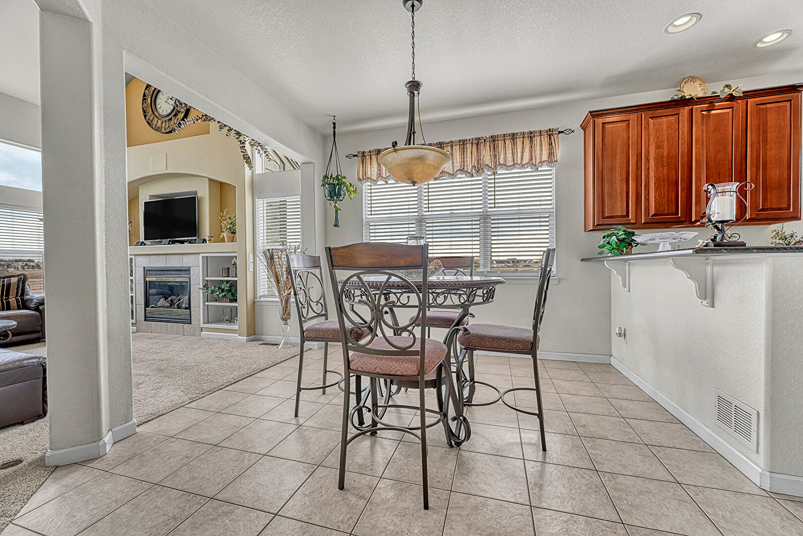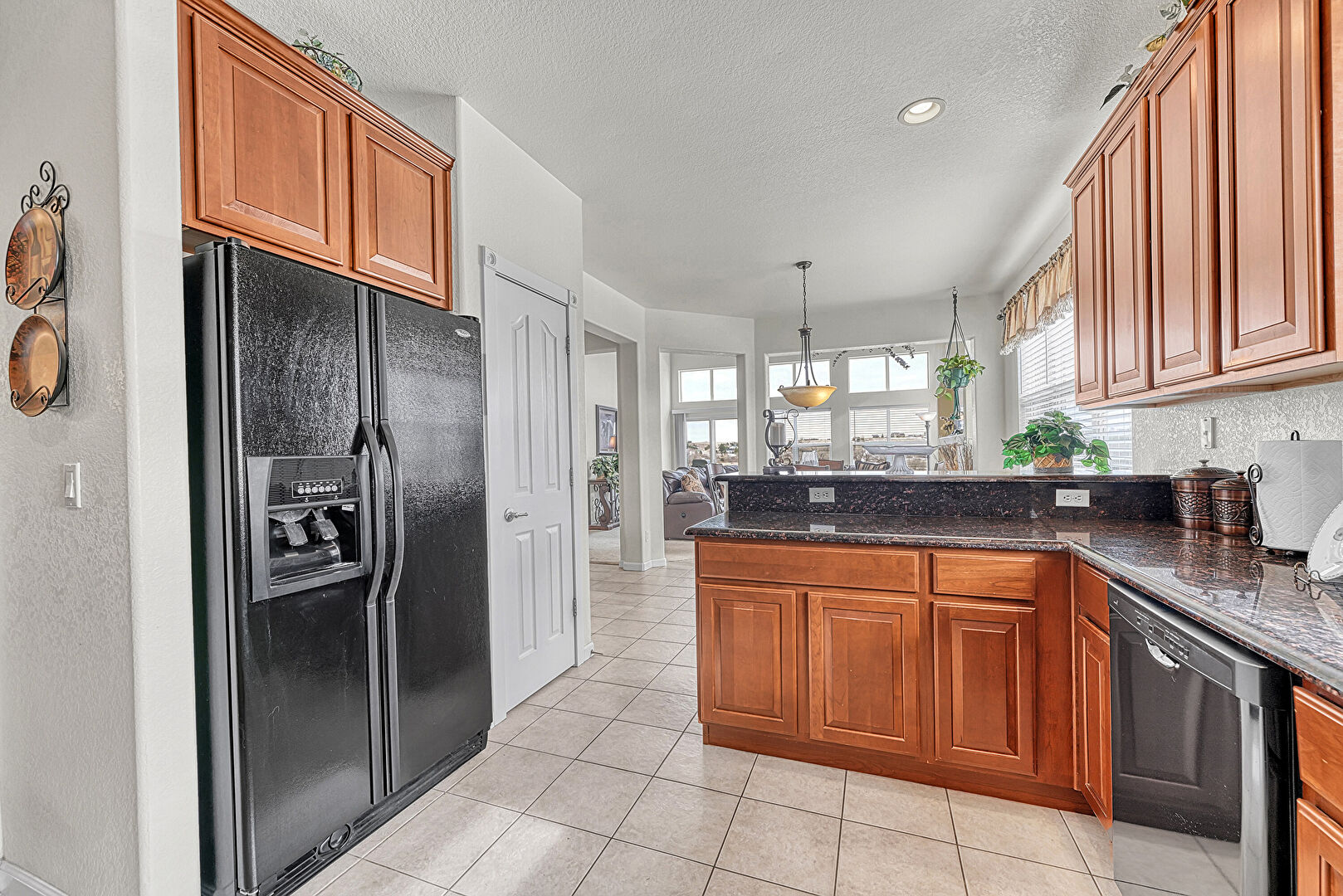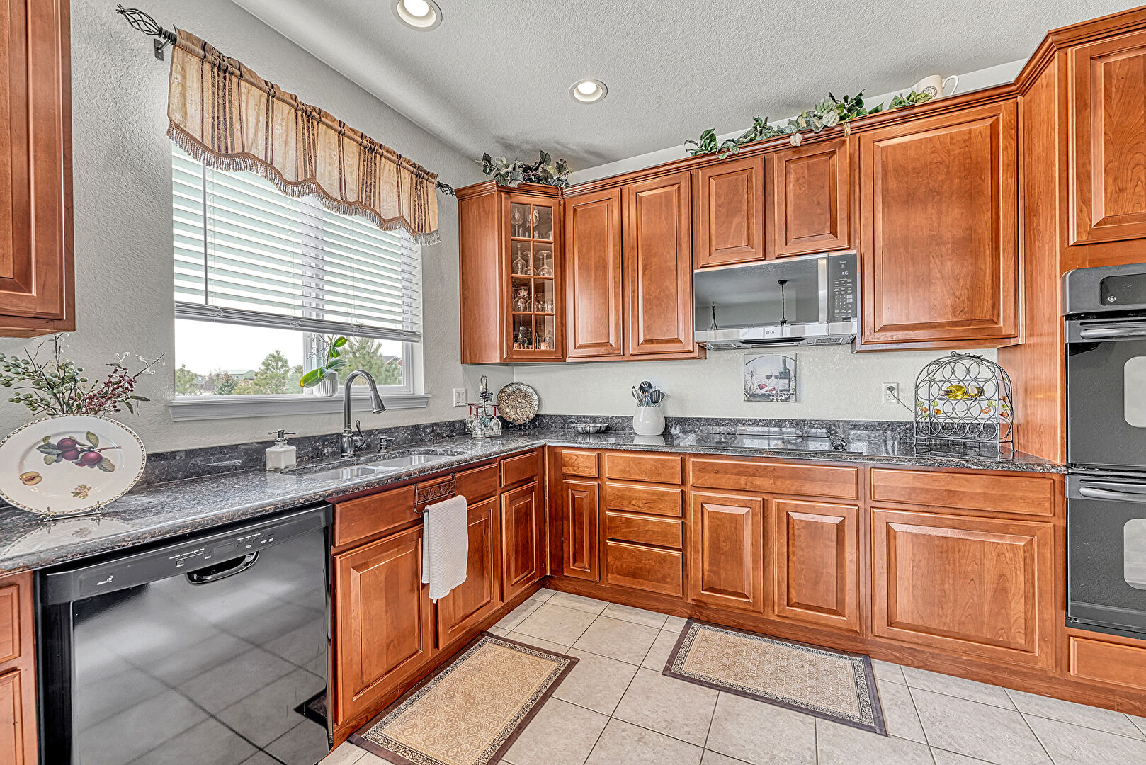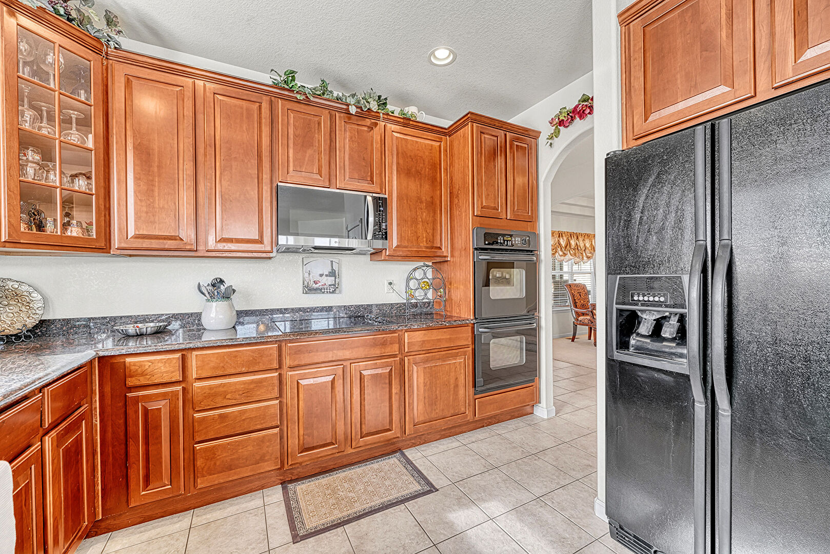 Baseboards Wall, Crown Molding Cabinets, Double Oven, Drywall, G Shaped Kitchen, Glass Insert Cabinets, Kitchen Bar, Kitchen Peninsula, Medium Brown Cabinets, Natural Light, Pendant Lighting, Raised Cabinets, Recessed Lighting, Stone Countertops, Textured Ceiling, Textured Wall, Tile Floor, Arched Walkways, Crown Molding Cabinets, Kitchen Peninsula, Medium Brown Cabinets, Recessed Lighting