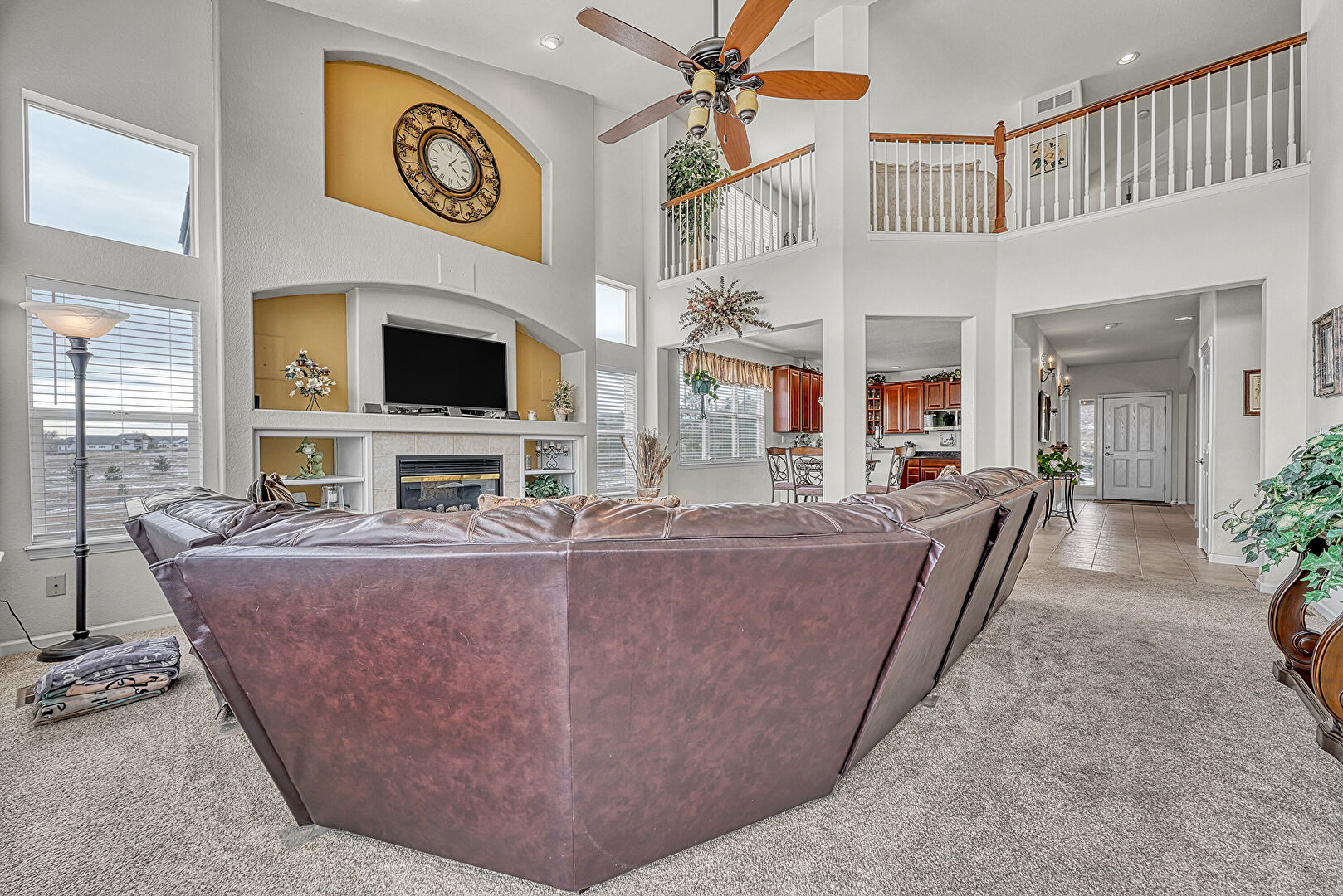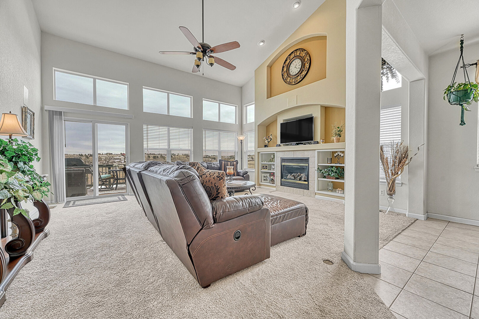 Baseboards Wall, Built In Shelves, Carpet, Ceiling Fan, Drywall, Fireplace, High Ceiling, Natural Light, Recessed Lighting, Tile Floor, Vaulted Ceiling, Vent, Ceiling Fan, Natural Light, Vent