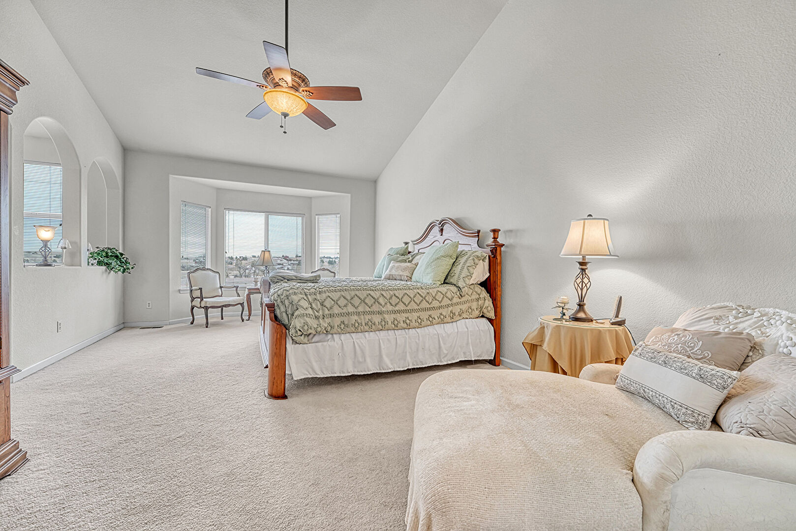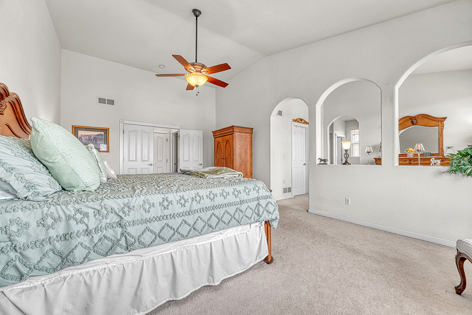Arched Walkways, Baseboards Wall, Carpet, Ceiling Fan, Closet, Drywall, High Ceiling, Vaulted Ceiling, Vent, Baseboards Wall, Natural Light
