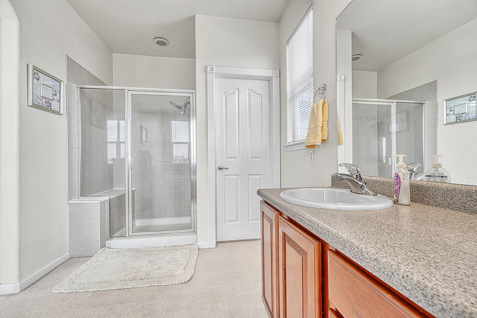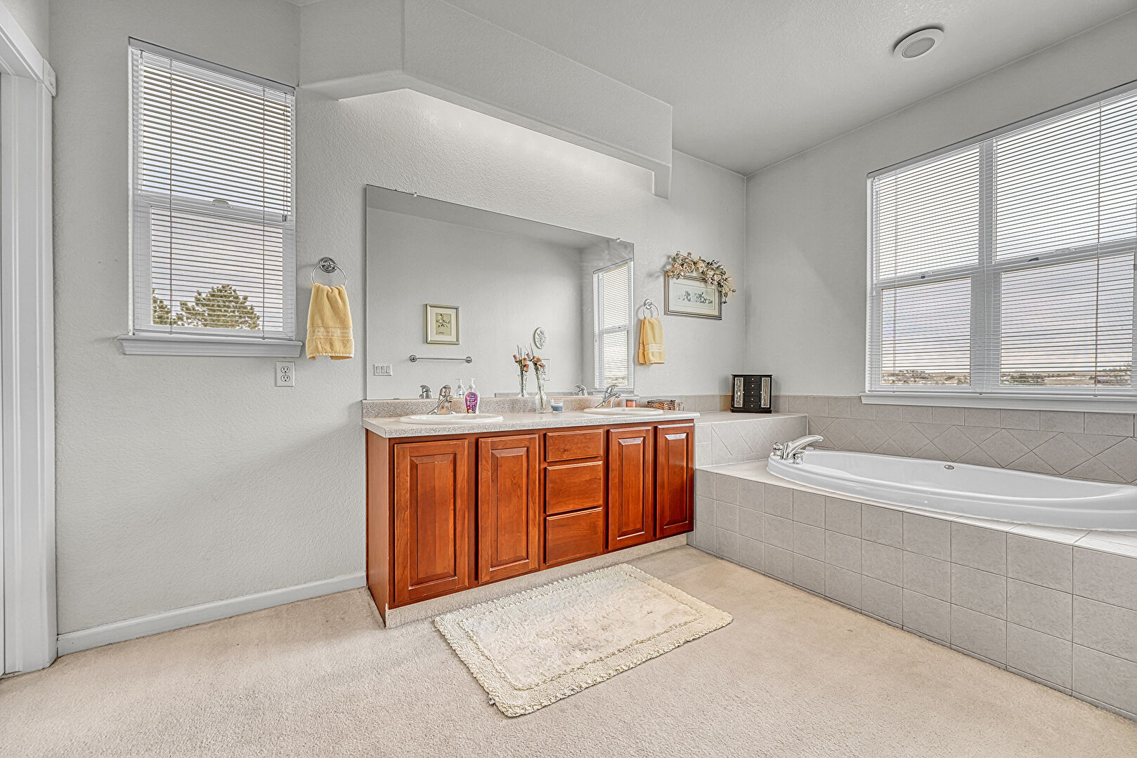 Baseboards Wall, Carpet, Ceiling Fan, Double Vanity, Drywall, Ensuite Bathroom, Full Bathroom, Natural Light, Textured Wall, Vanity, Vent, Baseboards Wall, Natural Light