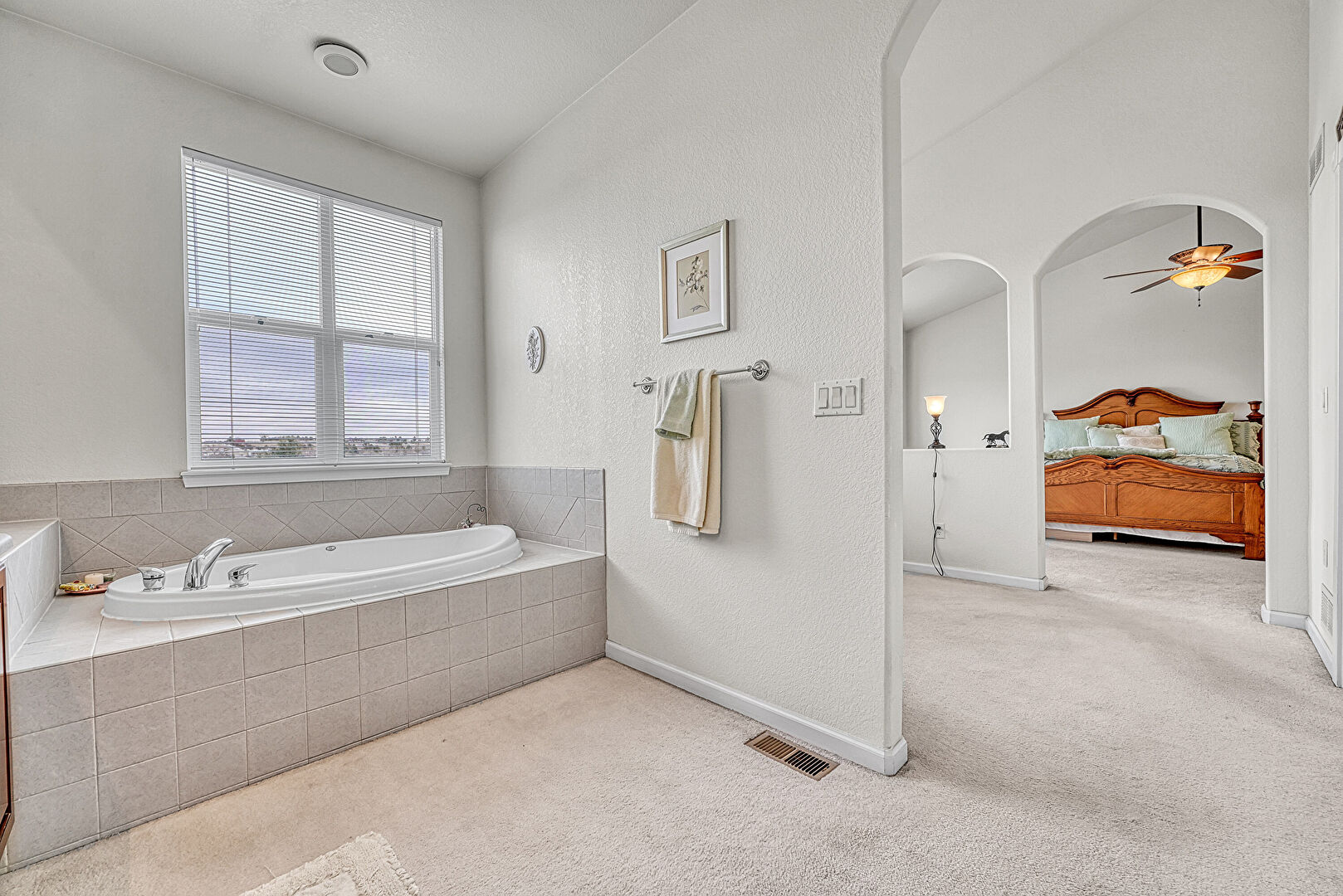 Arched Walkways, Baseboards Wall, Carpet, Drywall, Ensuite Bathroom, Natural Light, Vaulted Ceiling