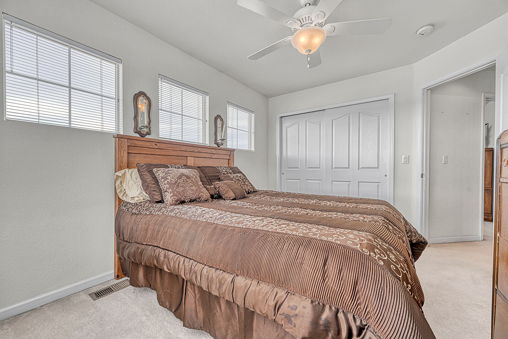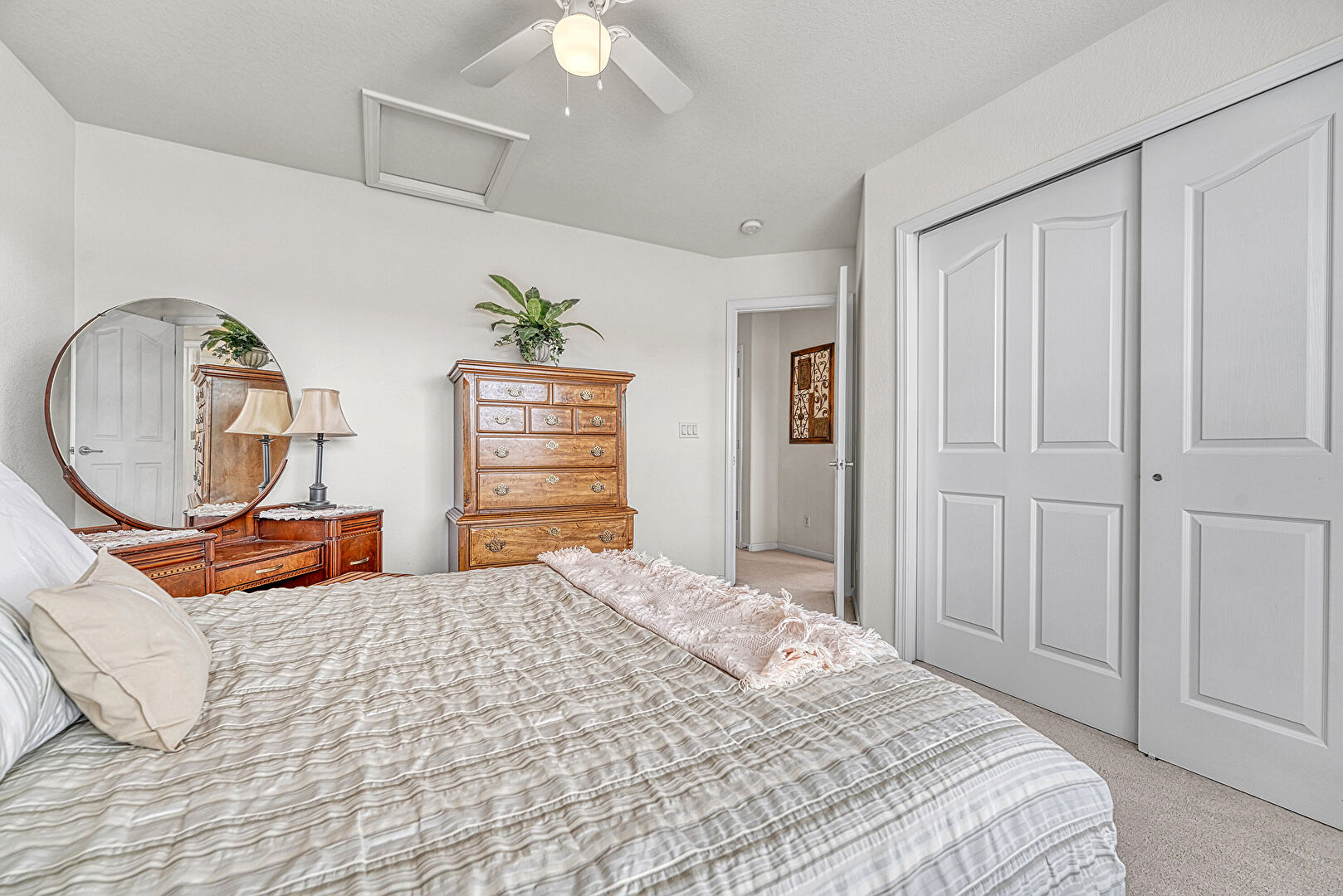 Baseboards Wall, Carpet, Ceiling Fan, Closet, Drywall, Natural Light, Smoke Carbon Monoxide Detector, Textured Ceiling, Textured Wall, Vent, Ceiling Fan, Drywall, Natural Light, Scuttle