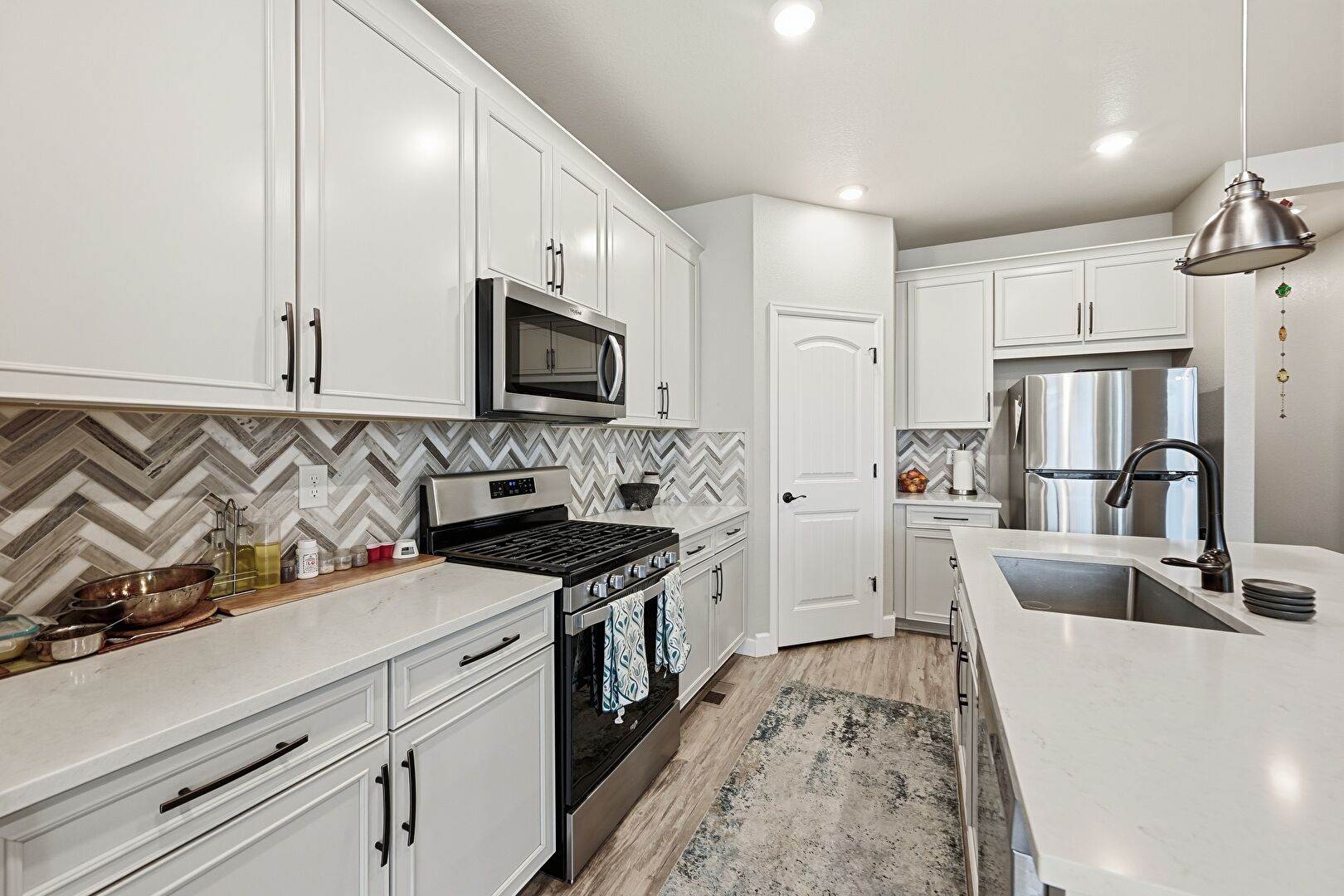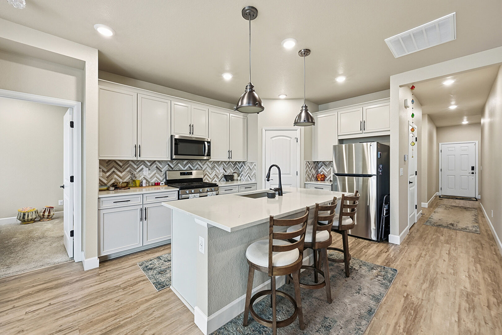 Baseboards Wall, Crown Molding Cabinets, Drywall, Fireplace, Kitchen Bar, Kitchen Island, L Shaped Kitchen, Natural Light, Notable Chandelier, Opens To Living Area, Pendant Lighting, Recessed Lighting, Shaker Cabinets, Stone Countertops, Vent, Wood Finish Floor, Shaker Cabinets, Smoke Carbon Monoxide Detector, Stone Countertops