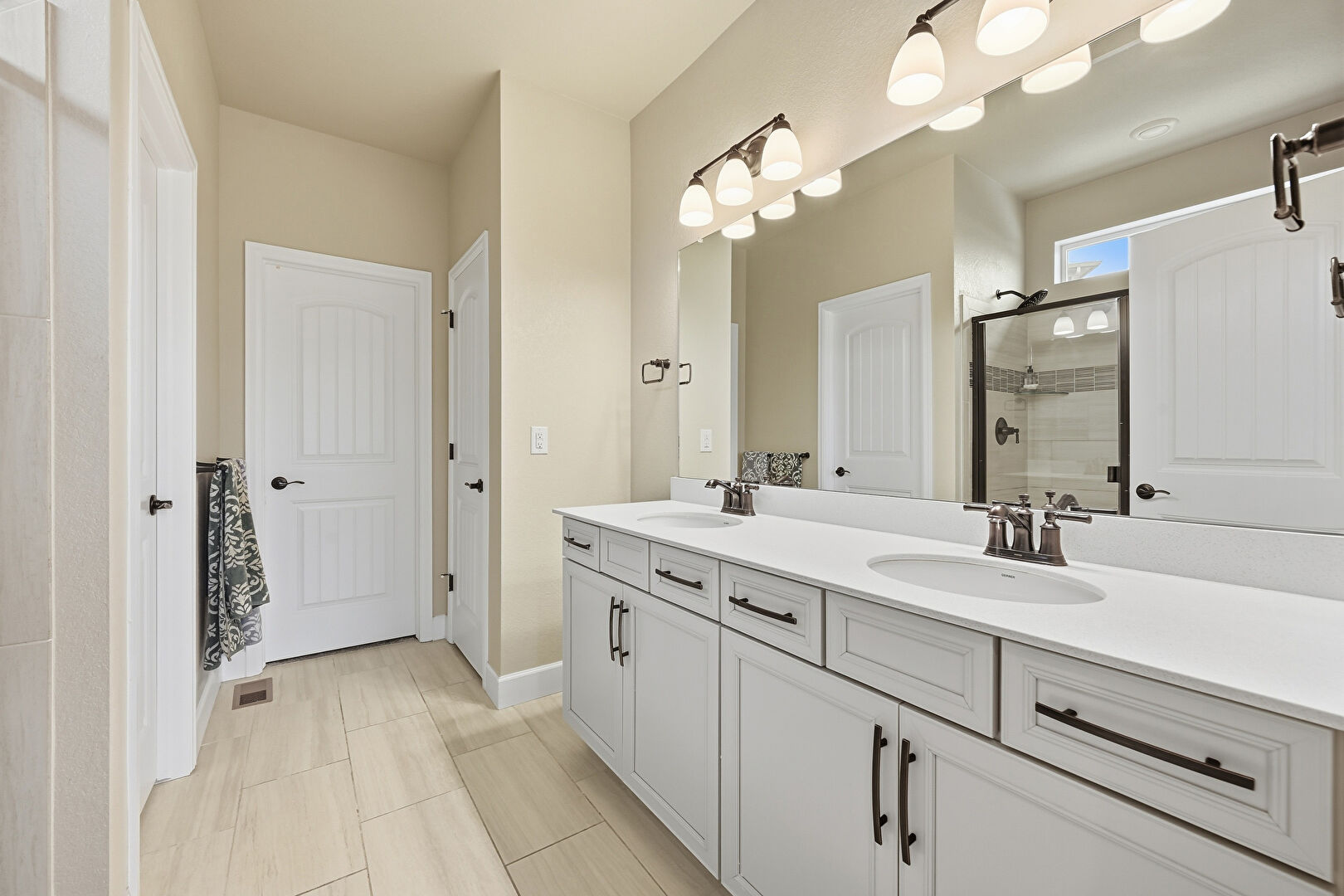 Baseboards Wall, Drywall, Full Bathroom, Natural Light, Tile Floor, Vent, Double Vanity