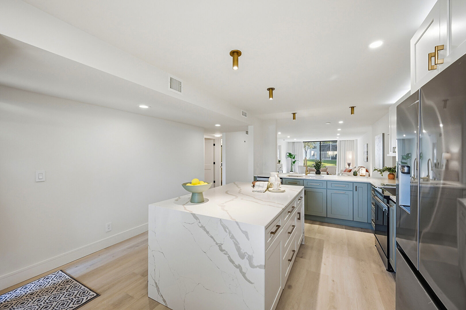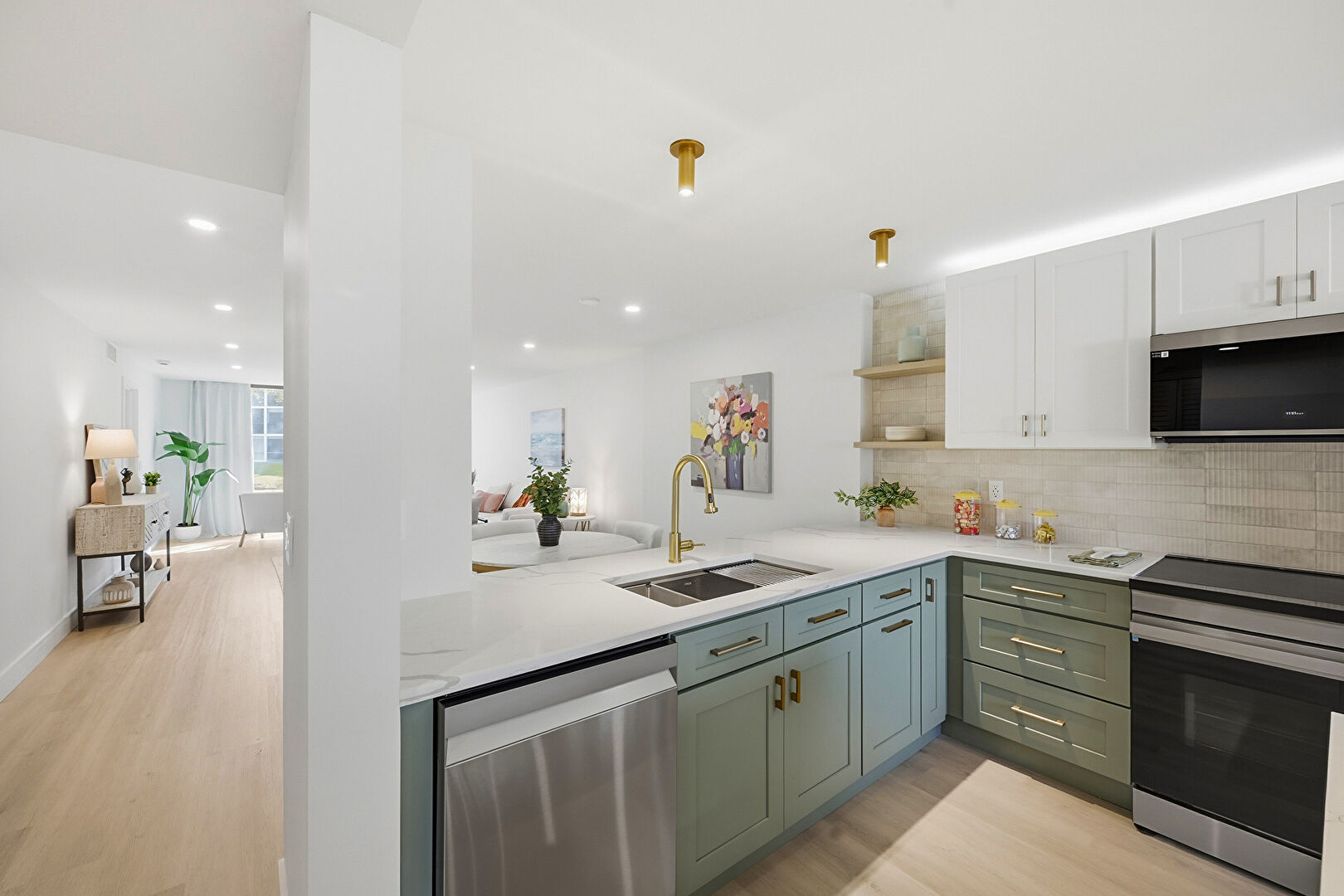 Baseboards Wall, Drywall, Gray Cabinets, Green Cabinets, Kitchen Bar, Kitchen Island, Kitchen Peninsula, L Shaped Kitchen, Natural Light, Open Shelves, Opens To Living Area, Pass Through Window, Recessed Lighting, Shaker Cabinets, Stone Countertops, Vent, Wood Finish Floor, Drywall, Natural Light, Opens To Living Area, Recessed Lighting, Shaker Cabinets, Stone Countertops