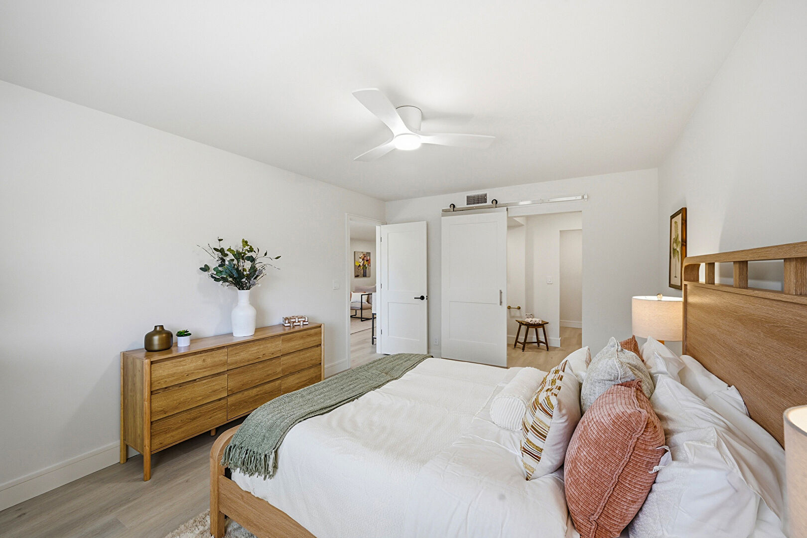Barn Door, Baseboards Wall, Ceiling Fan, Drywall, Ensuite Bathroom, Natural Light, Vent, Wood Finish Floor, Baseboards Wall, Wood Finish Floor
