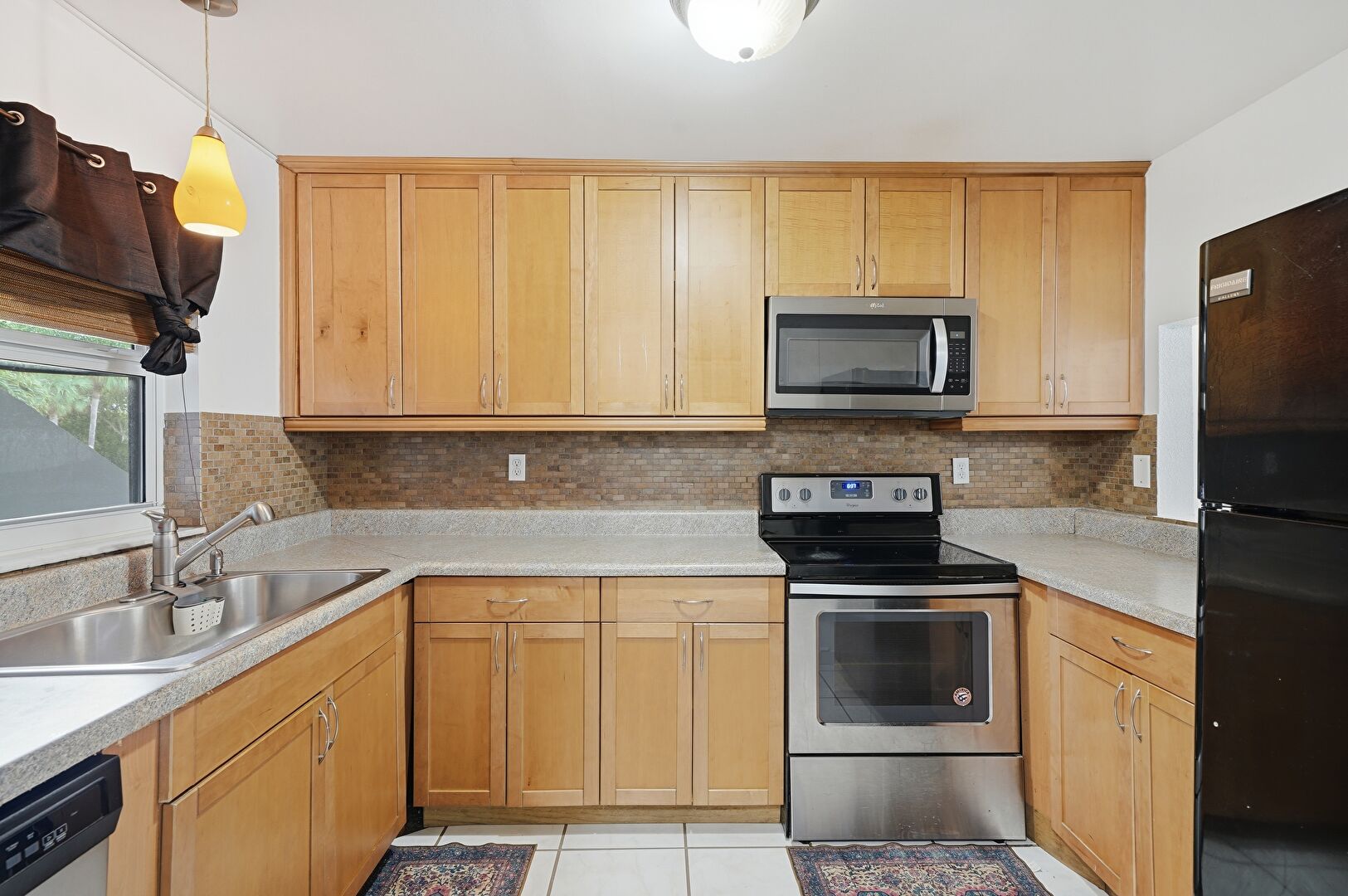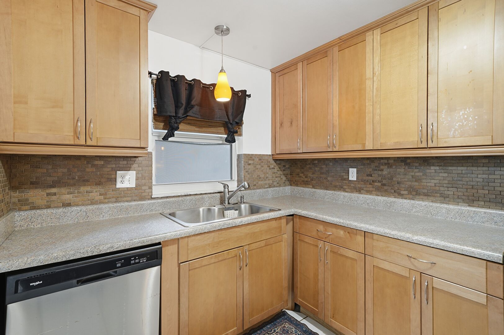 Baseboards Wall, Crown Molding Cabinets, Drywall, Medium Brown Cabinets, Natural Light, Pendant Lighting, Shaker Cabinets, Stone Countertops, Tile Floor, Vent, Electric Panel, Pendant Lighting, Stone Countertops, Tile Floor