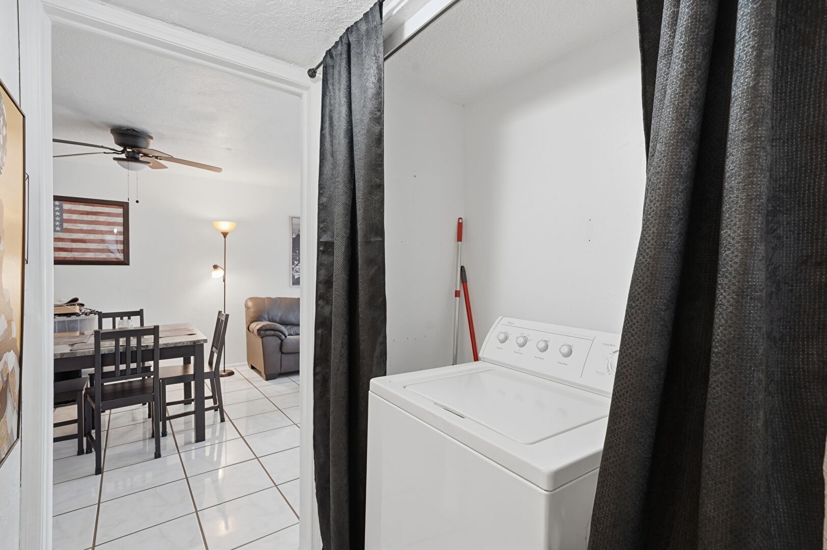 Ceiling Fan, Drywall, Textured Ceiling, Tile Floor, Washer Dryer, Laundry