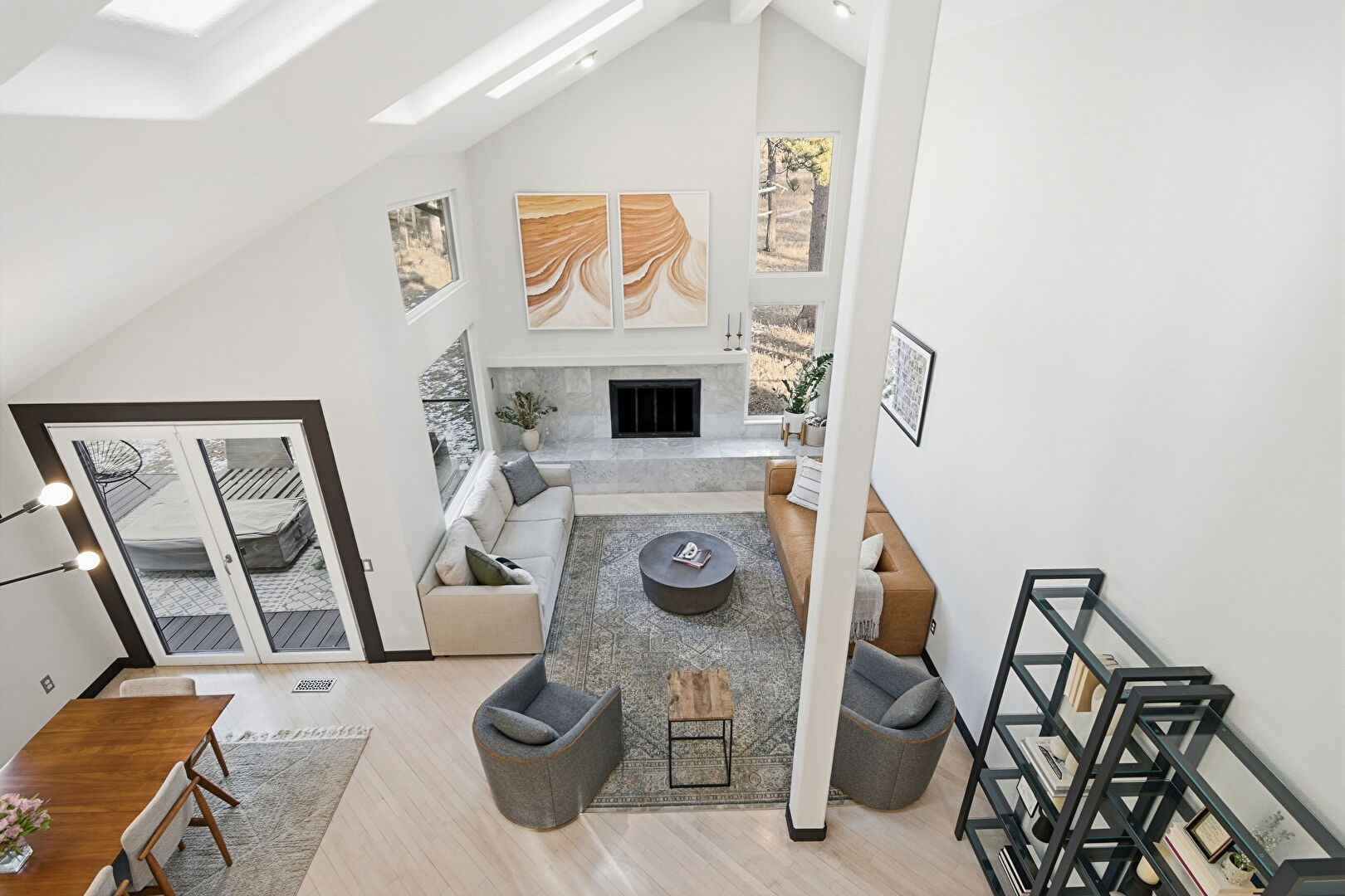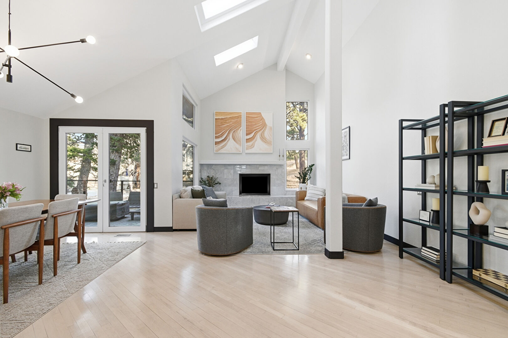Baseboards Wall, Beamed Ceiling, Cathedral Ceiling, Drywall, Fireplace, French Doors, High Ceiling, Natural Light, Notable Chandelier, Recessed Lighting, Skylight, Stairs, Vaulted Ceiling, Vent, Wood Finish Floor, Fireplace, High Ceiling, Natural Light, Recessed Lighting