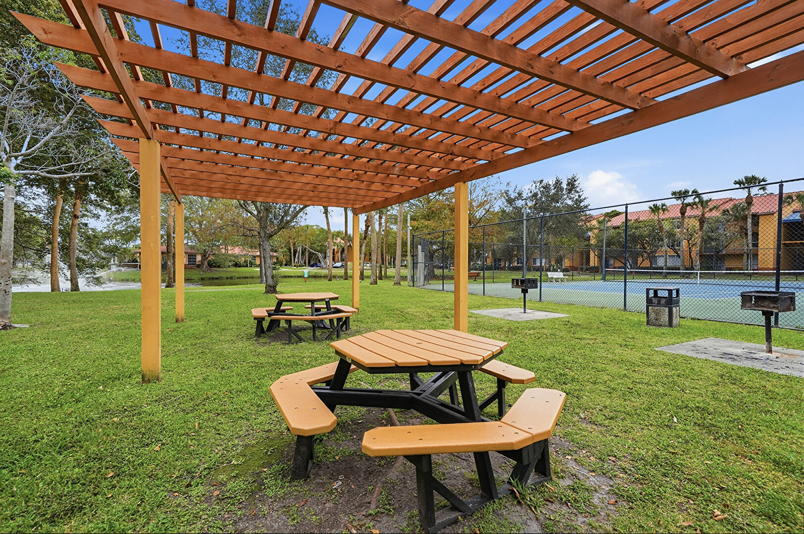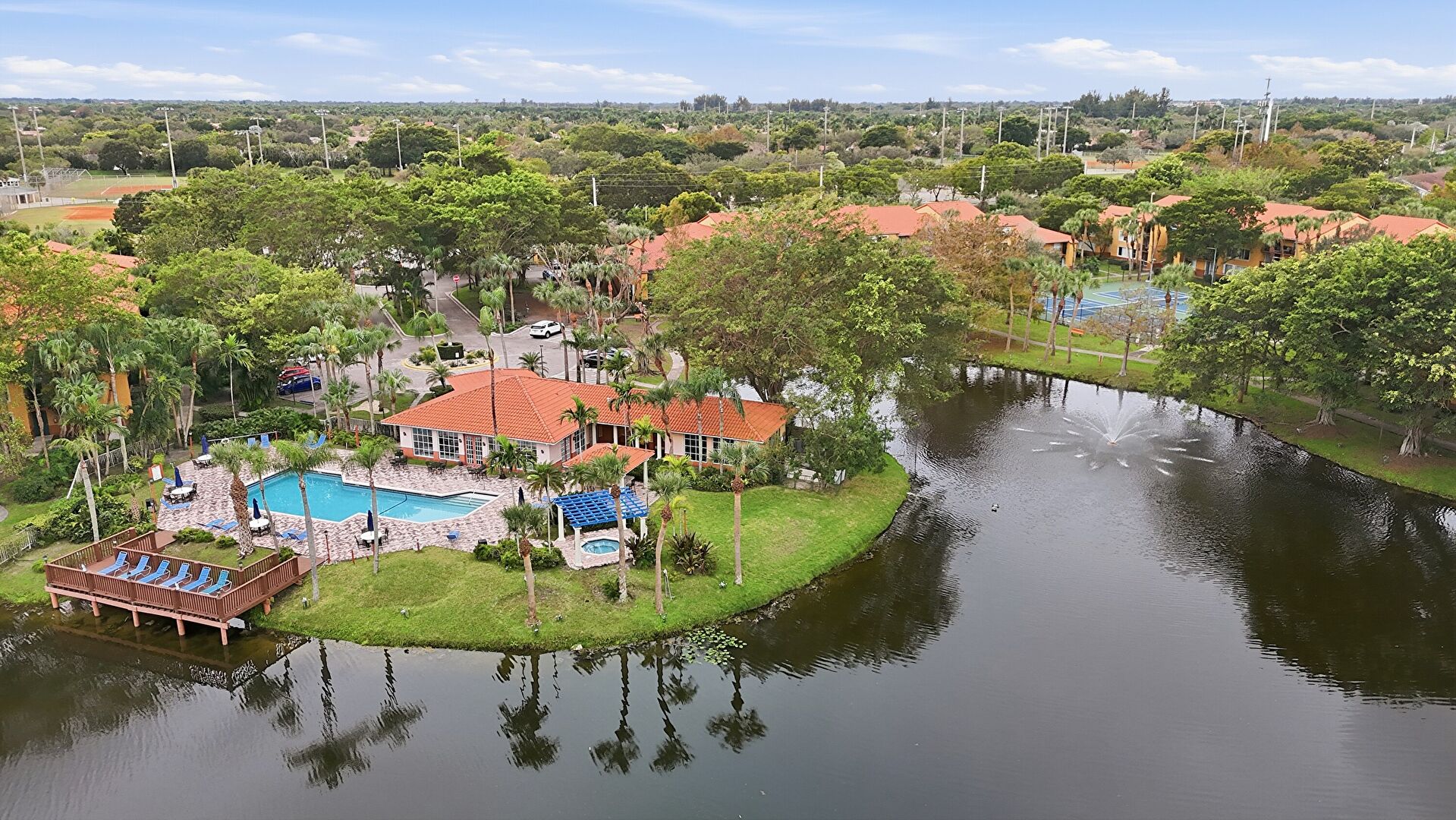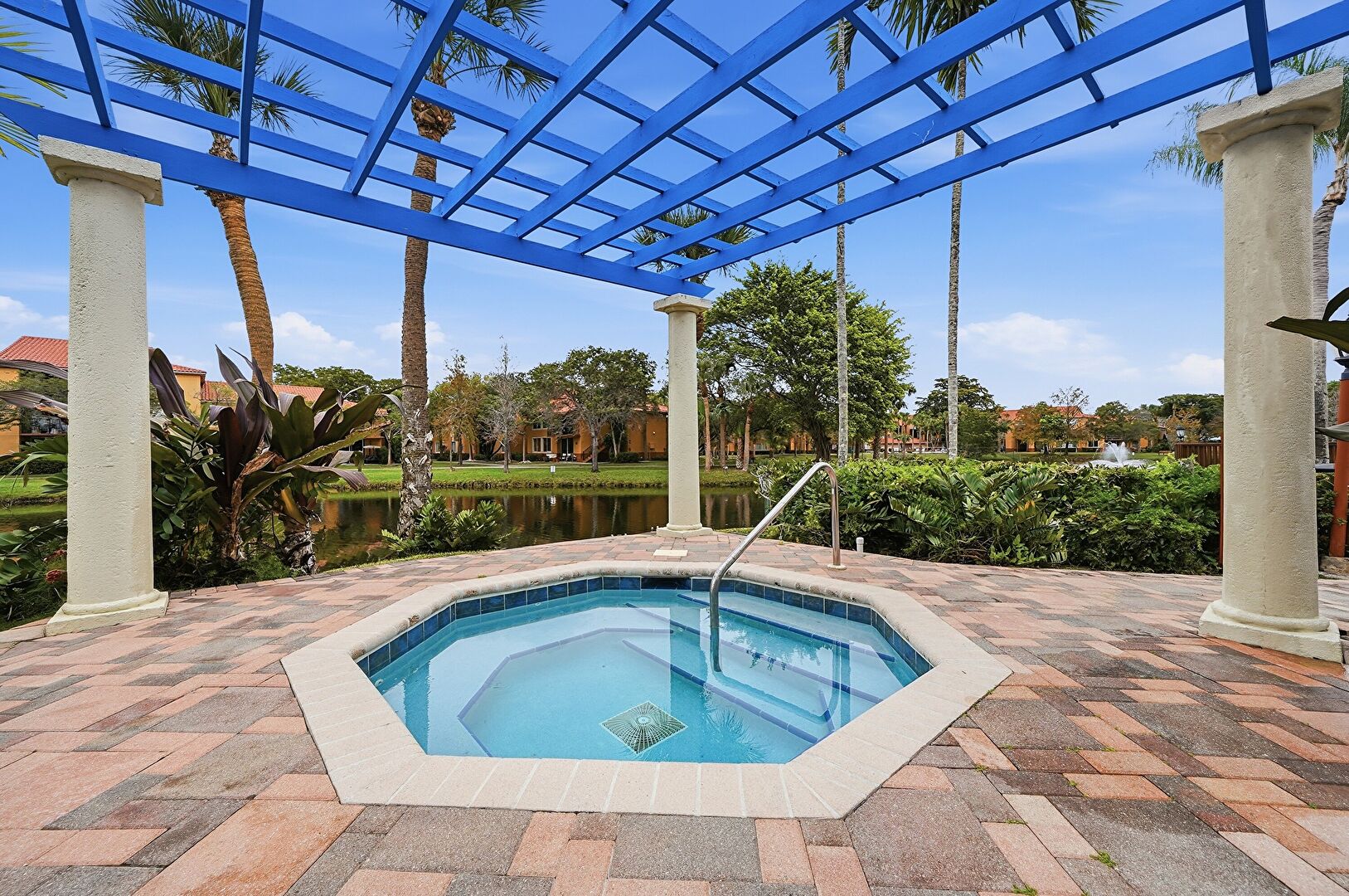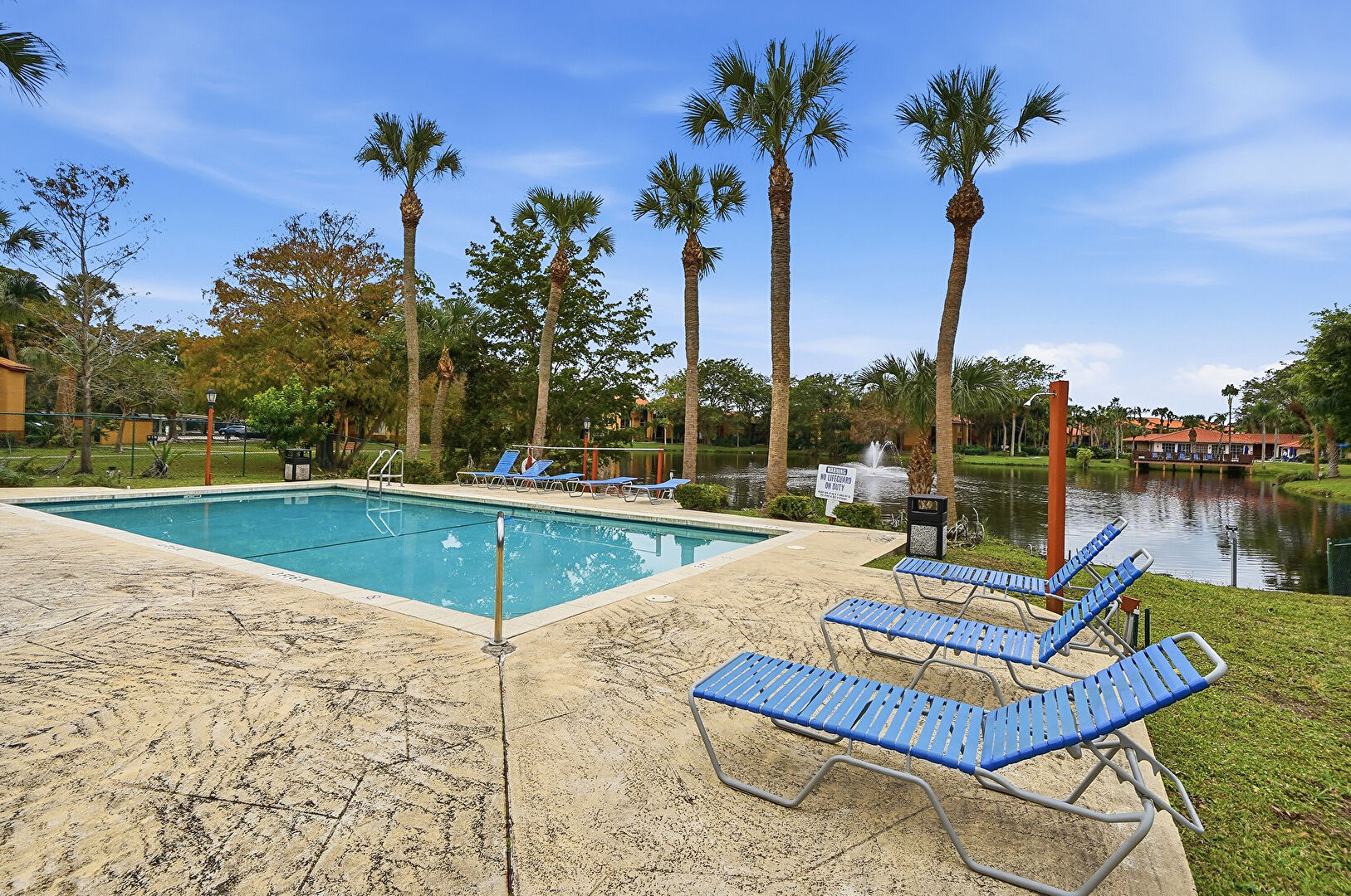 Baseboards Wall, Drywall, Fence, French Doors, Lawn, Marble Finish Floor, Natural Light, Office Area, Park View, Patio, Pool View, Recessed Lighting, Residential View, Tennis Court, Vent, Water View, Drywall, Fountain, Marble Finish Floor, Pergola, Pool
