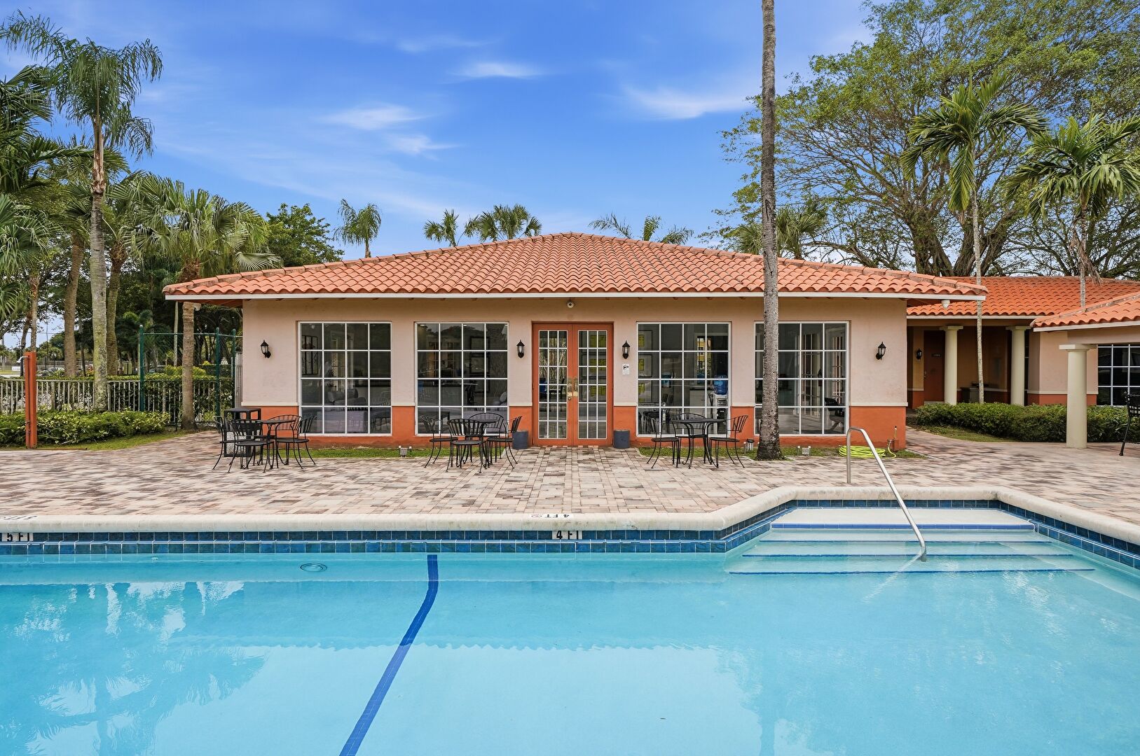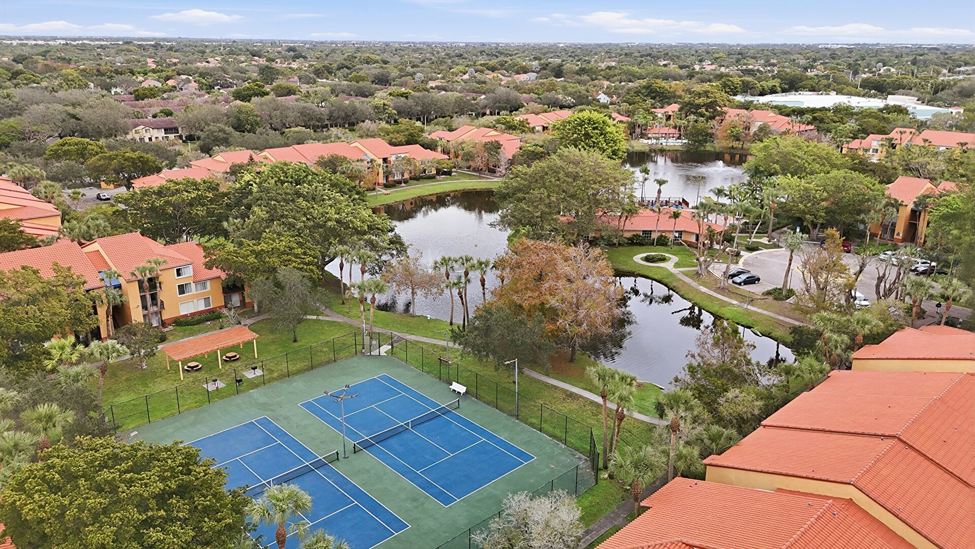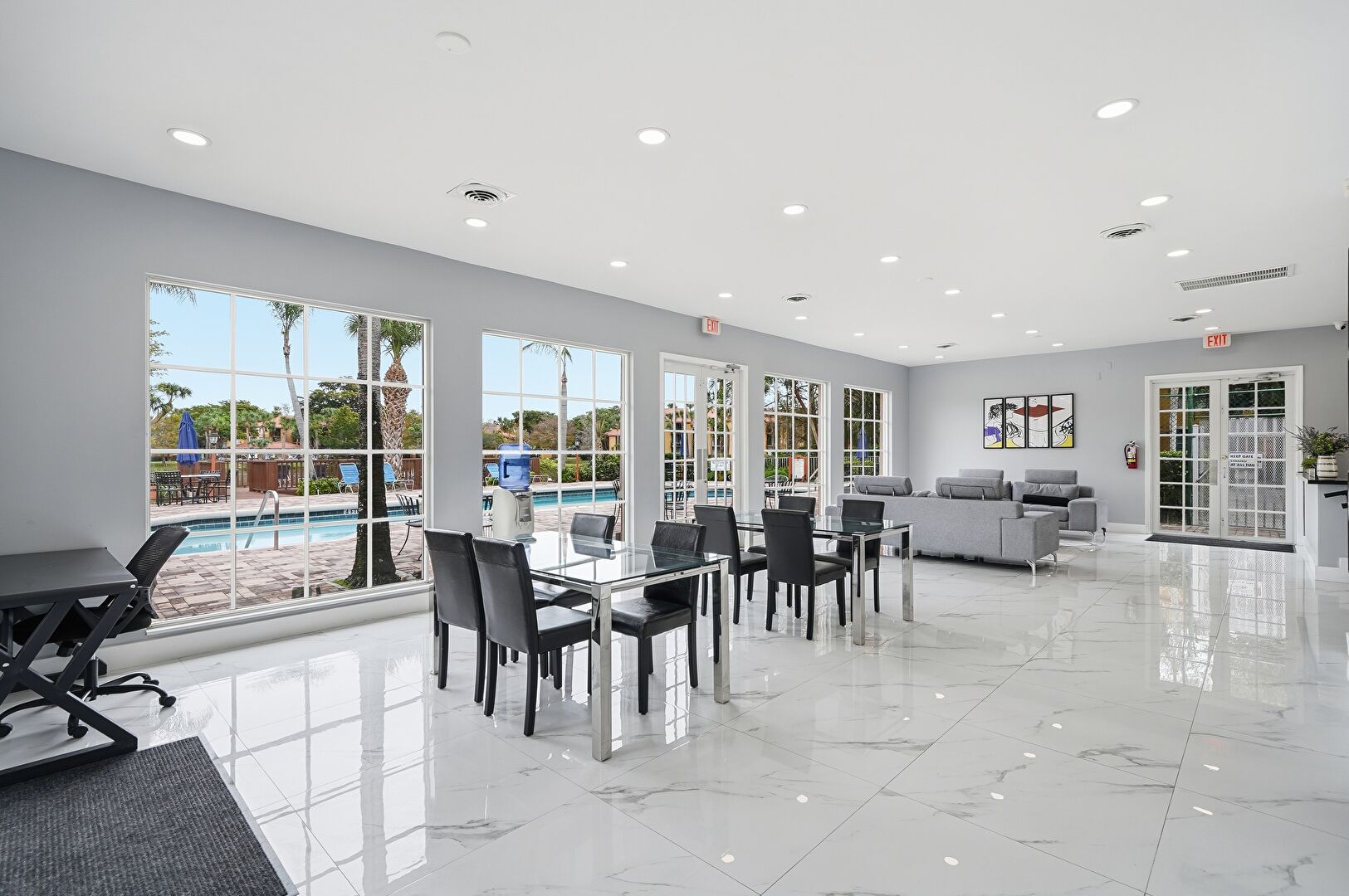 Baseboards Wall, Drywall, Fence, French Doors, Lawn, Marble Finish Floor, Natural Light, Office Area, Park View, Patio, Pool View, Recessed Lighting, Residential View, Tennis Court, Vent, Water View, Drywall, Fountain, Marble Finish Floor, Pergola, Pool