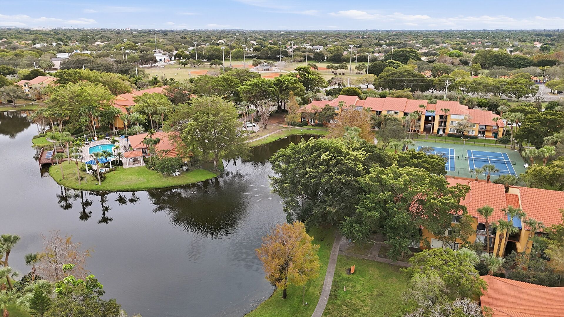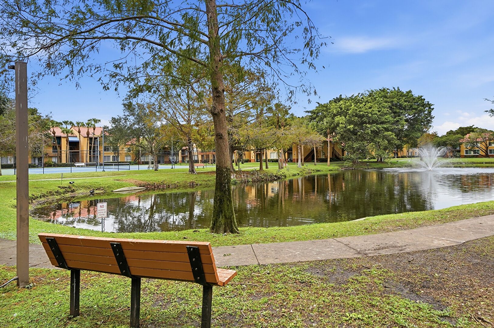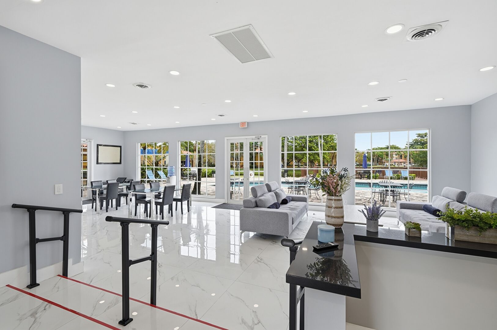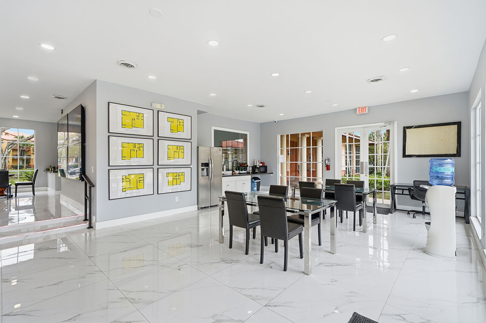 Baseboards Wall, Drywall, Fence, French Doors, Lawn, Marble Finish Floor, Natural Light, Office Area, Park View, Patio, Pool View, Recessed Lighting, Residential View, Tennis Court, Vent, Water View, Drywall, Fountain, Marble Finish Floor, Pergola, Pool