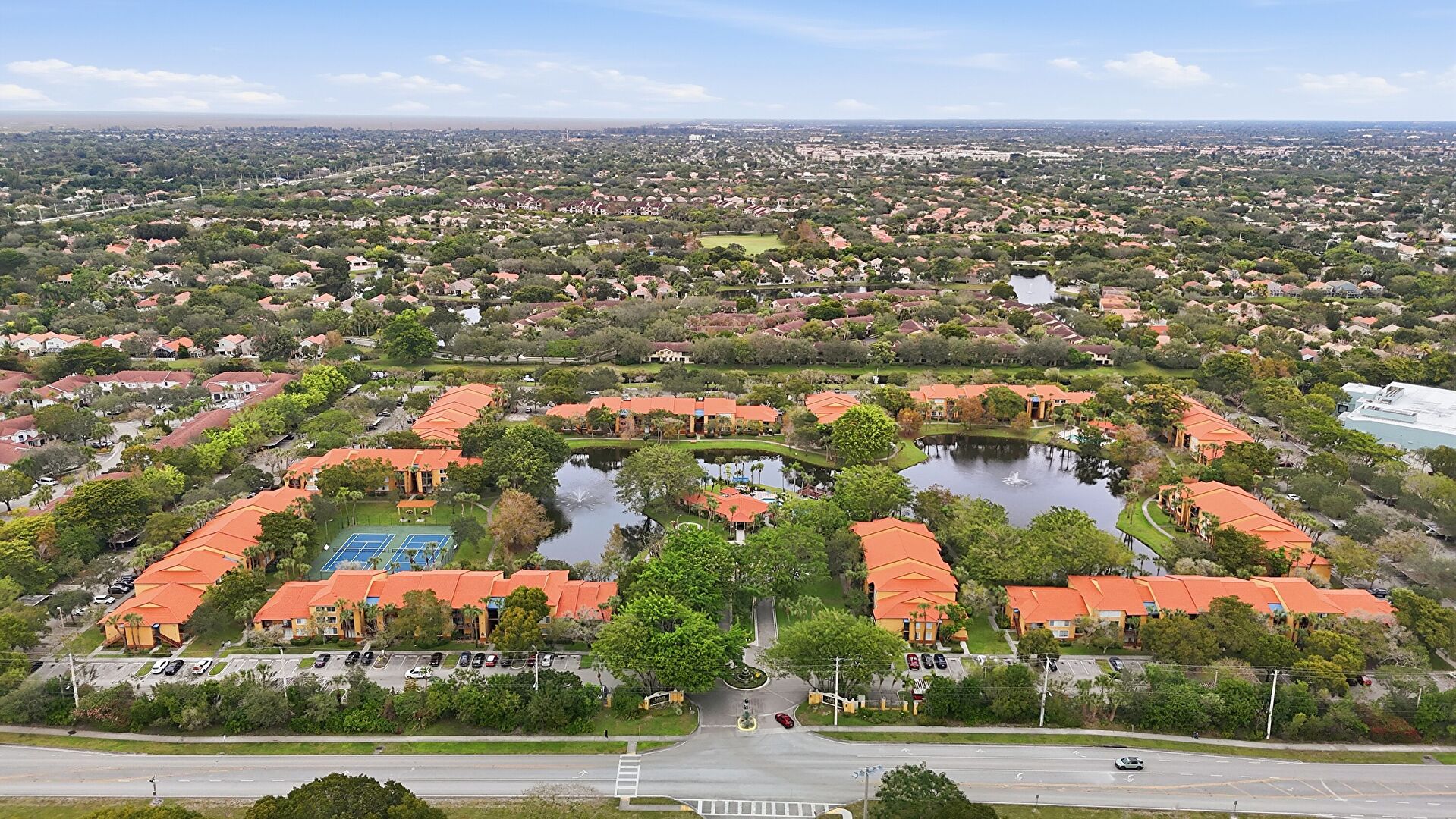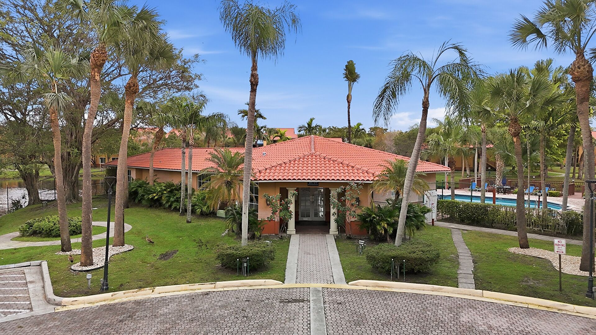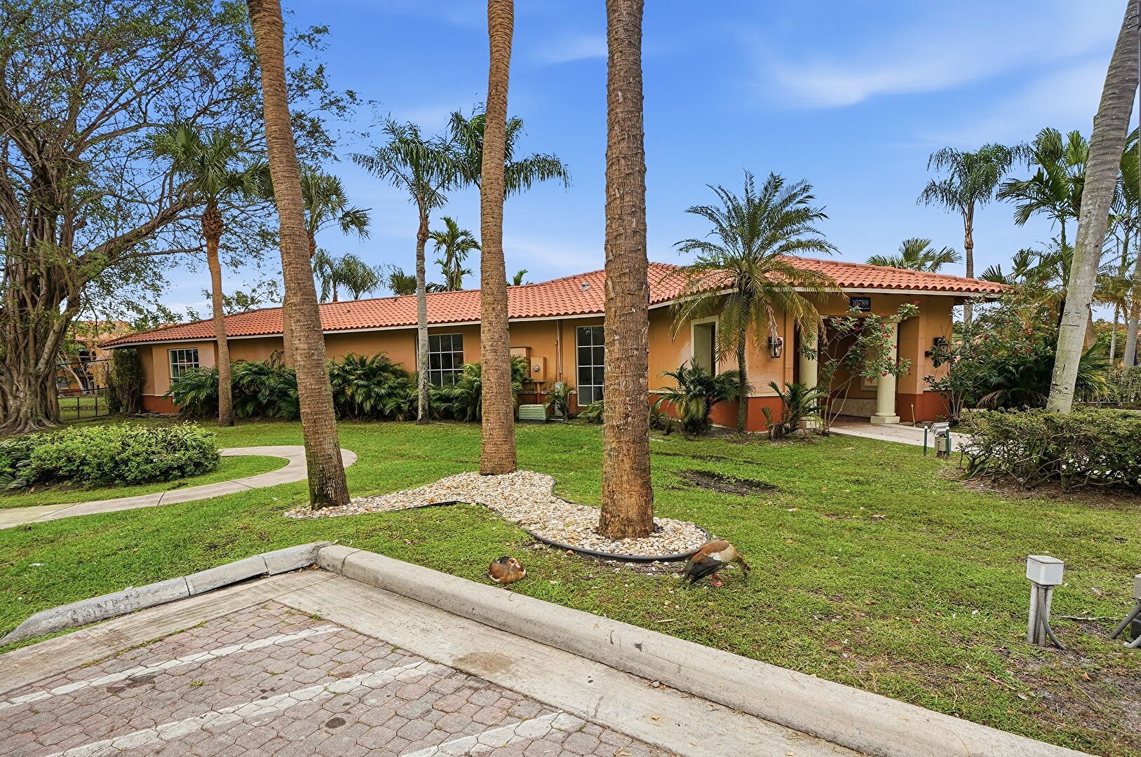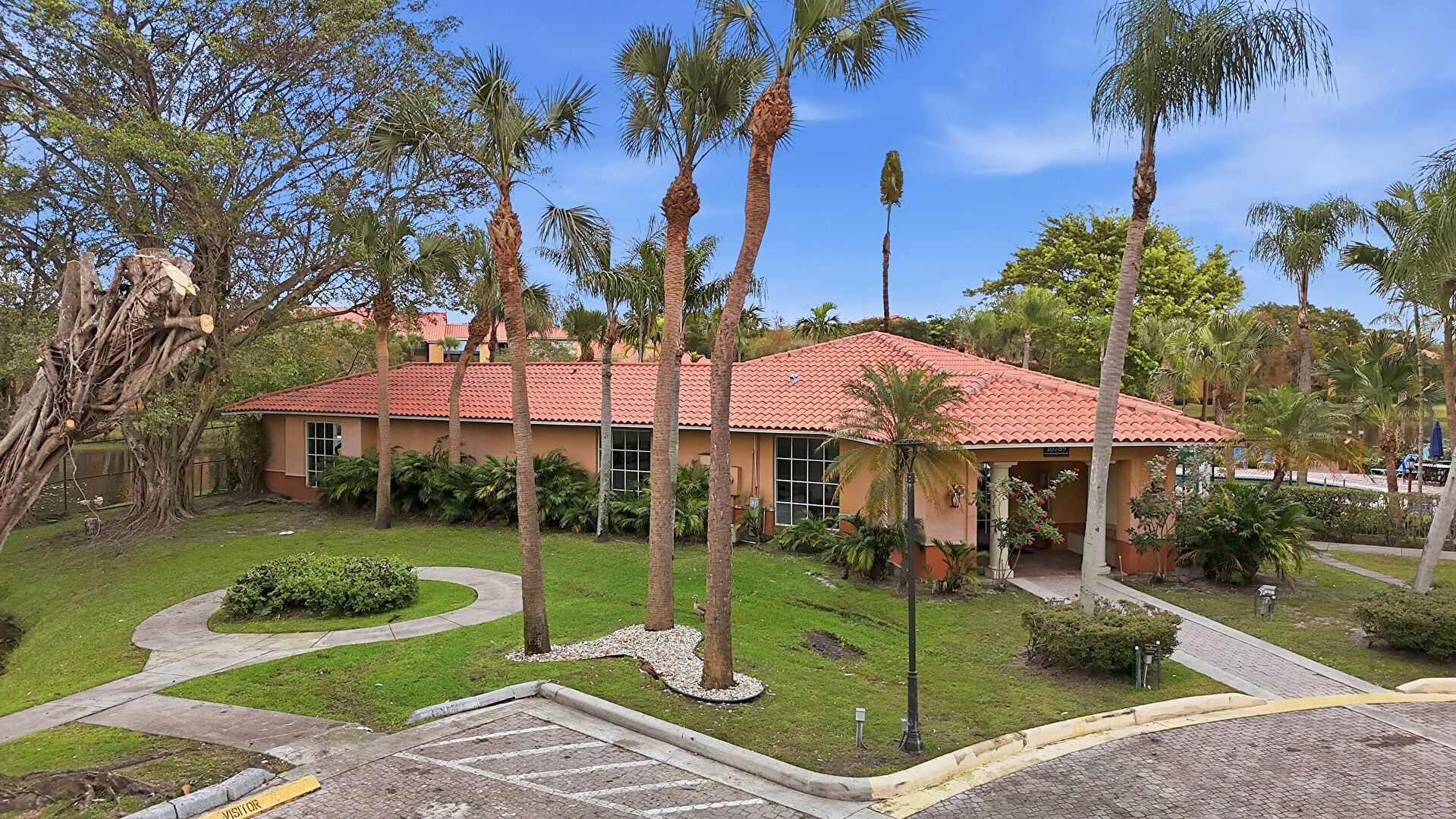 Lawn, Stucco Siding, Tile Roof, Lawn, Parking Lot