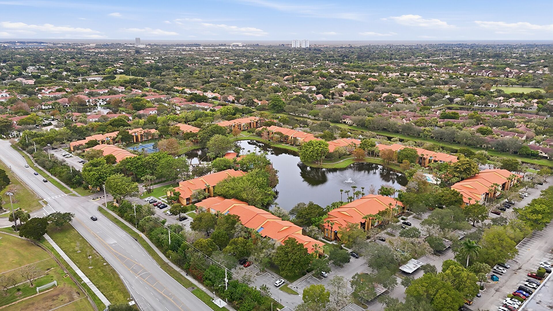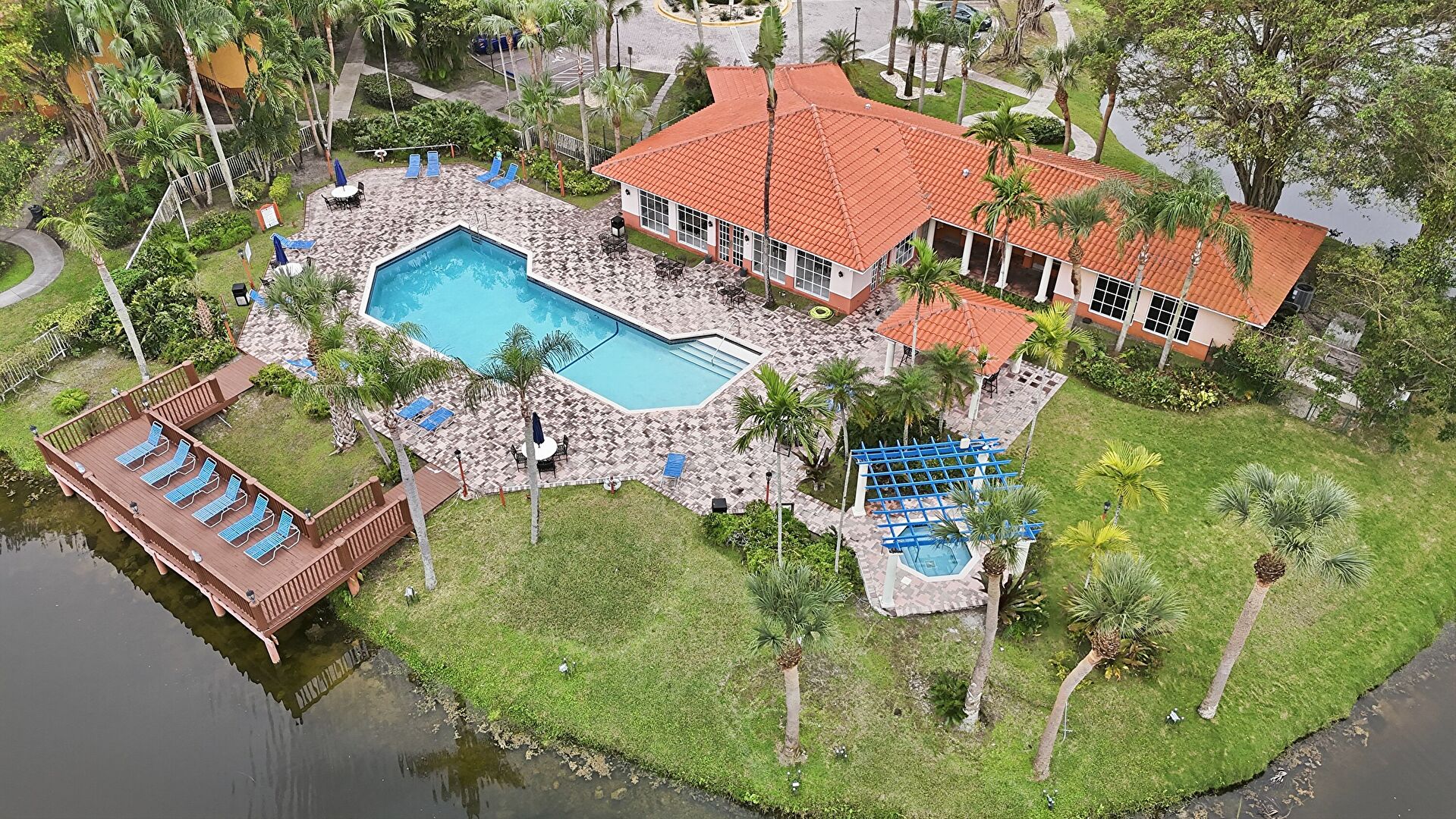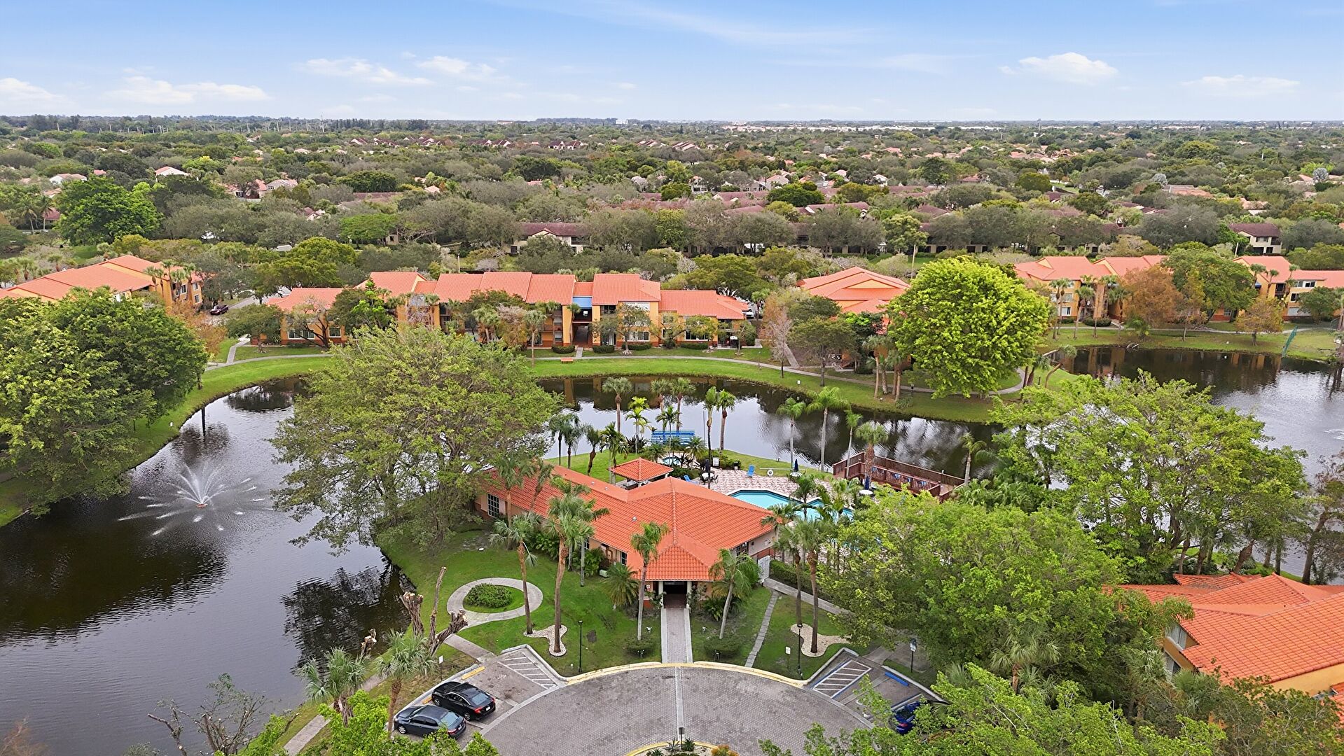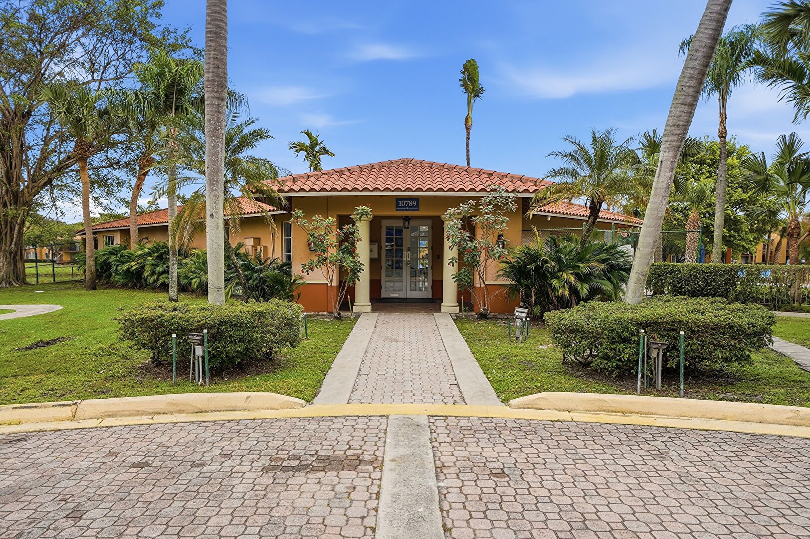 Lawn, Stucco Siding, Tile Roof, Lawn, Parking Lot