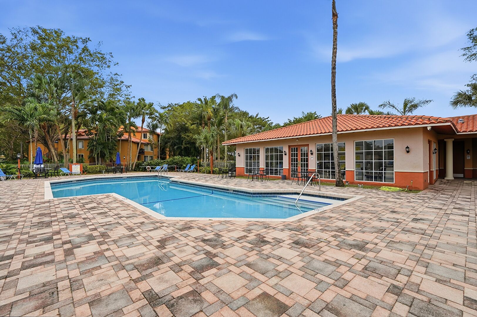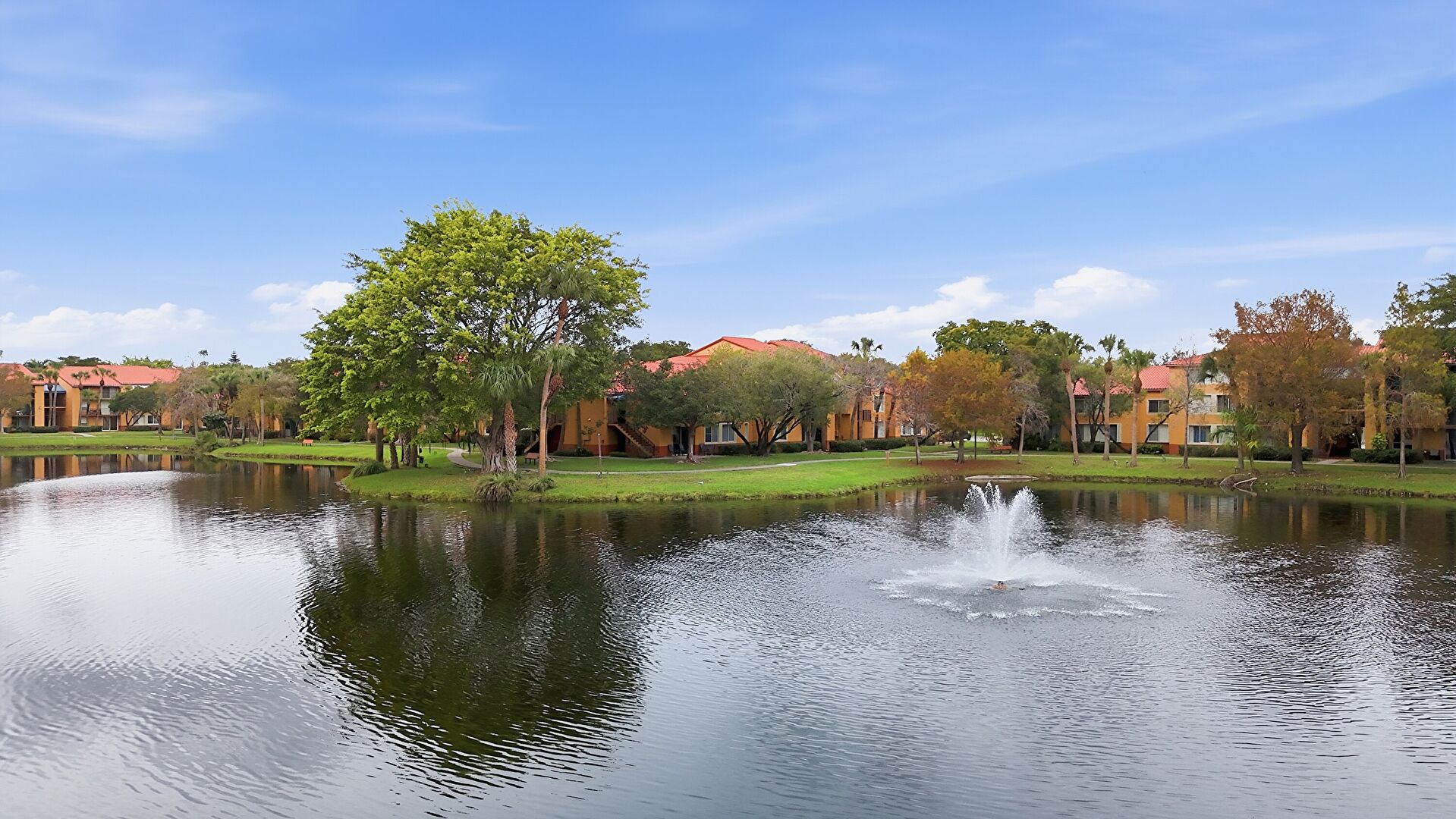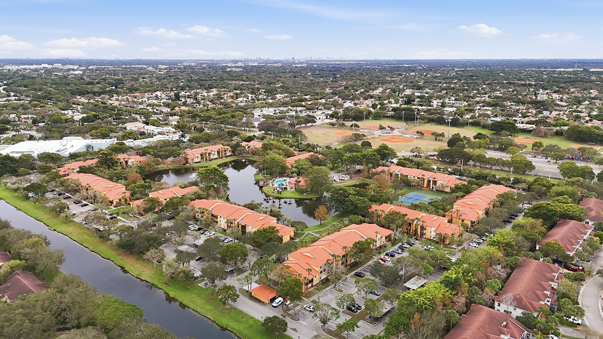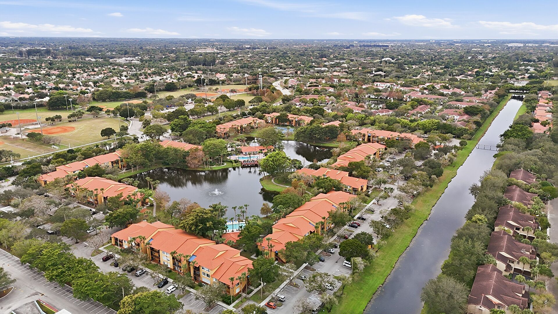 Lawn, Stucco Siding, Tile Roof, Lawn, Parking Lot