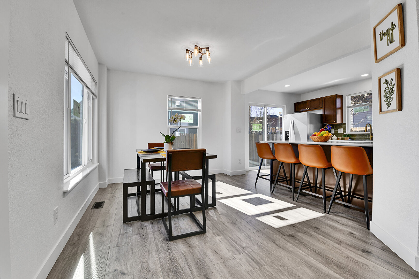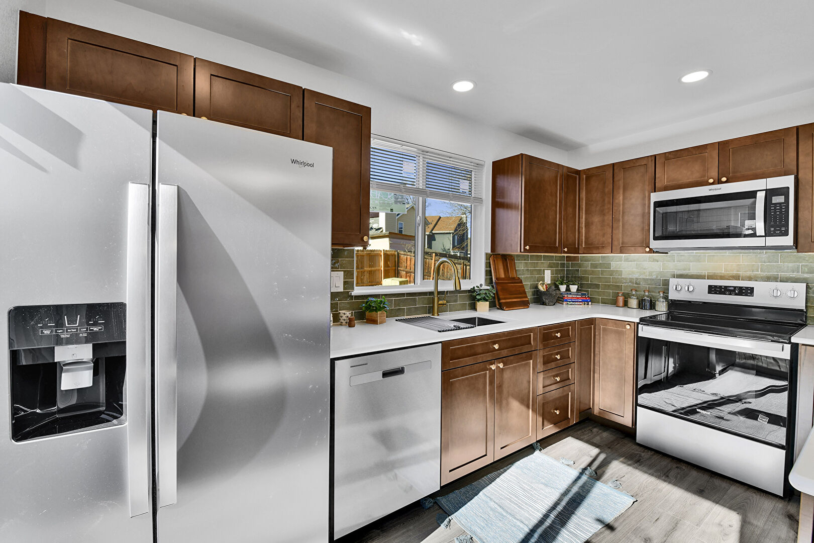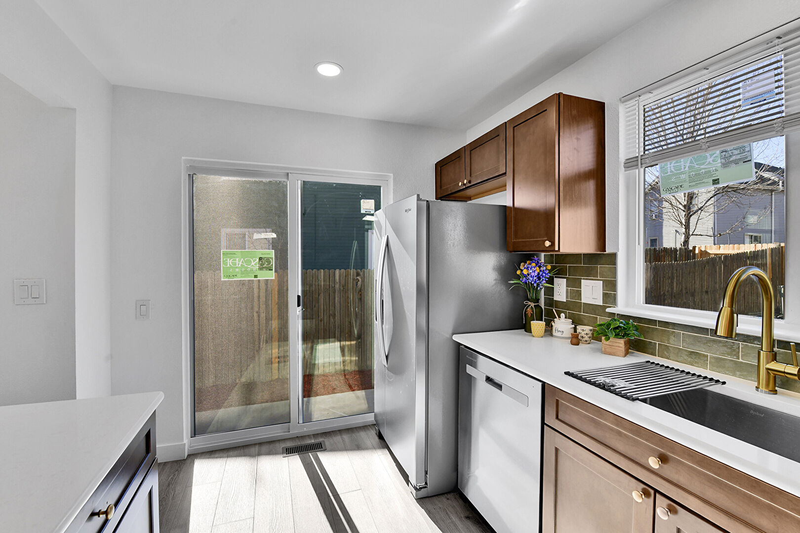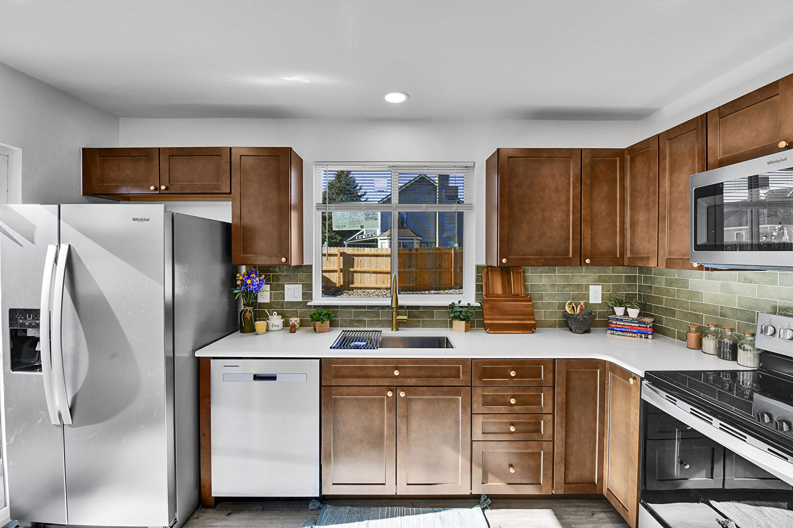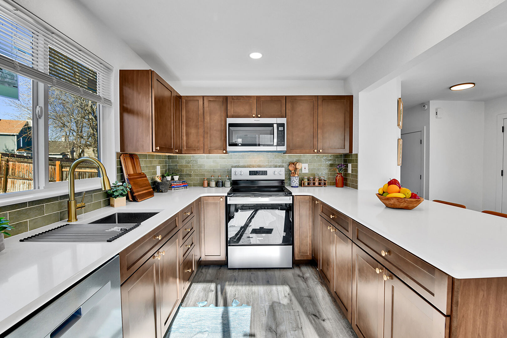 Baseboards Wall, Dark Brown Cabinets, Drywall, Kitchen Bar, Kitchen Peninsula, Medium Brown Cabinets, Natural Light, Recessed Lighting, Shaker Cabinets, Stone Countertops, U Shaped Kitchen, Vent, Wood Finish Floor, Natural Light, Recessed Lighting, Shaker Cabinets, Wood Finish Floor