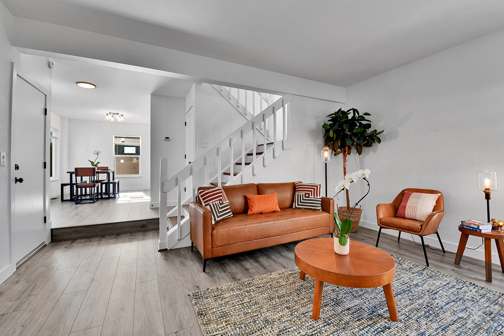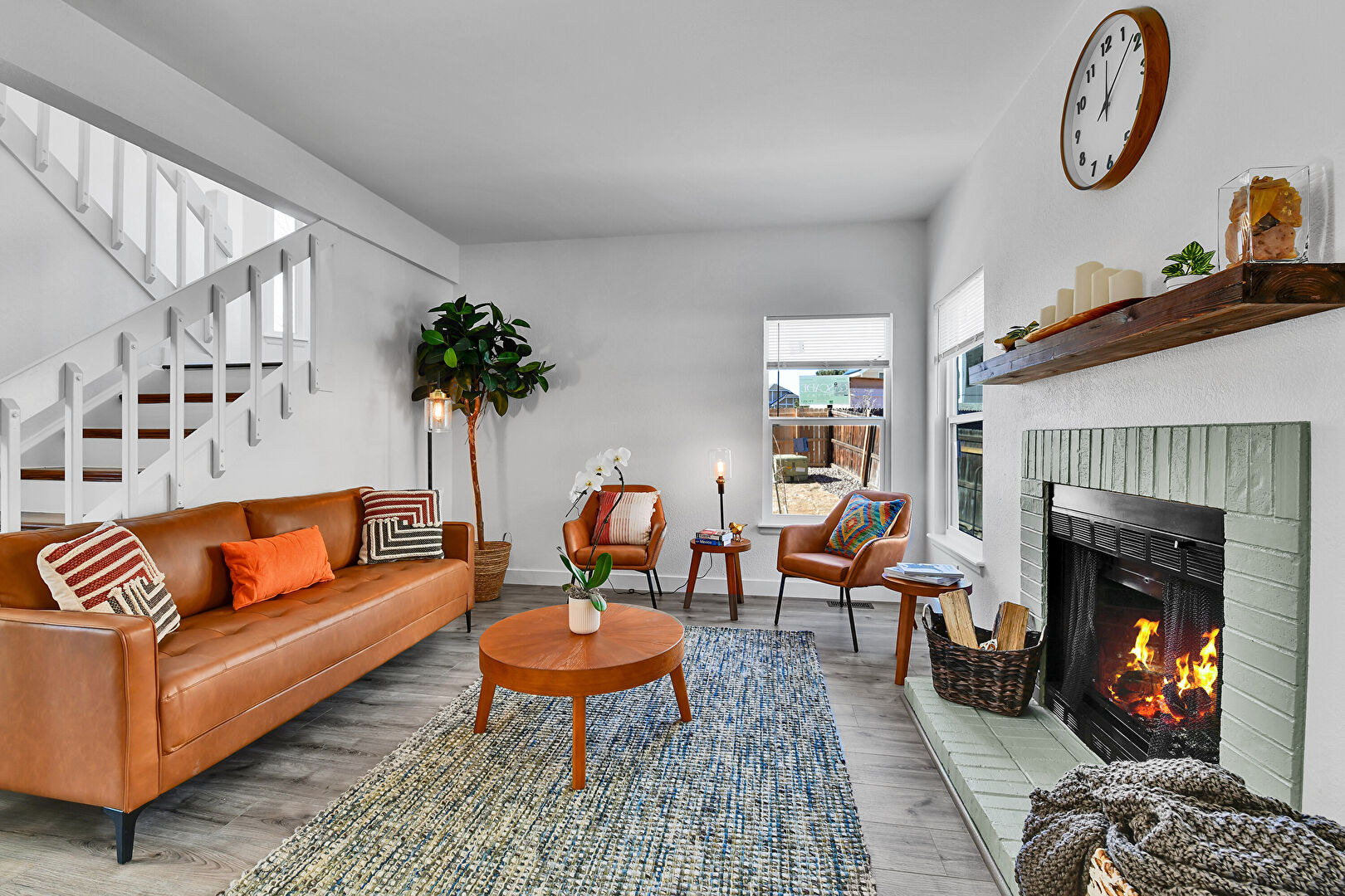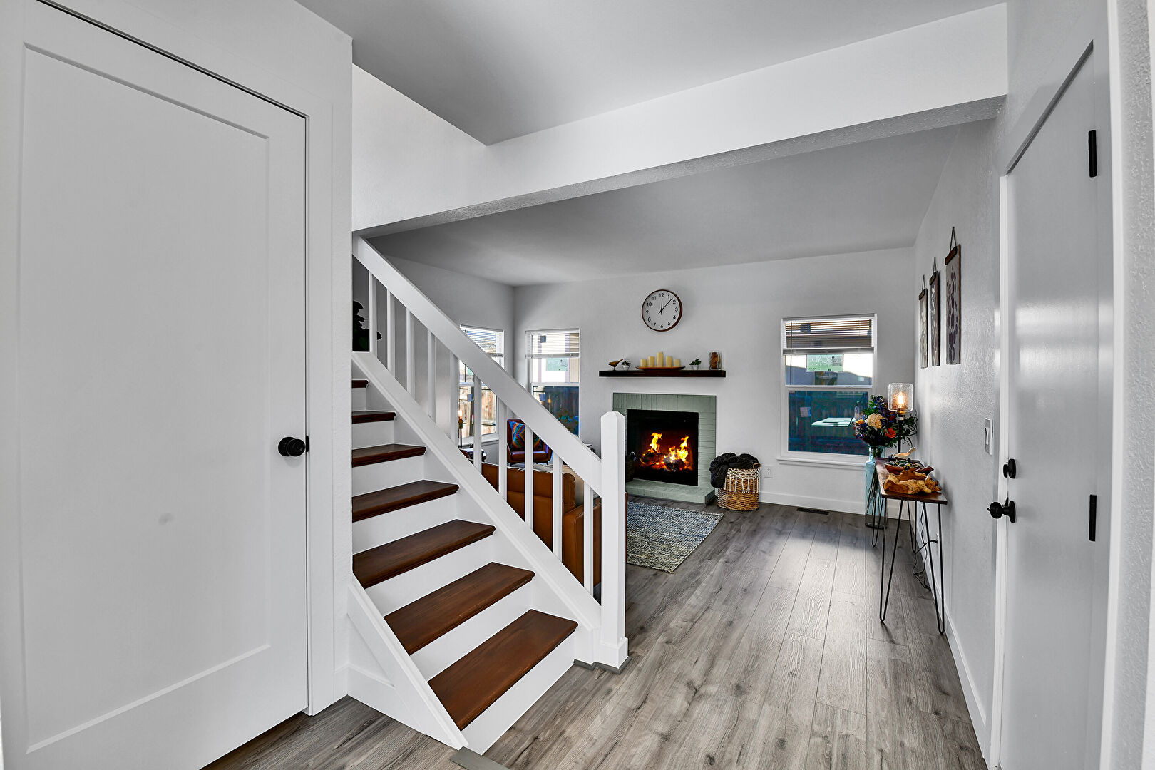 Baseboards Wall, Drywall, Natural Light, Stairs, Wood Finish Floor, Fireplace