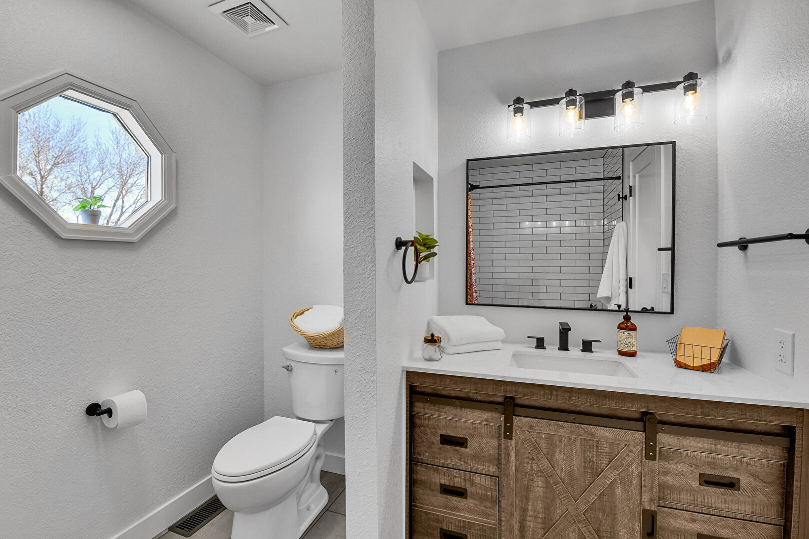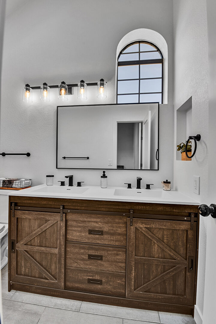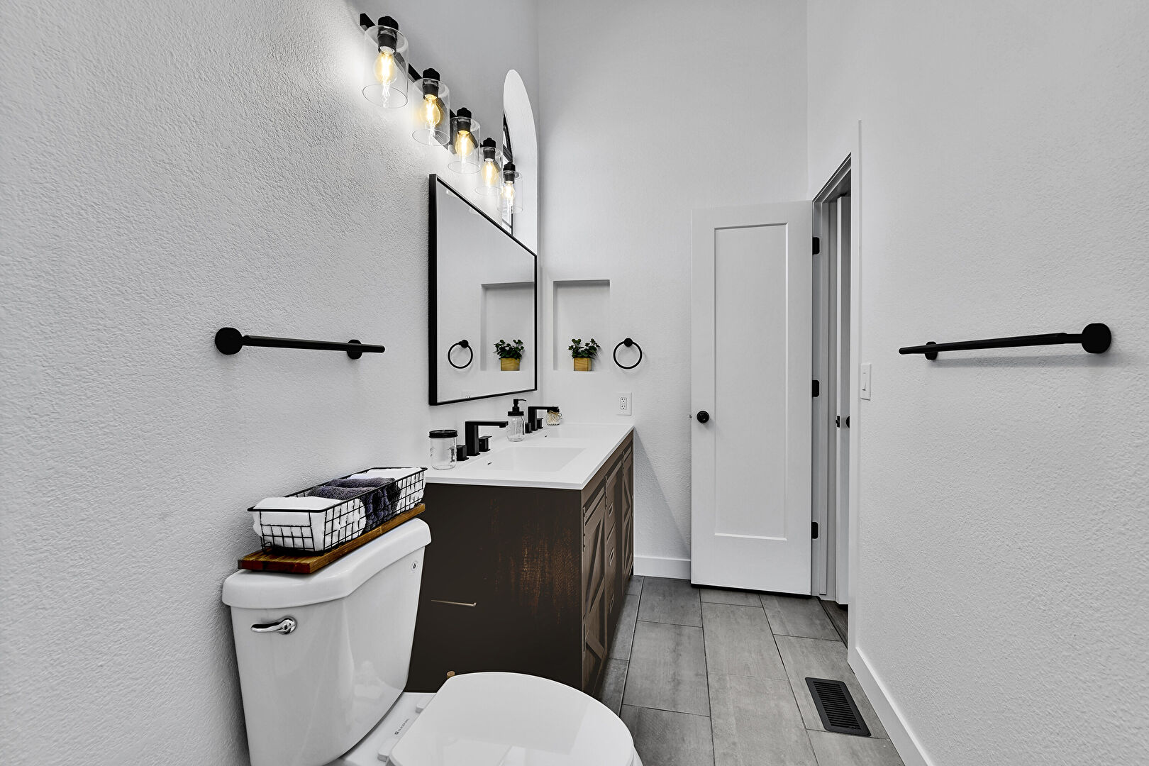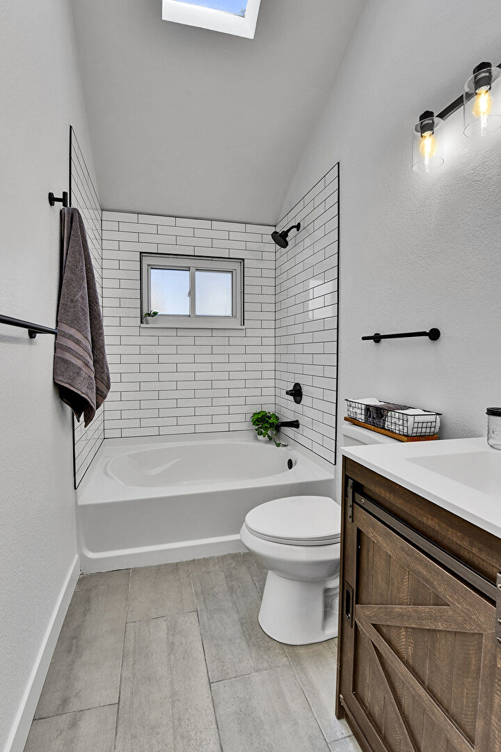 Baseboards Wall, Combined Bath Shower, Double Vanity, Drywall, Full Bathroom, Half Bathroom, Natural Light, Skylight, Textured Wall, Tile Floor, Vanity, Vaulted Ceiling, Vent, Wood Finish Floor, Combined Bath Shower, Full Bathroom, Vanity, Wood Finish Floor