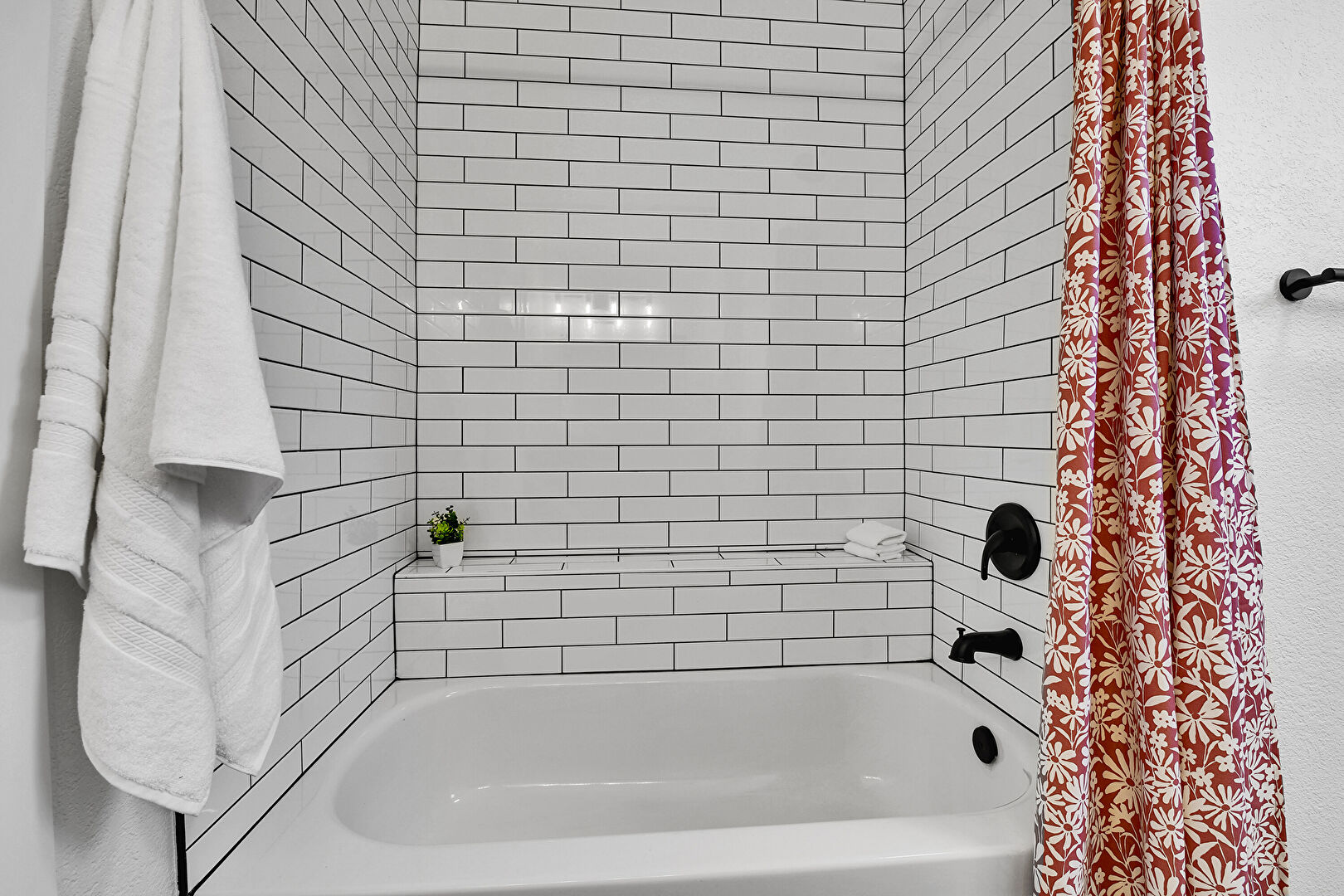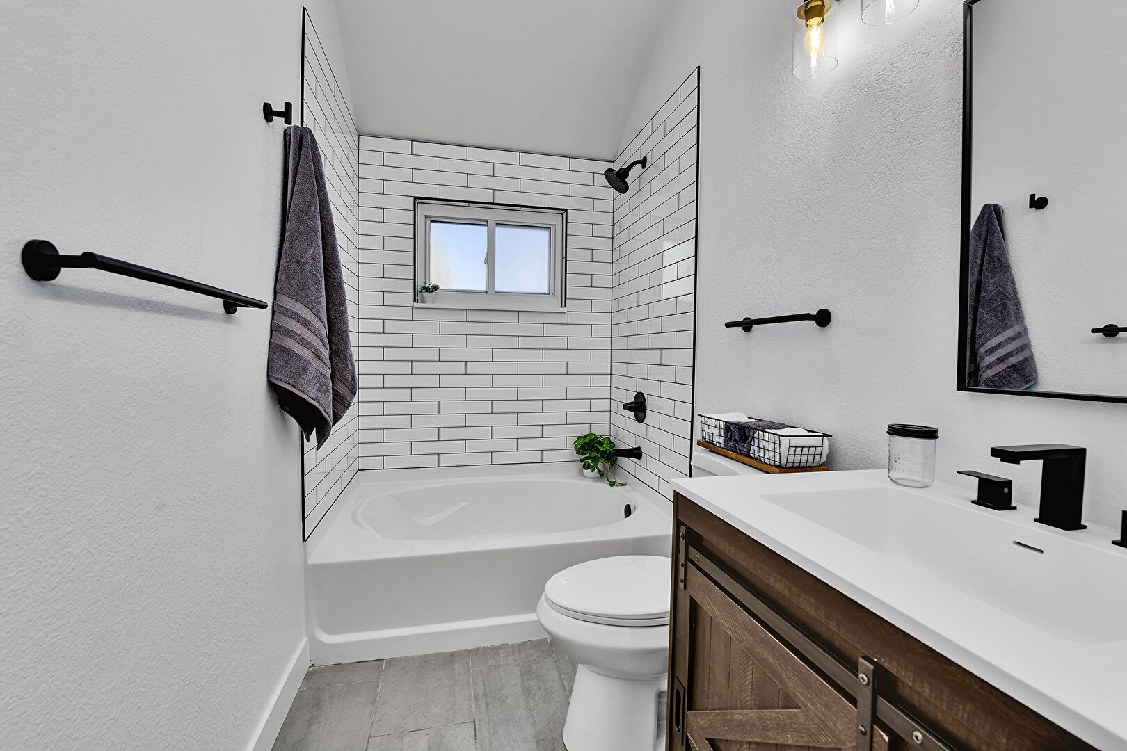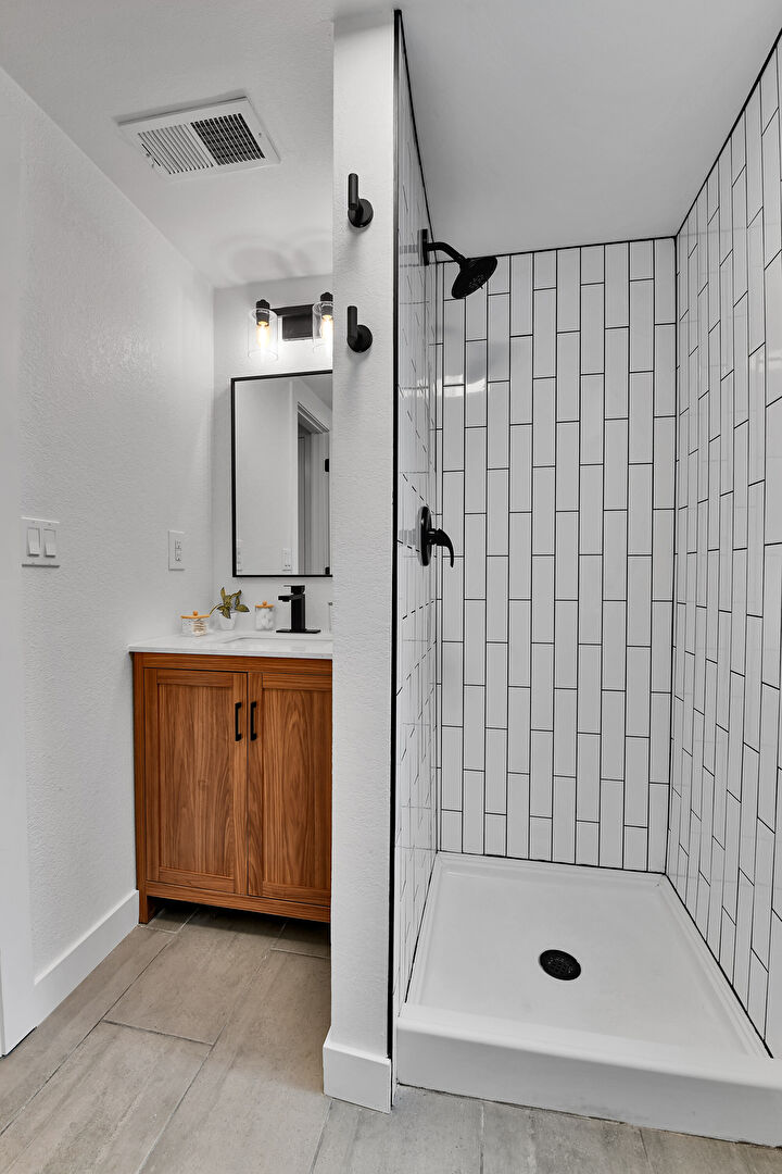 Baseboards Wall, Drywall, Full Bathroom, Natural Light, Notable Chandelier, Textured Wall, Vanity, Vent, Wood Finish Floor, Baseboards Wall, Combined Bath Shower, Tile Floor