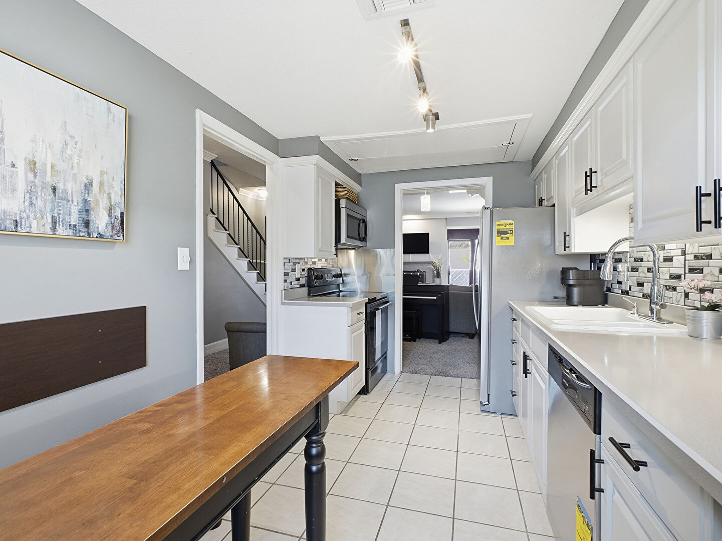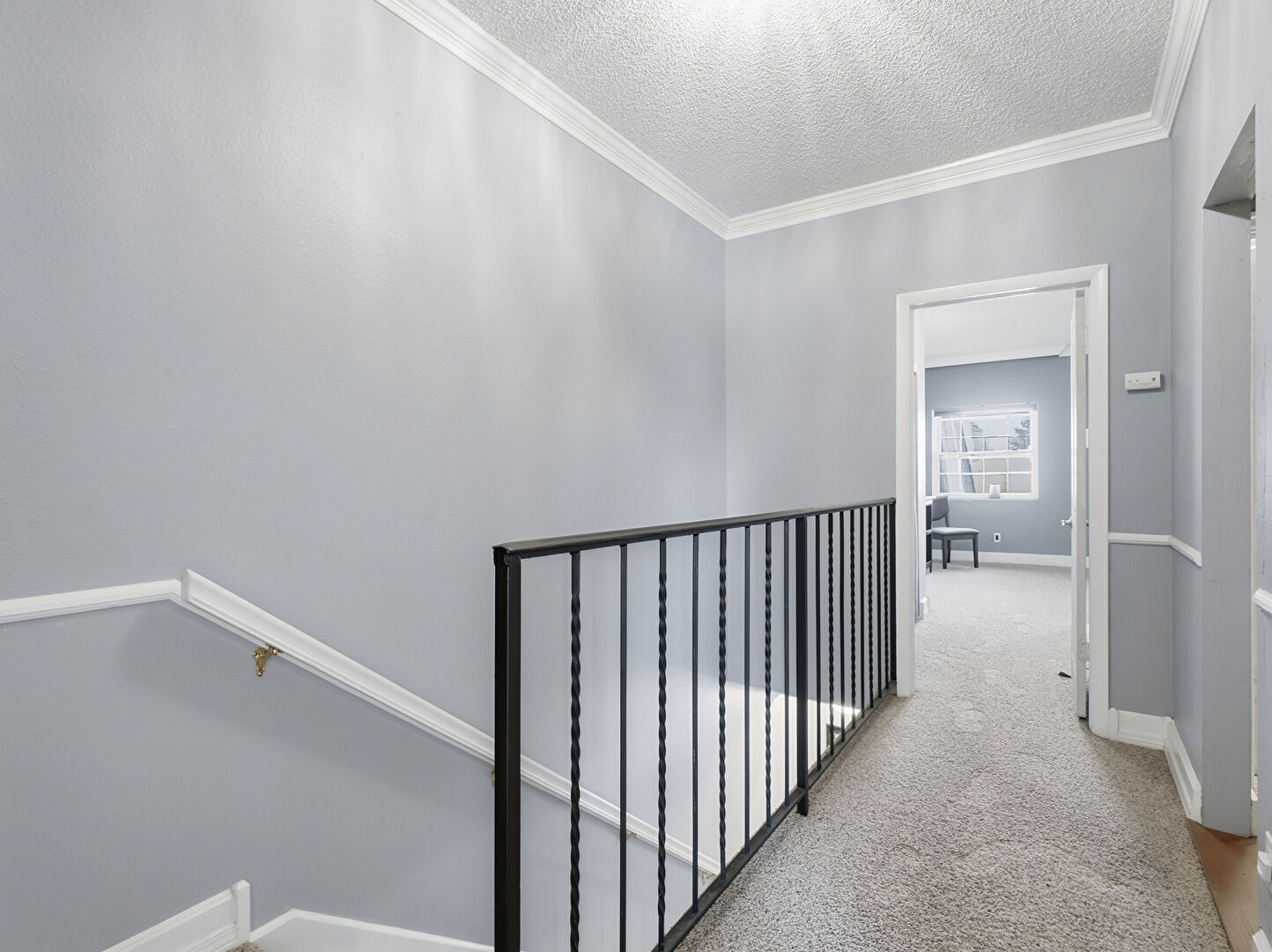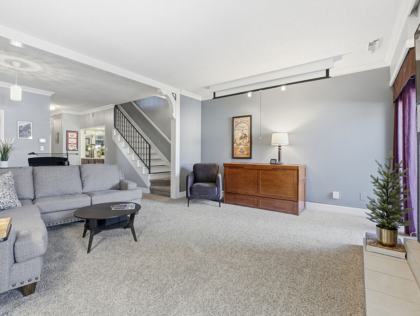 Baseboards Wall, Carpet, Crown Molding, Drywall, Stairs, Textured Ceiling, Track Lighting, Vent, Baseboards Wall, Natural Light, Textured Ceiling