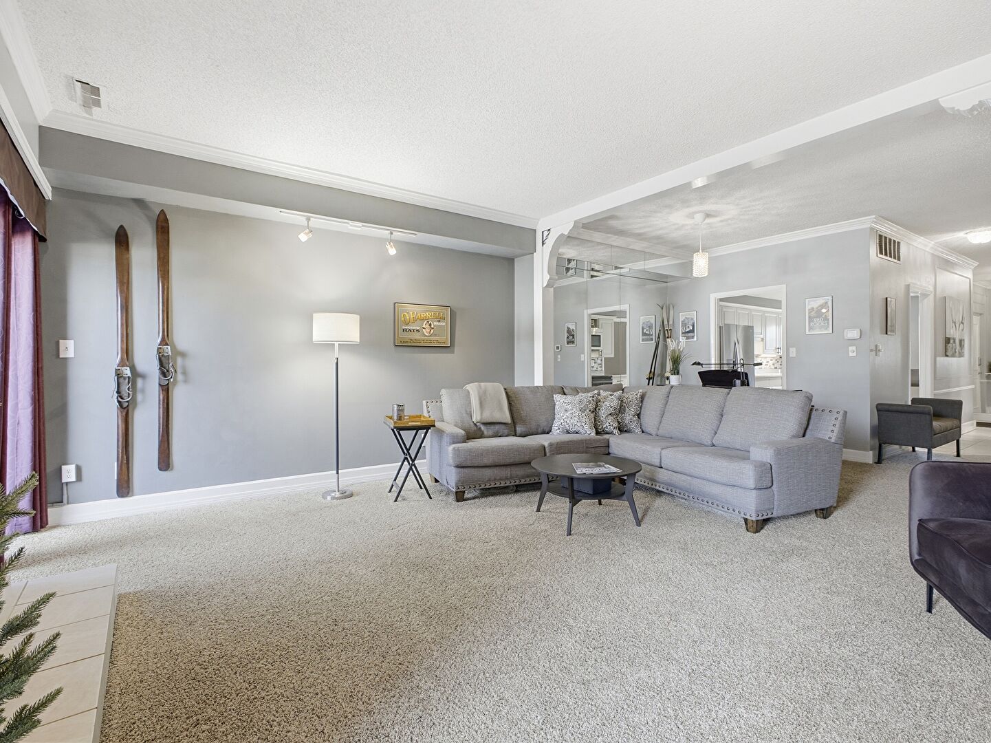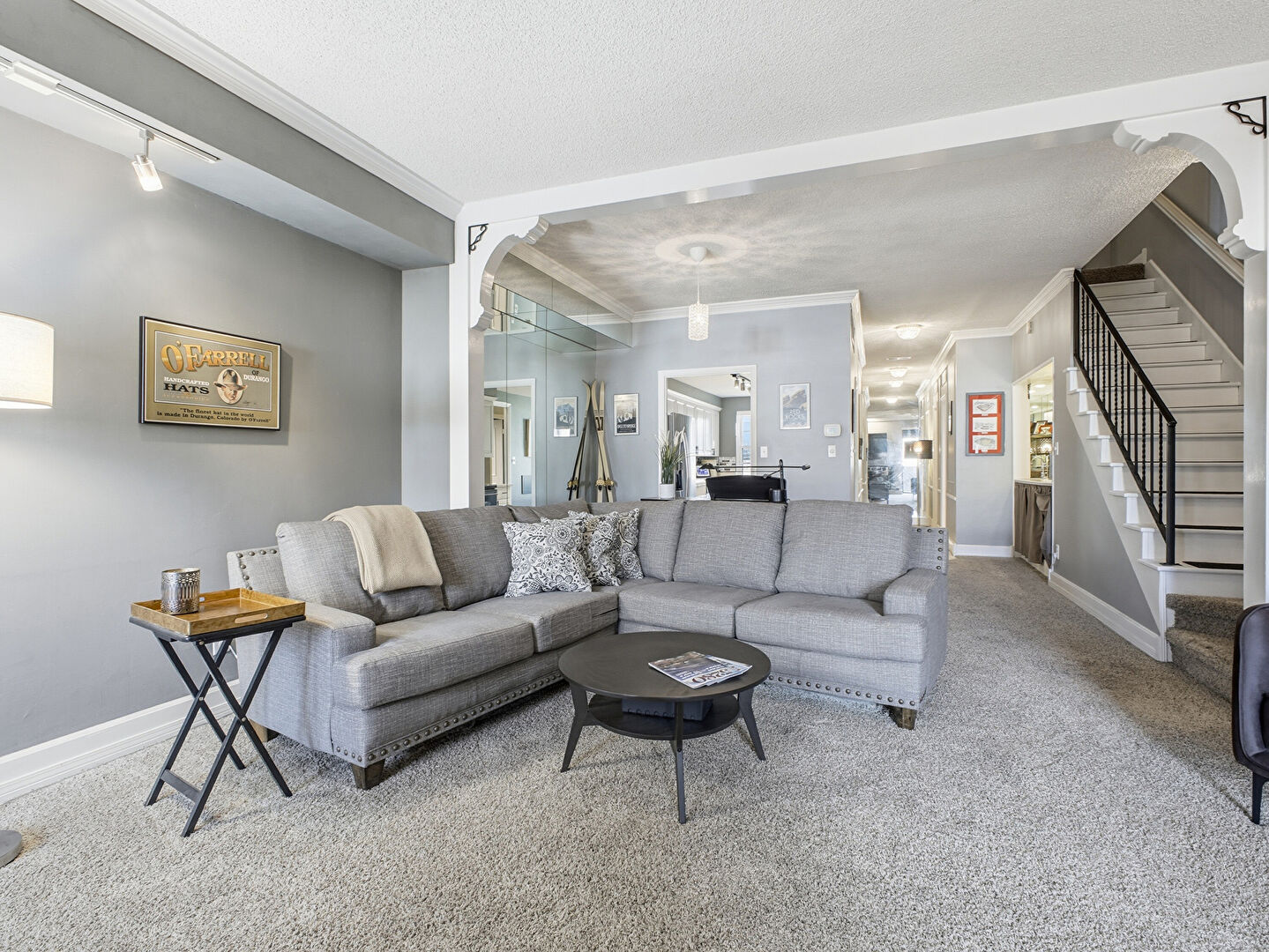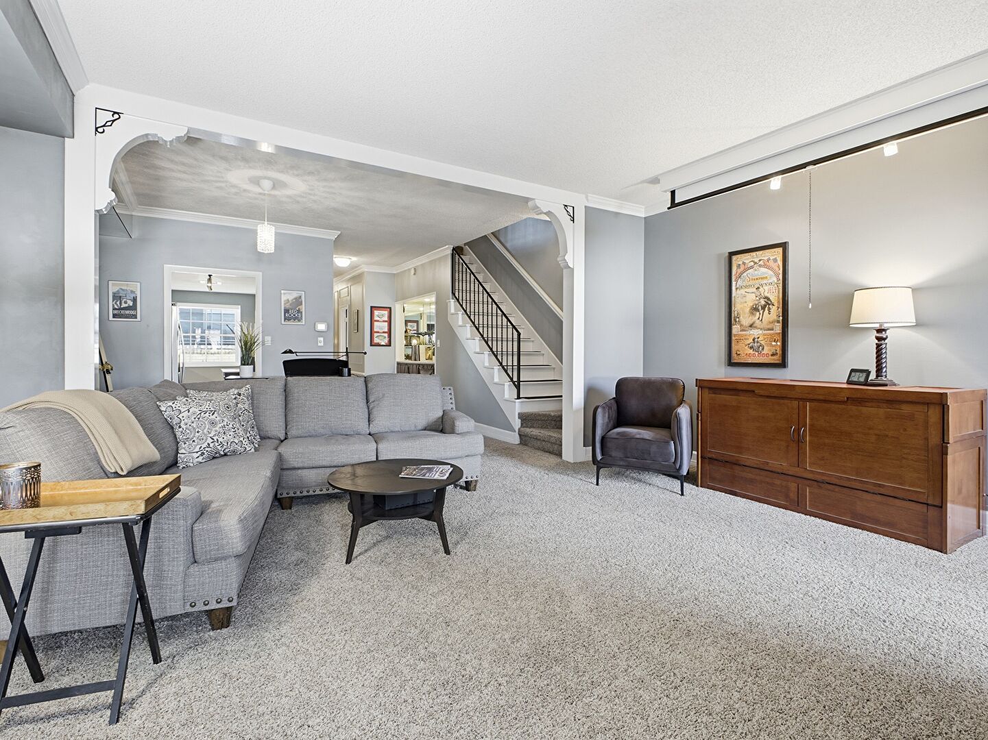 Baseboards Wall, Carpet, Crown Molding, Drywall, Fireplace, Natural Light, Stairs, Textured Ceiling, Track Lighting, Vent, Arched Walkways, Drywall, Fireplace, Stairs, Track Lighting, Vent