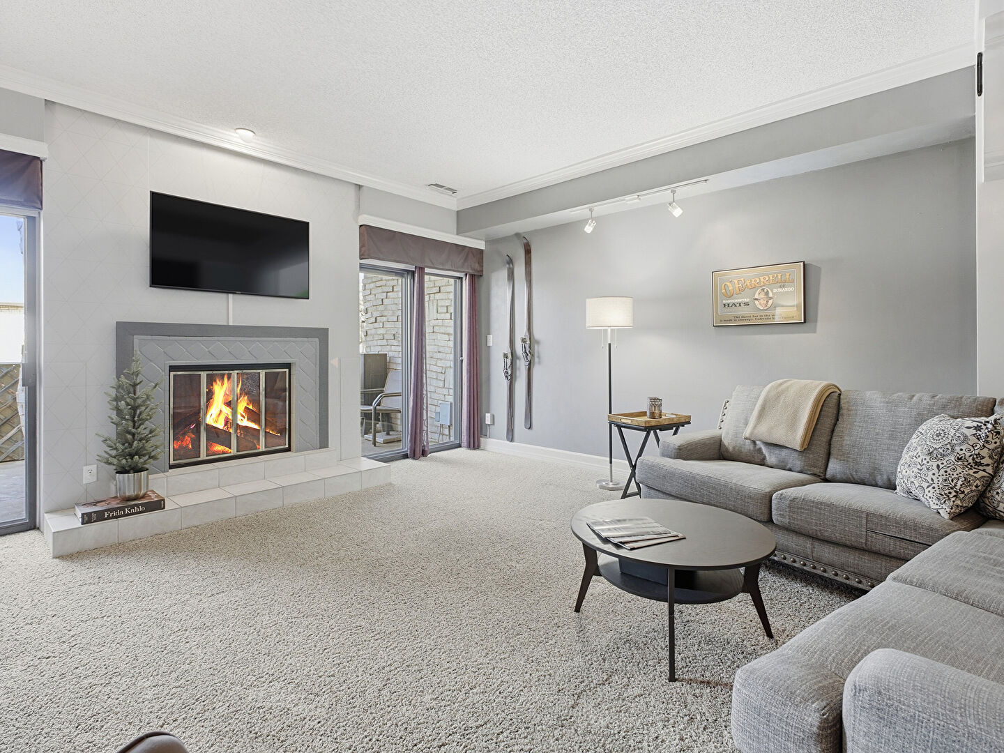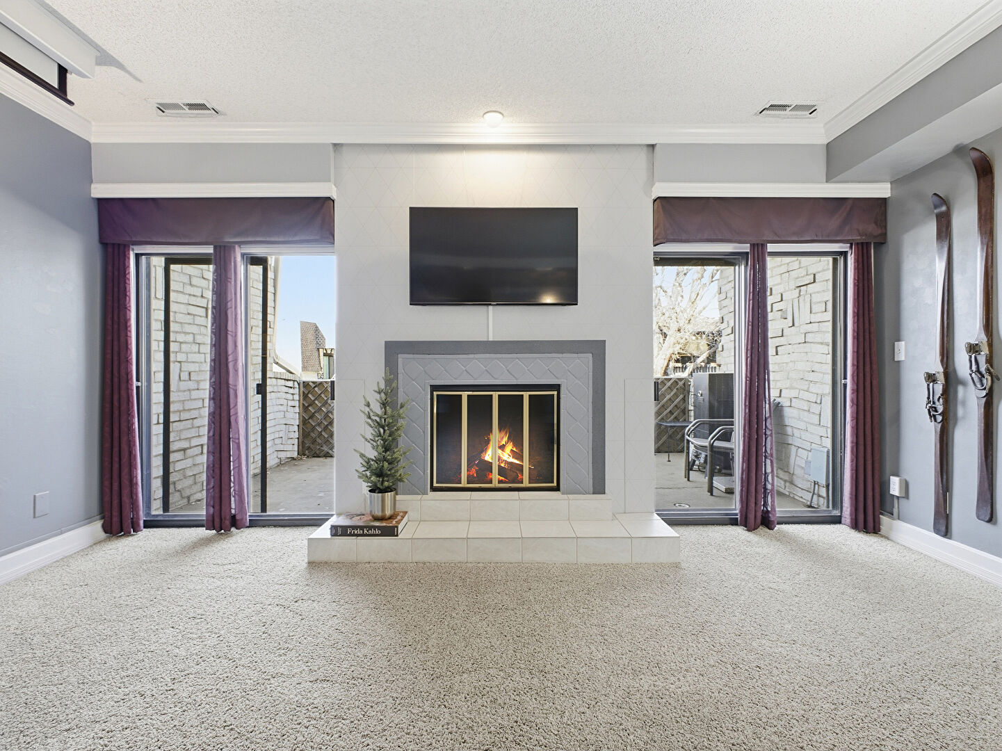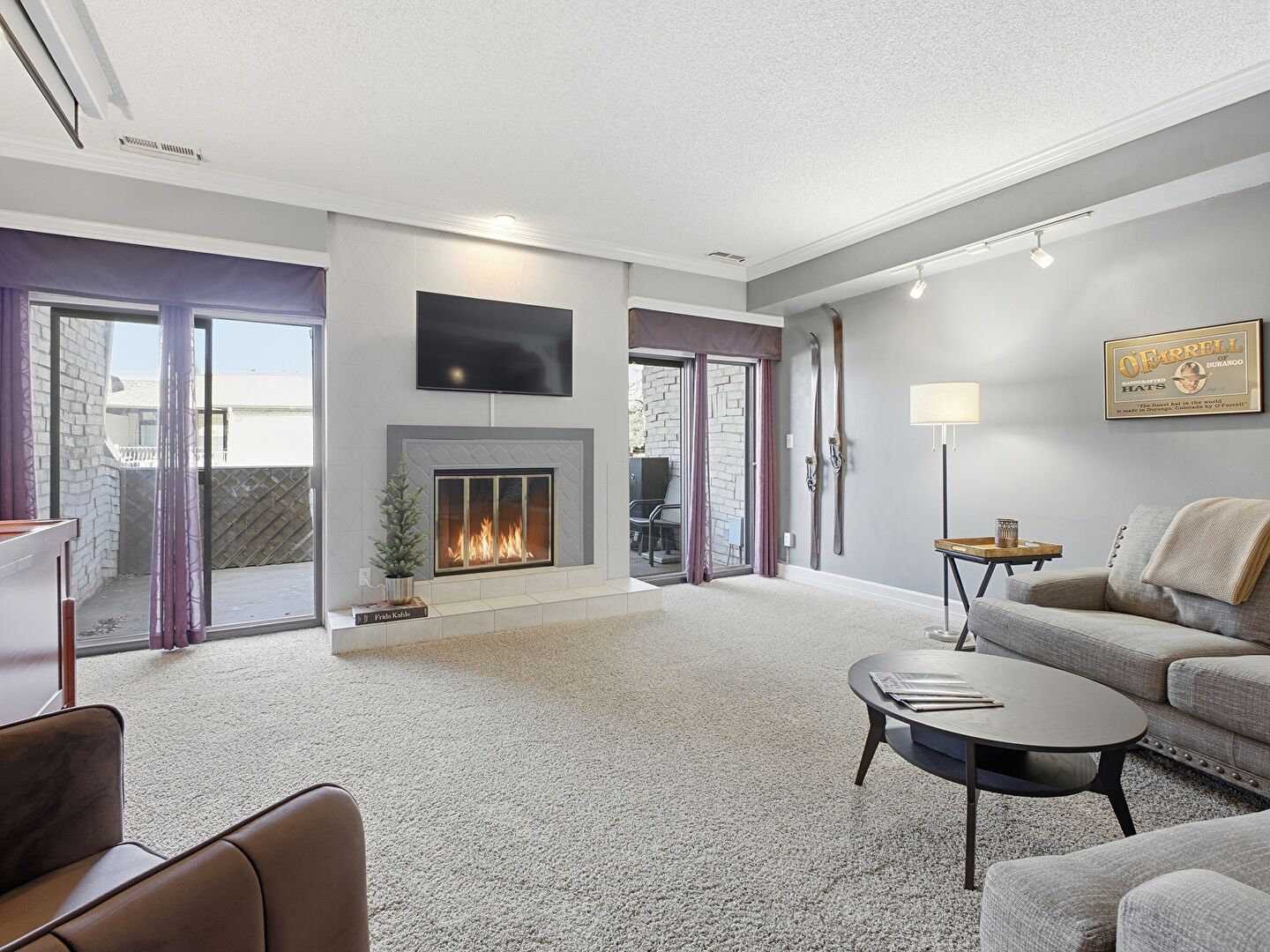 Baseboards Wall, Carpet, Crown Molding, Drywall, Fireplace, Natural Light, Stairs, Textured Ceiling, Track Lighting, Vent, Arched Walkways, Drywall, Fireplace, Stairs, Track Lighting, Vent