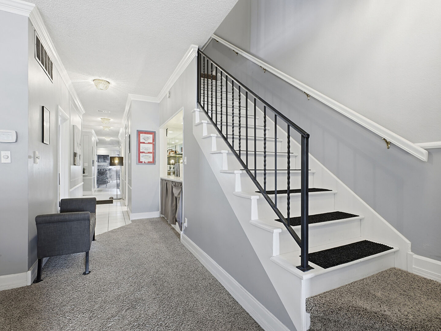 Baseboards Wall, Carpet, Crown Molding, Drywall, Stairs, Vent, Textured Ceiling