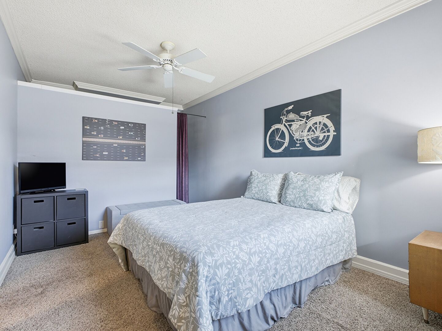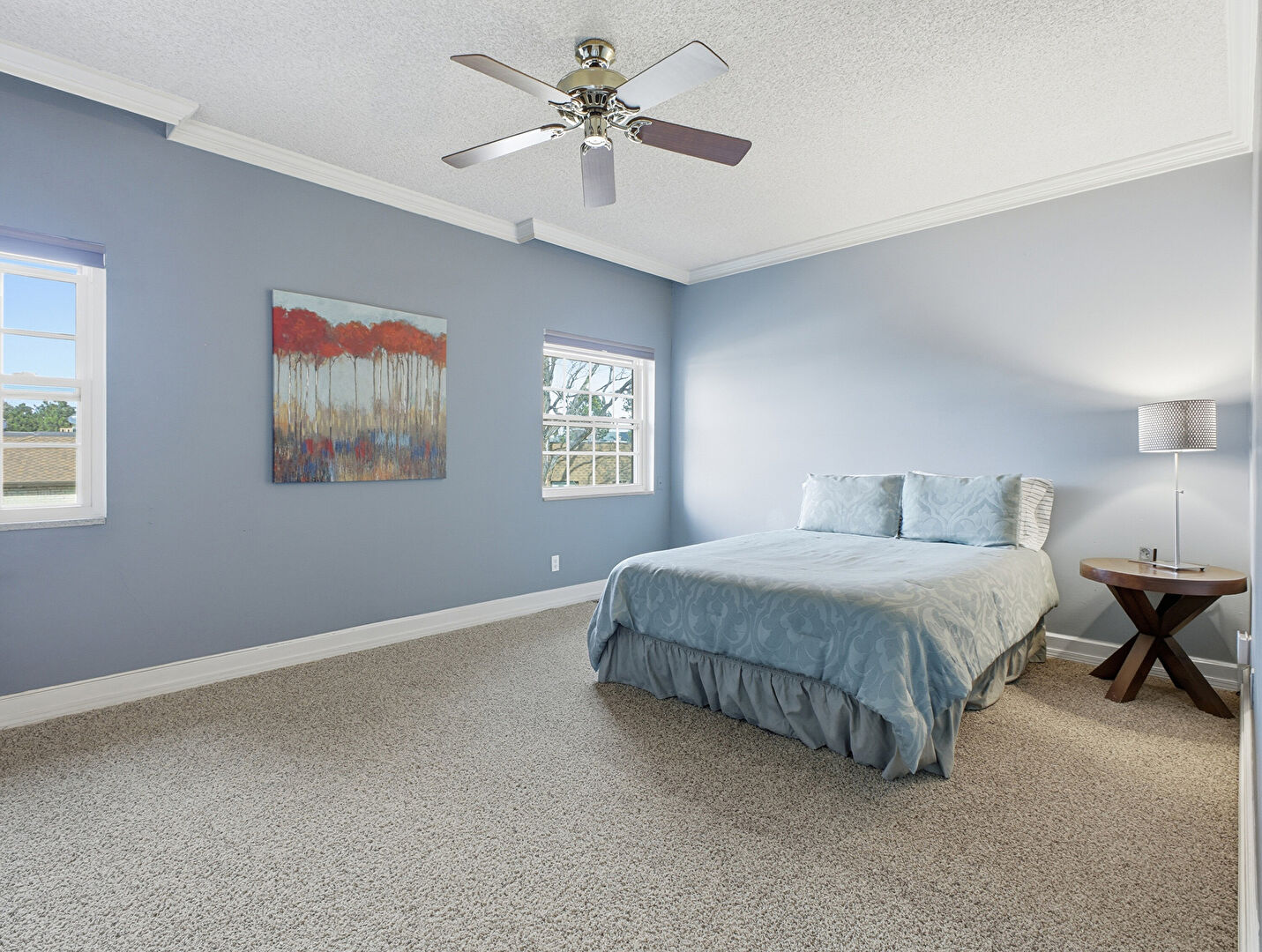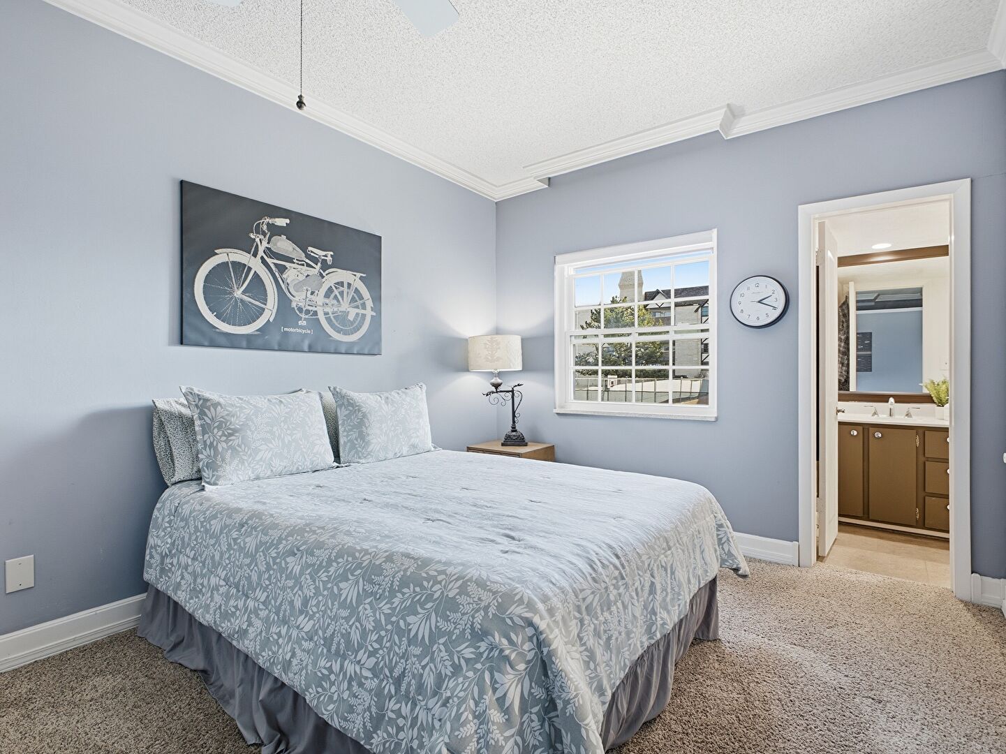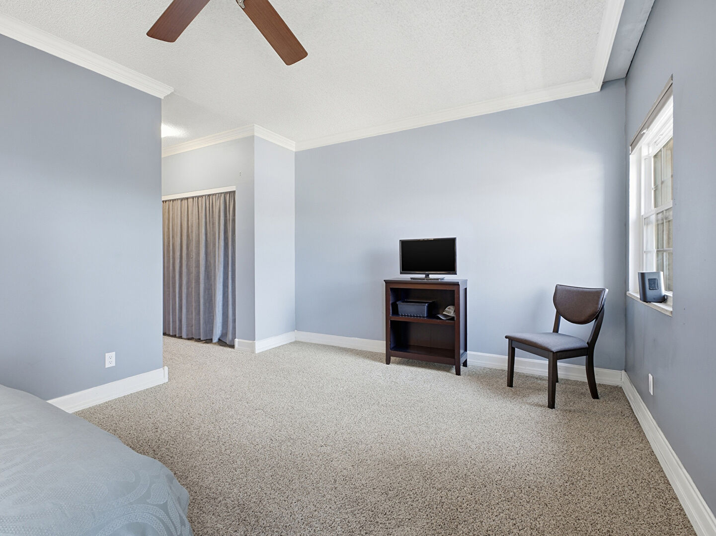 Baseboards Wall, Carpet, Ceiling Fan, Crown Molding, Drywall, Ensuite Bathroom, Natural Light, Textured Ceiling, Baseboards Wall, Carpet, Ceiling Fan, Crown Molding, Drywall