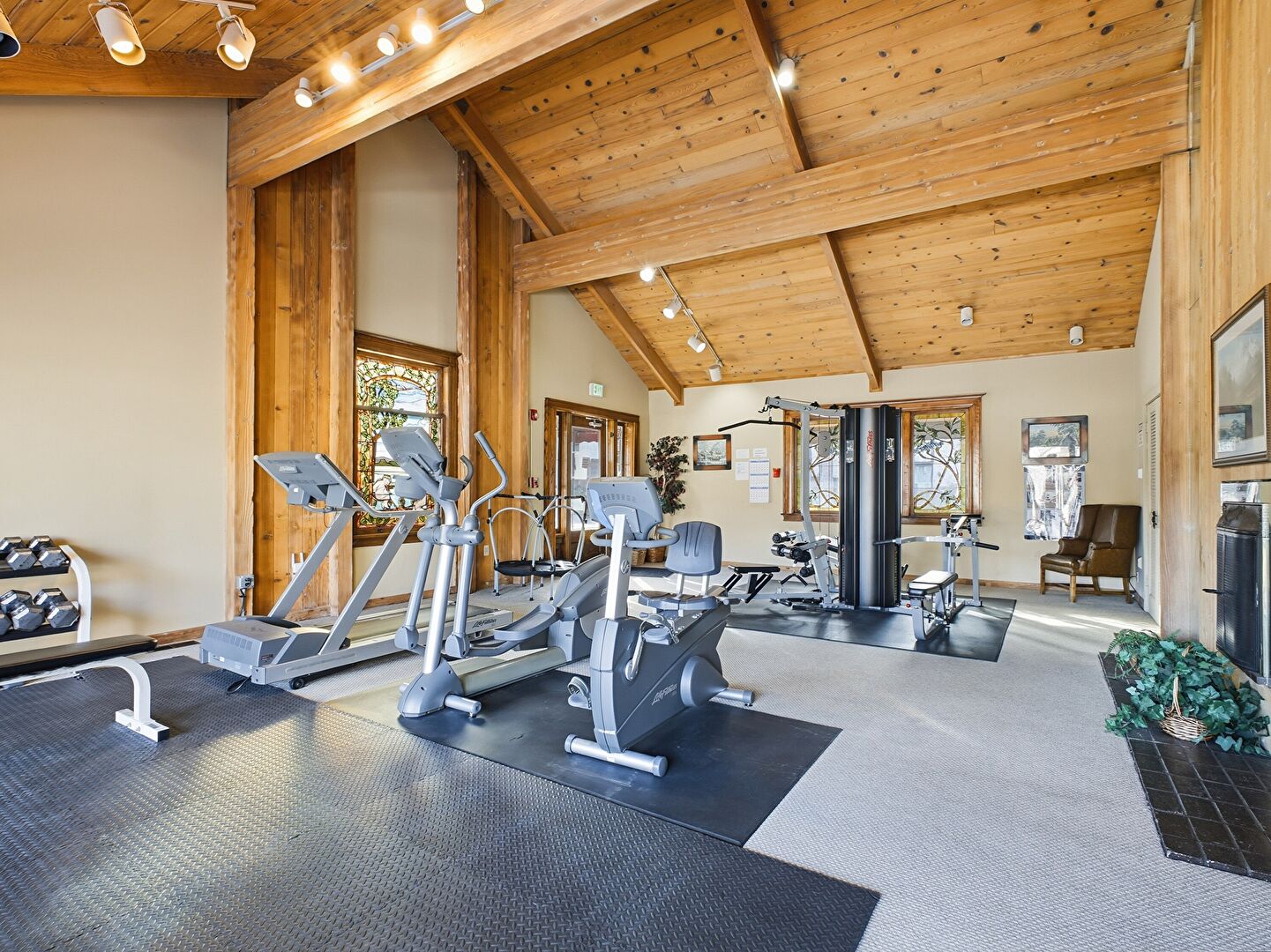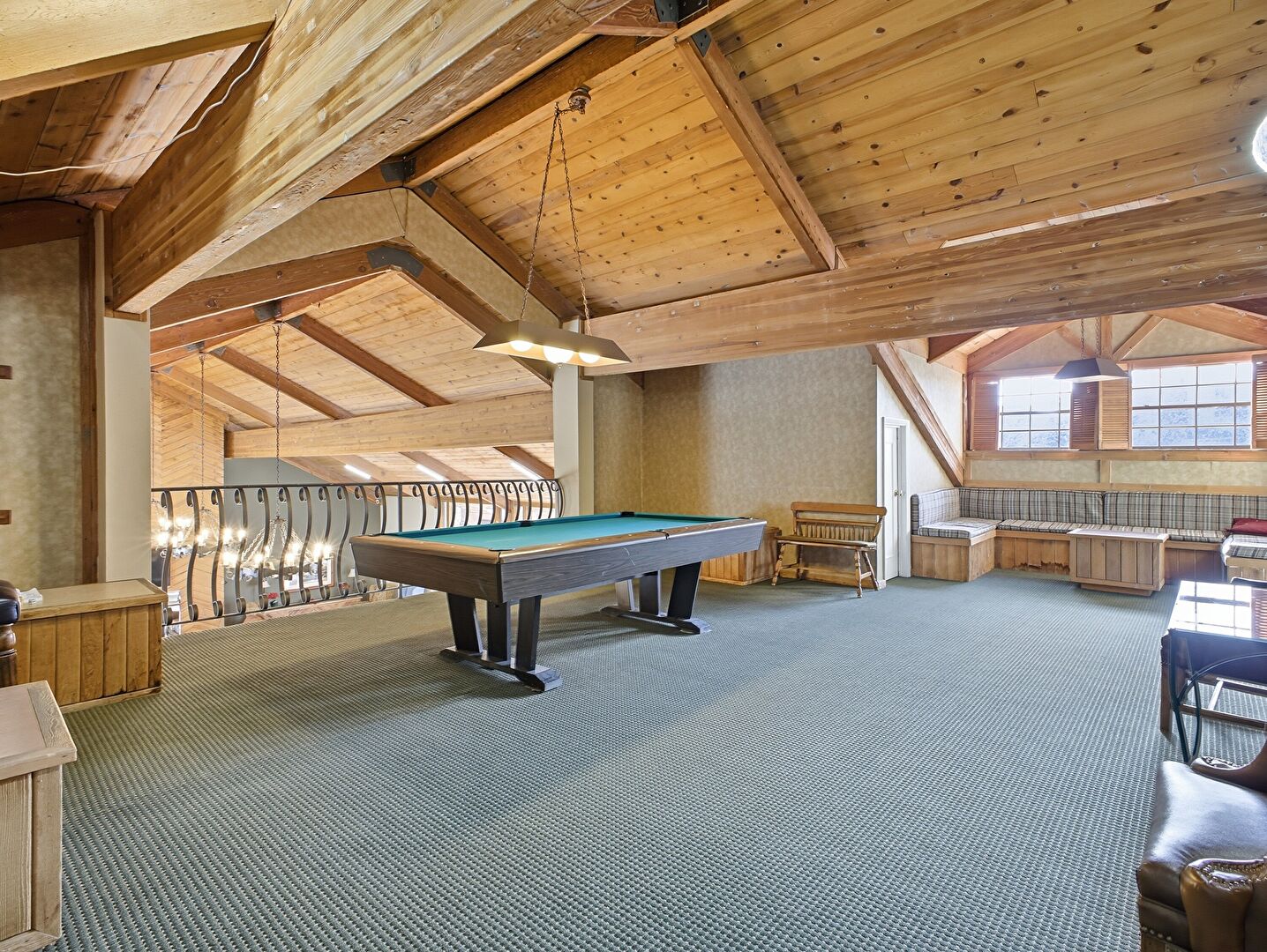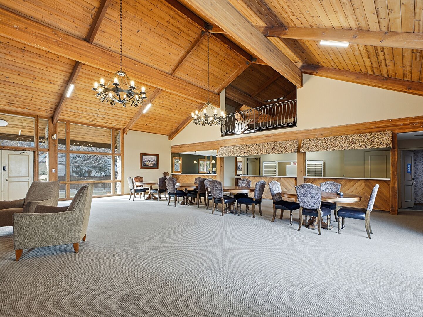 Baseboards Wall, Beamed Ceiling, Carpet, Cathedral Ceiling, Drywall, High Ceiling, Natural Light, Notable Chandelier, Vaulted Ceiling, Wood Ceiling, Drywall, Tile Floor