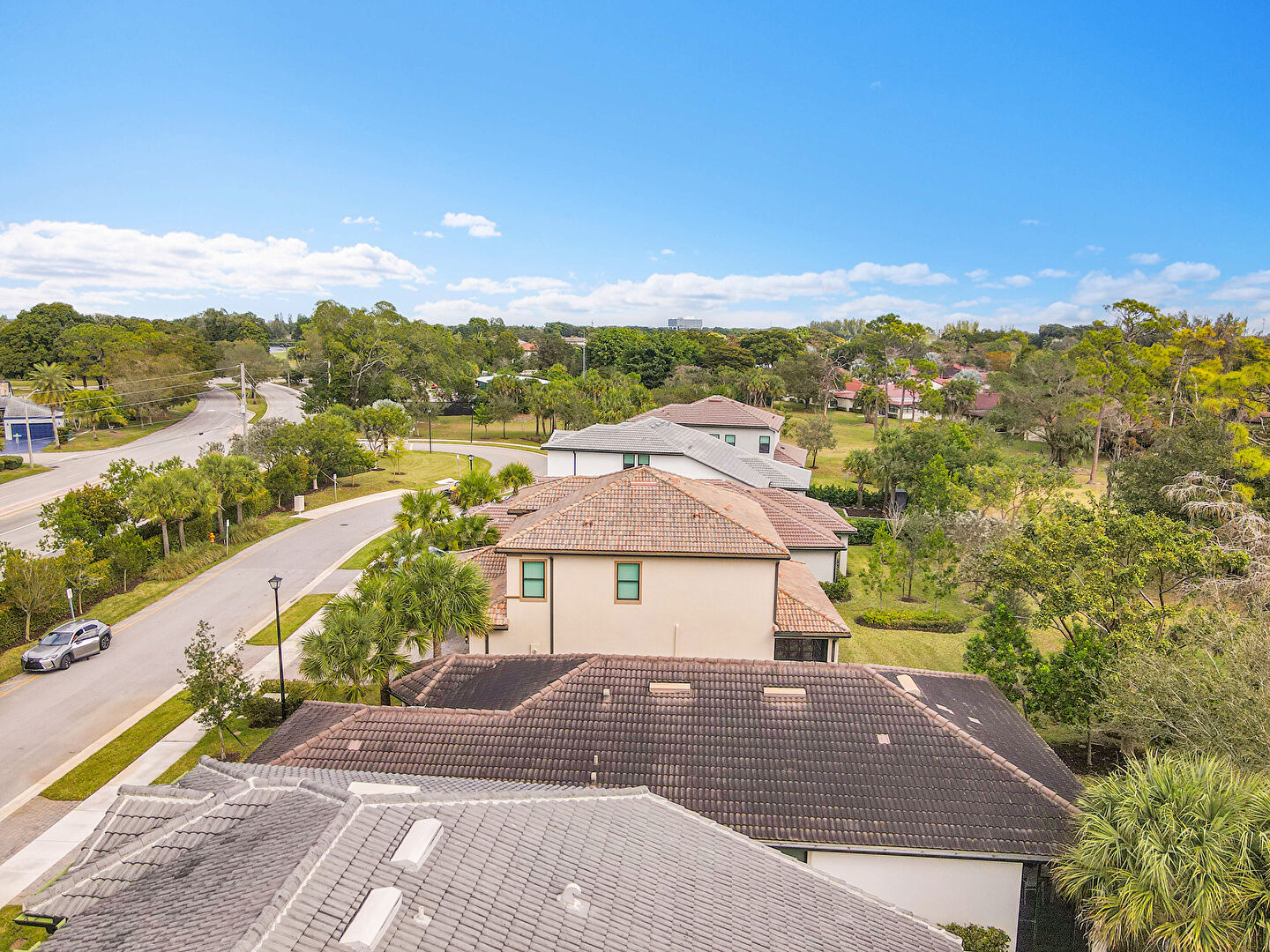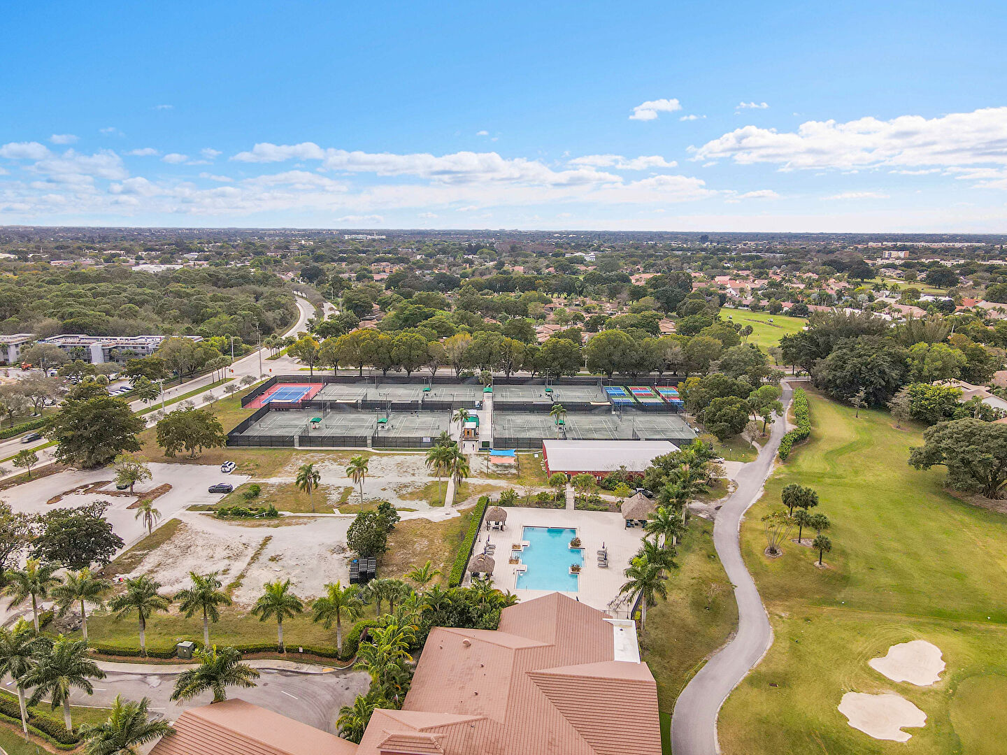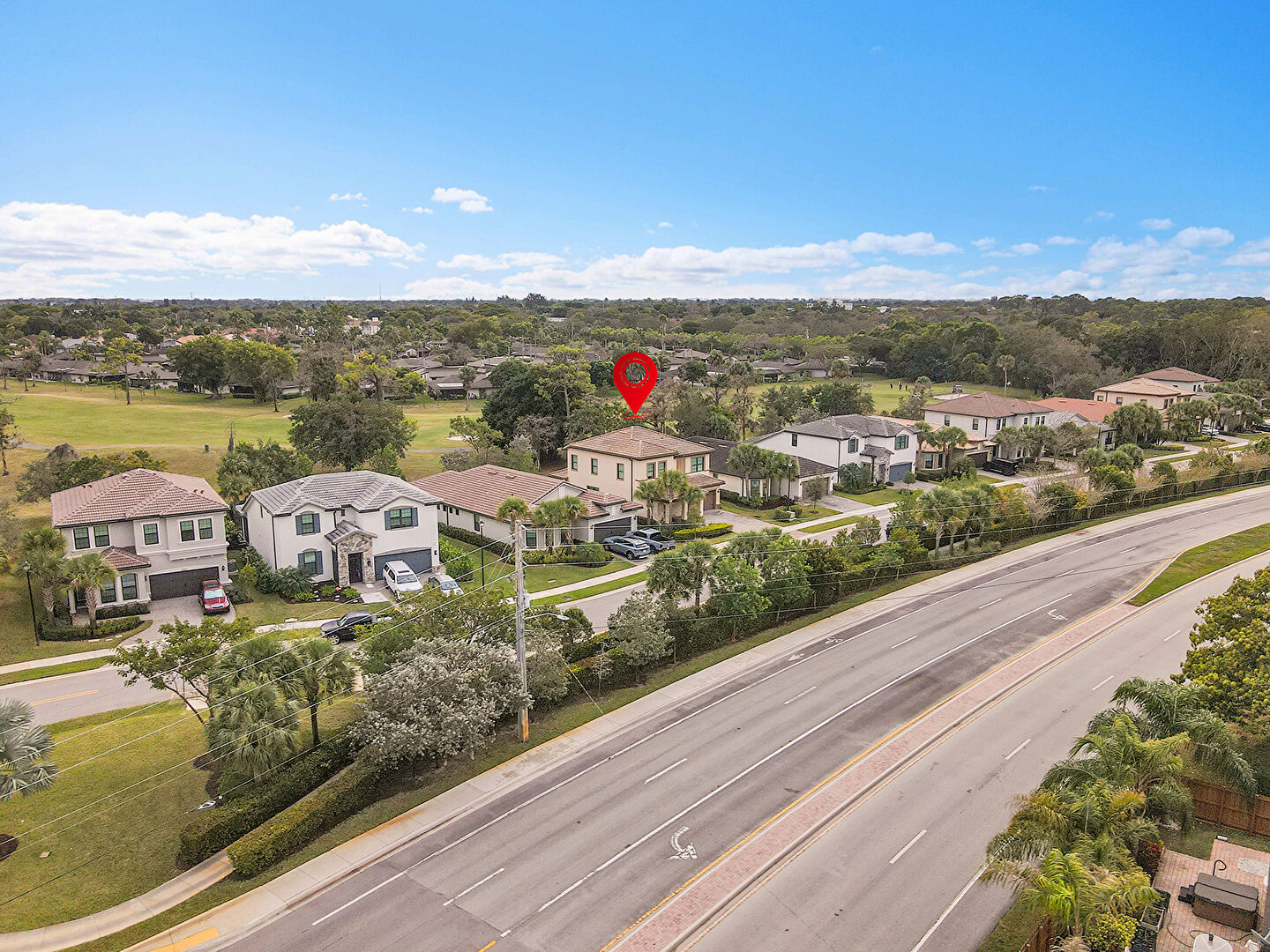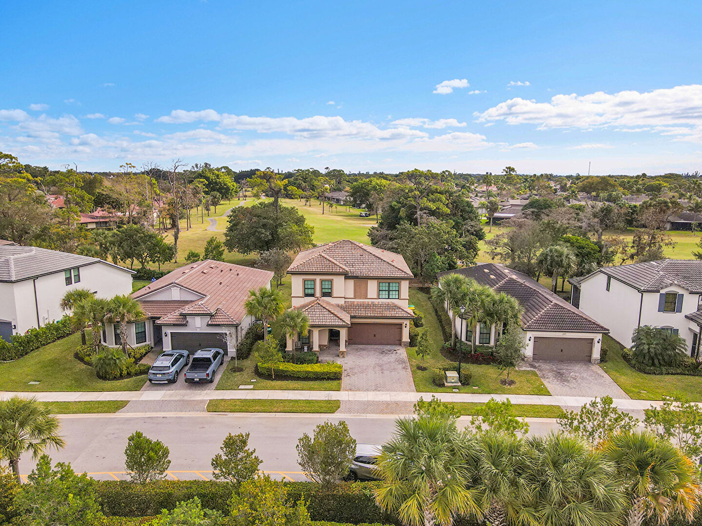 Built In Garage, Driveway, Golf Course View, Lawn, Pad Mount Transformer, Residential View, Stucco Siding, Tile Roof, Water View, Woods View, Golf Course View, Parking Lot View, Porch, Residential View, Woods View