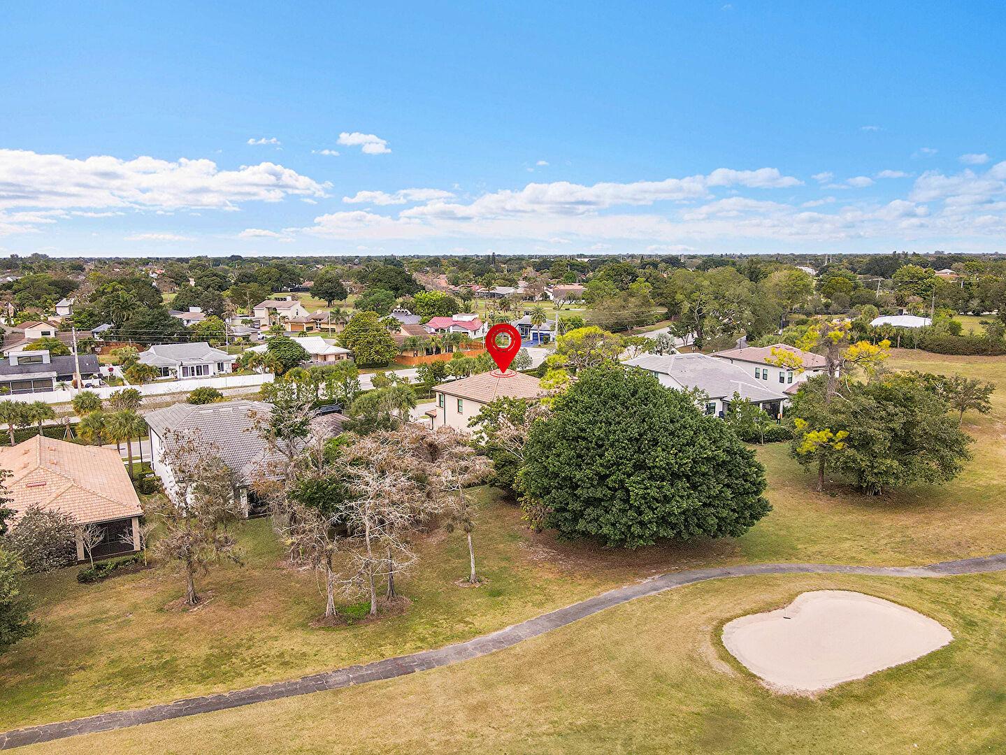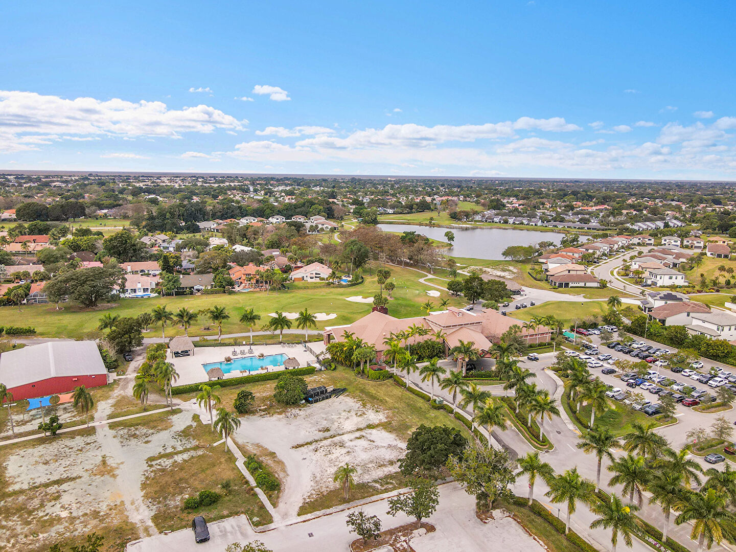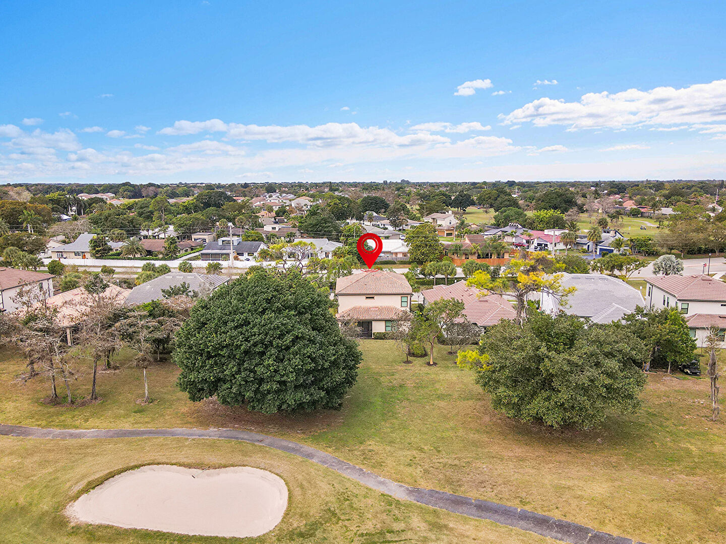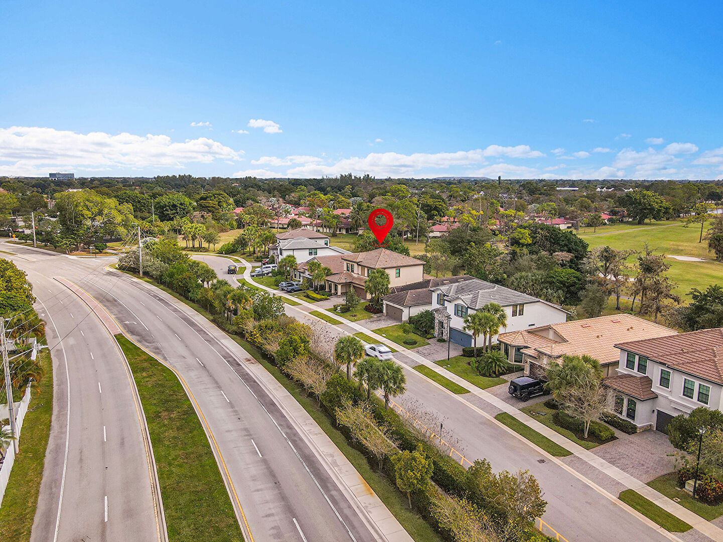 Built In Garage, Driveway, Golf Course View, Lawn, Pad Mount Transformer, Residential View, Stucco Siding, Tile Roof, Water View, Woods View, Golf Course View, Parking Lot View, Porch, Residential View, Woods View