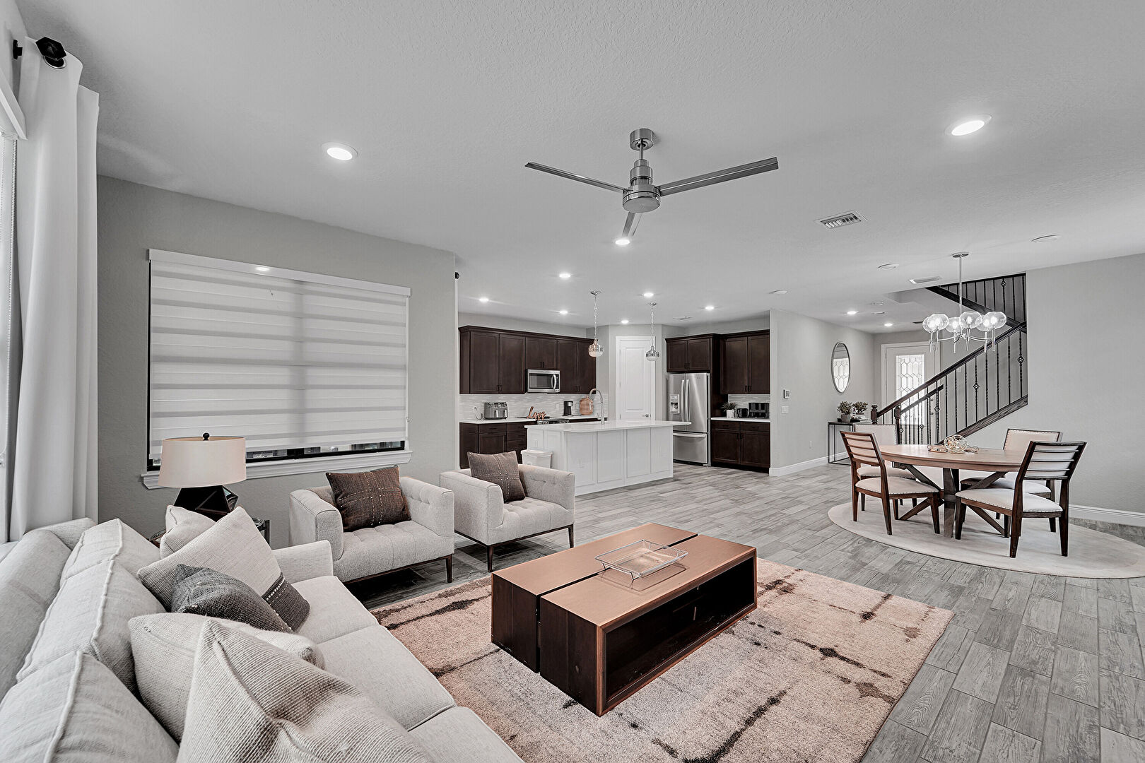 Baseboards Wall, Ceiling Fan, Drywall, L Shaped Kitchen, Natural Light, Notable Chandelier, Recessed Lighting, Vent, Wood Finish Floor, Stairs