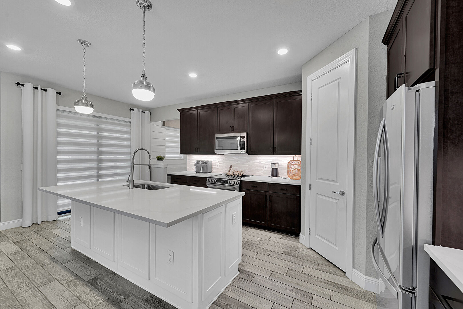 Baseboards Wall, Crown Molding Cabinets, Dark Brown Cabinets, Drywall, Kitchen Island, L Shaped Kitchen, Natural Light, Notable Chandelier, Pendant Lighting, Recessed Lighting, Shaker Cabinets, Stone Countertops, Vent, Wood Finish Floor, Crown Molding Cabinets, Dark Brown Cabinets, Wood Finish Floor
