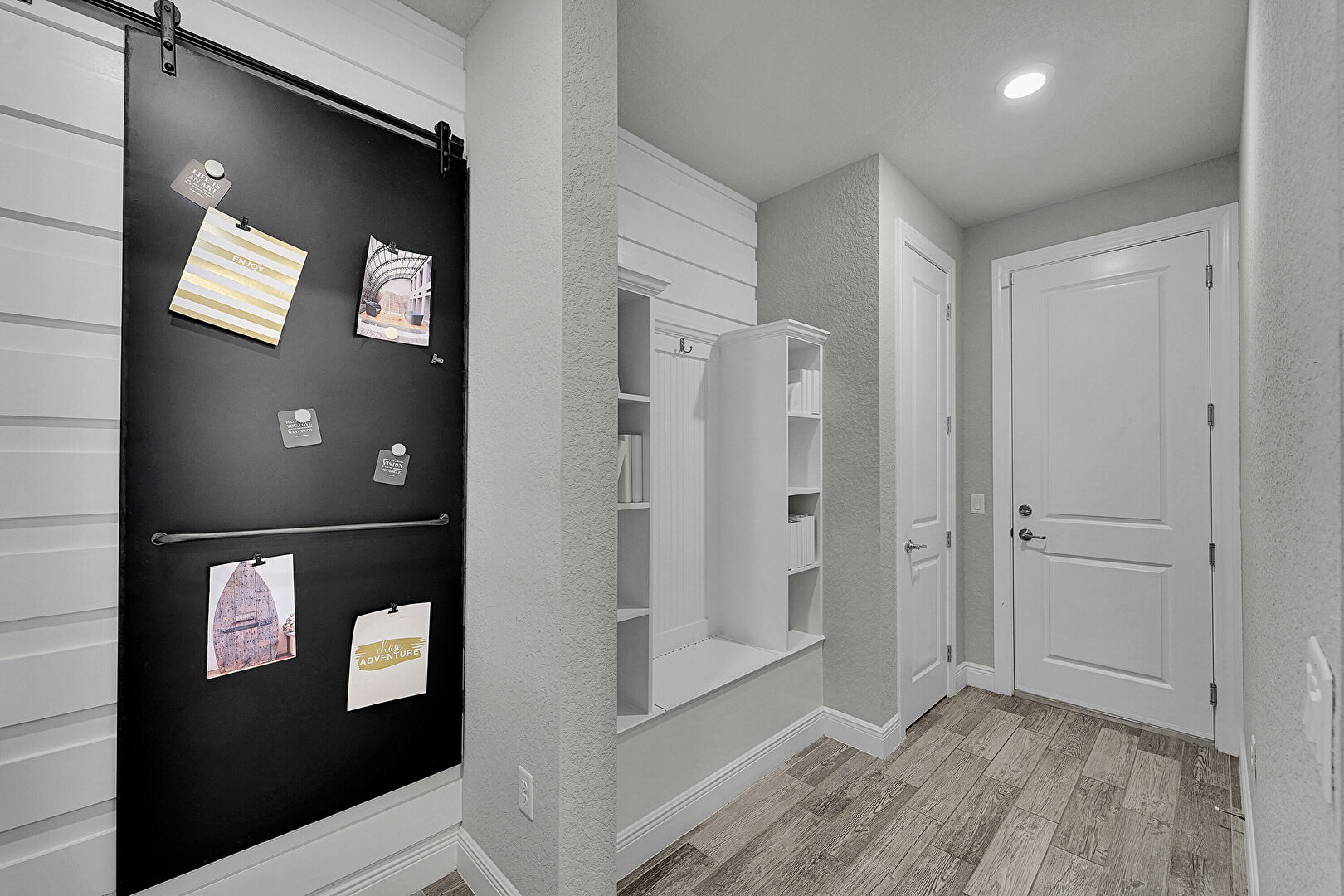 Barn Door, Baseboards Wall, Textured Wall, Wood Finish Floor, Recessed Lighting