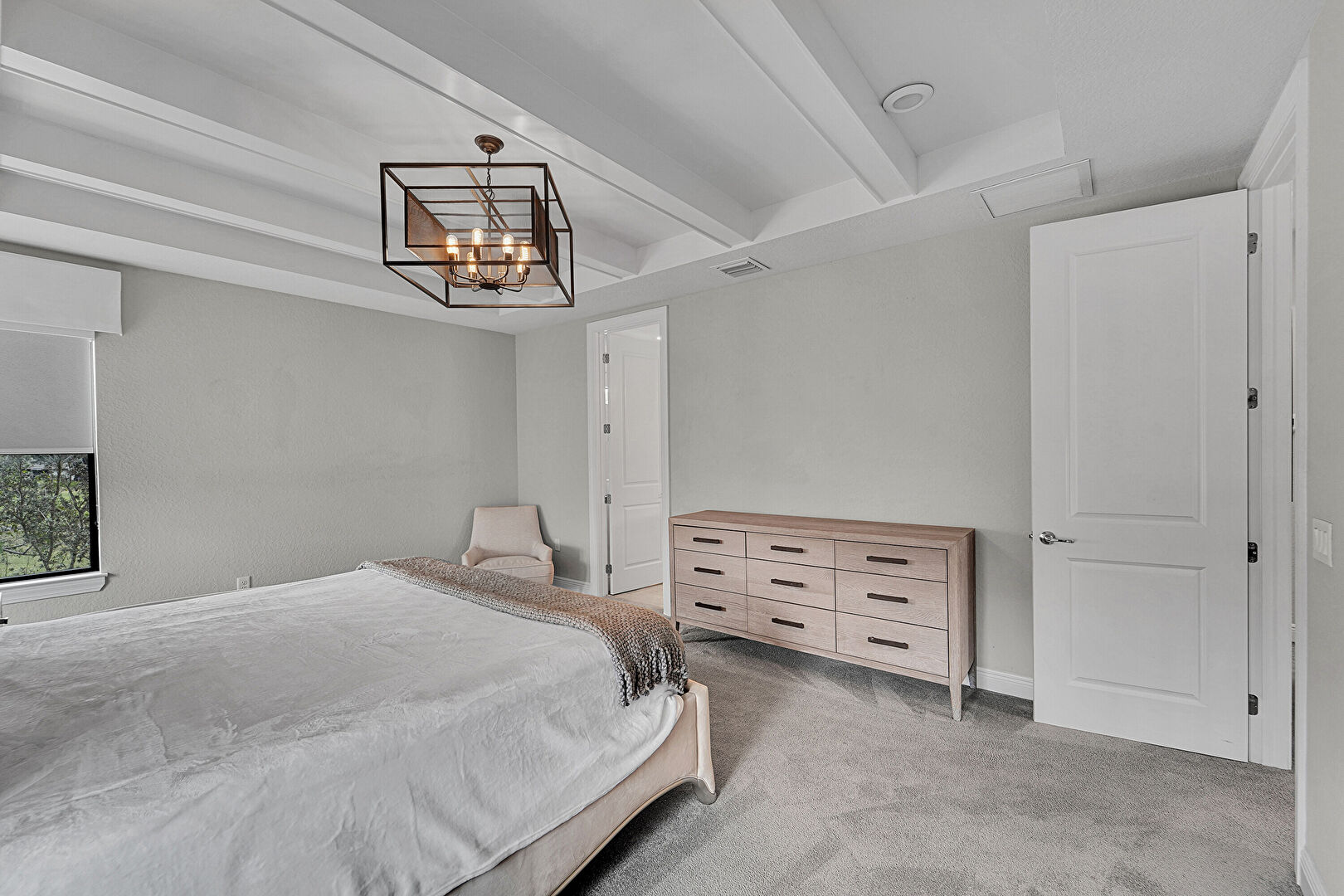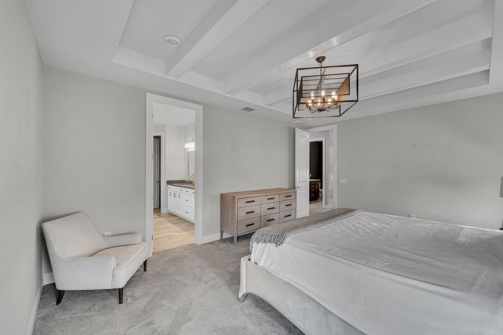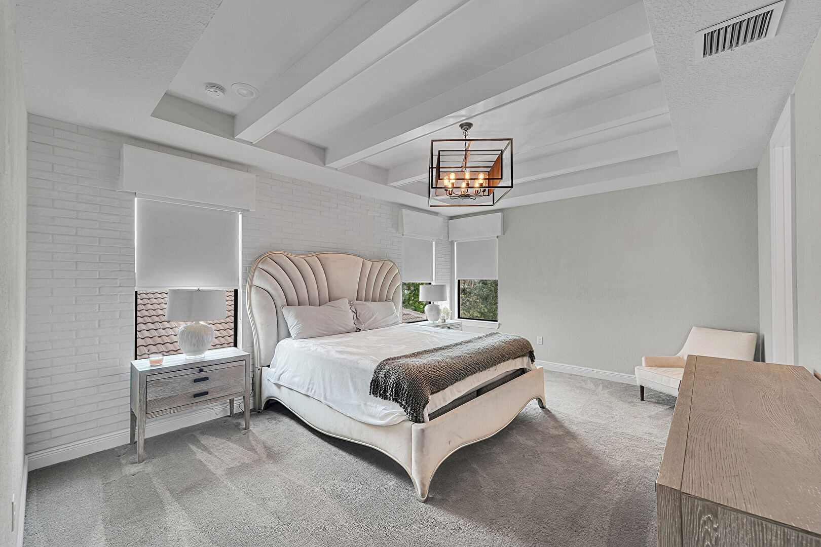 Accent Wall, Baseboards Wall, Beamed Ceiling, Brick Wall, Carpet, Drywall, Ensuite Bathroom, Natural Light, Notable Chandelier, Textured Ceiling, Tray Ceiling, Vent, Beamed Ceiling, Carpet