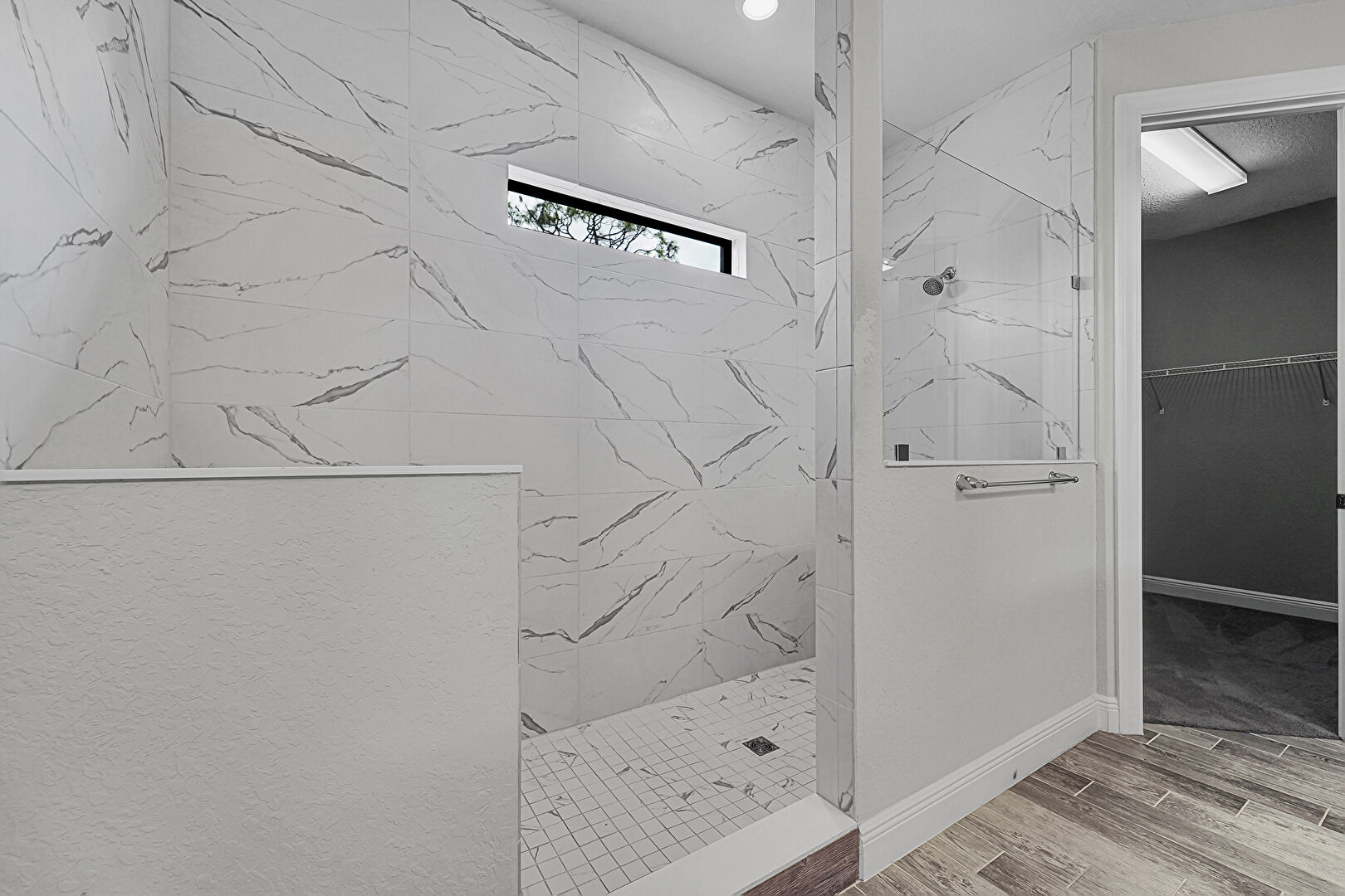Baseboards Wall, Double Vanity, Drywall, Full Bathroom, Natural Light, Recessed Lighting, Walk In Closet, Wood Finish Floor, Textured Wall, Wood Finish Floor