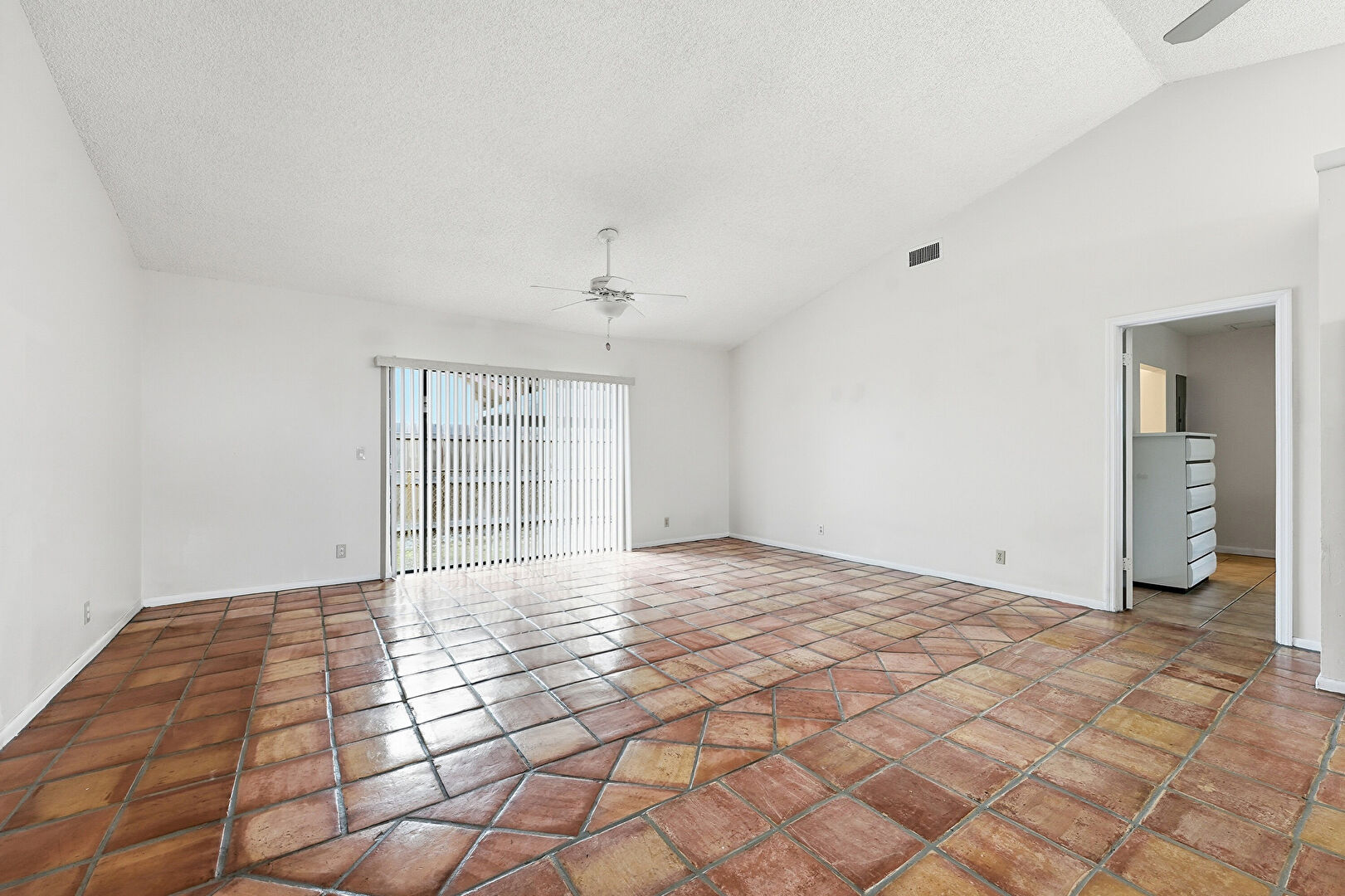 Baseboards Wall, Cathedral Ceiling, Ceiling Fan, Drywall, High Ceiling, Natural Light, Stone Finish Floor, Textured Ceiling, Tile Floor, Vaulted Ceiling, Vent, Ceiling Fan, Drywall, High Ceiling